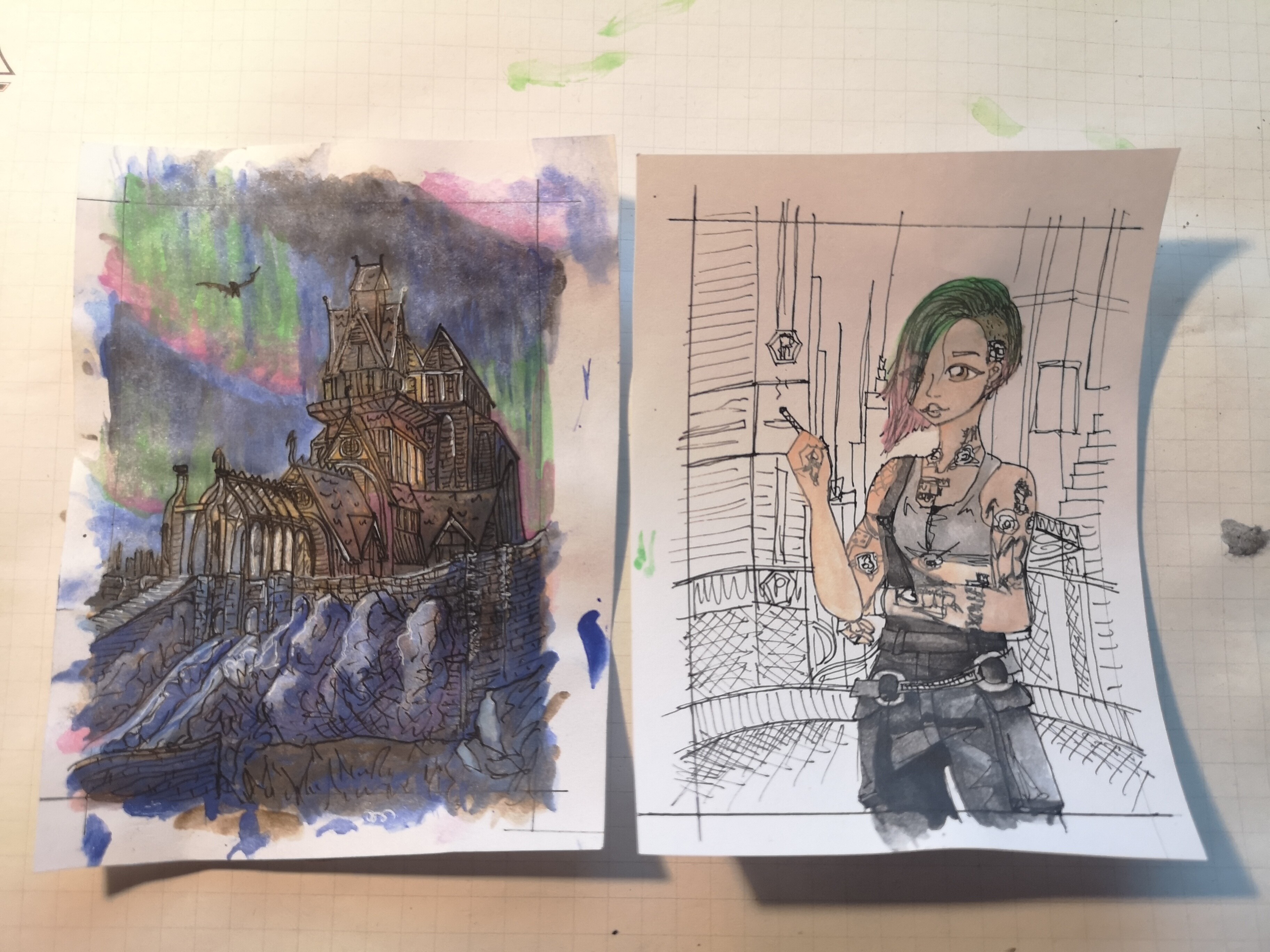 Erste Karte ist mit der Colo fertig und bei der zweiten sitze ich gerade an der Colo^^ ufff, die Colo ist mit den Farbschichten schon immer langwieriger, aber bekomme ich heute noch fertig. Der HG sind Hochhäuser und leuchtende Reklamen von Night City (trüber Tag), sind daweil nur Linien drinnen.
