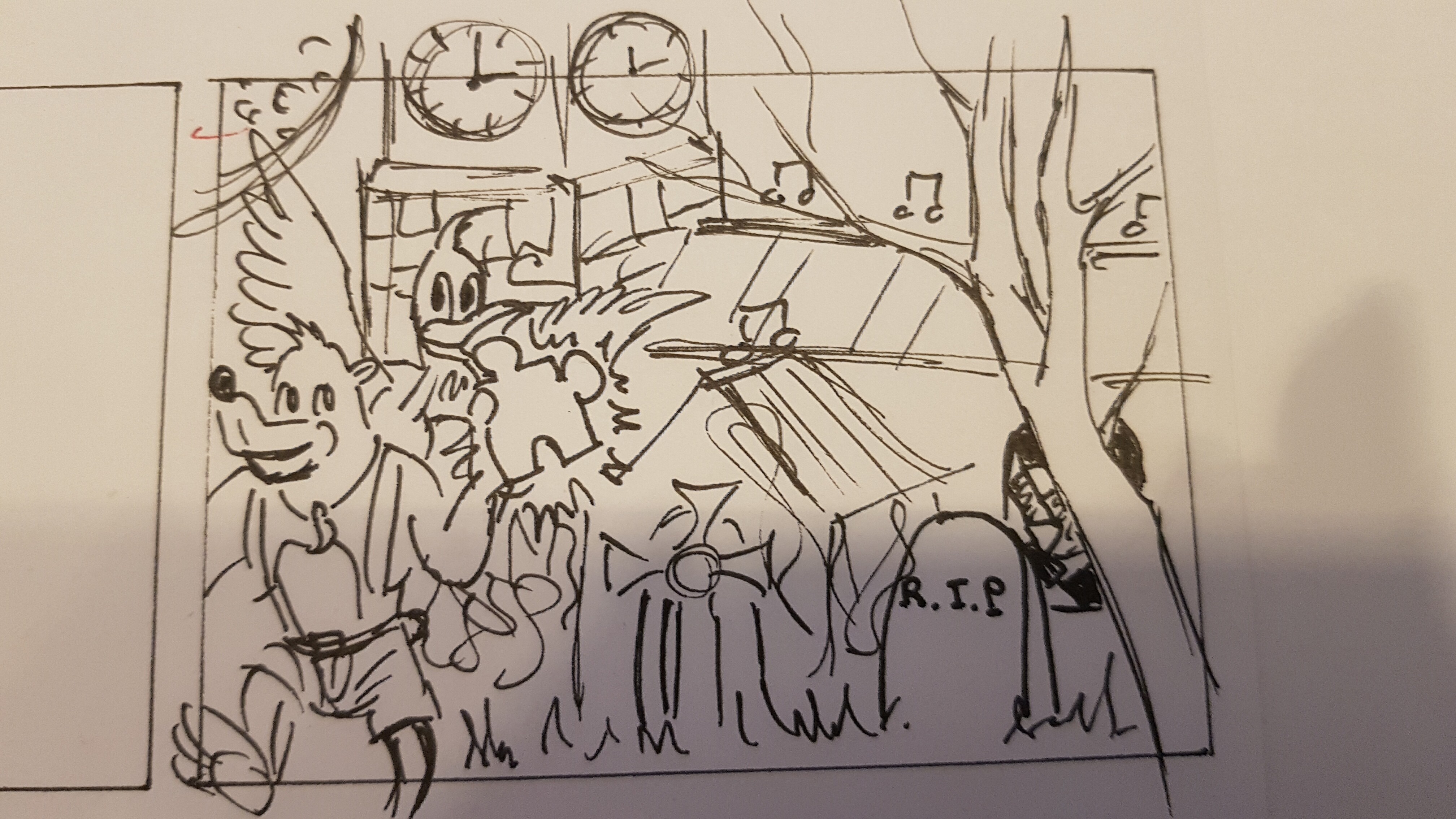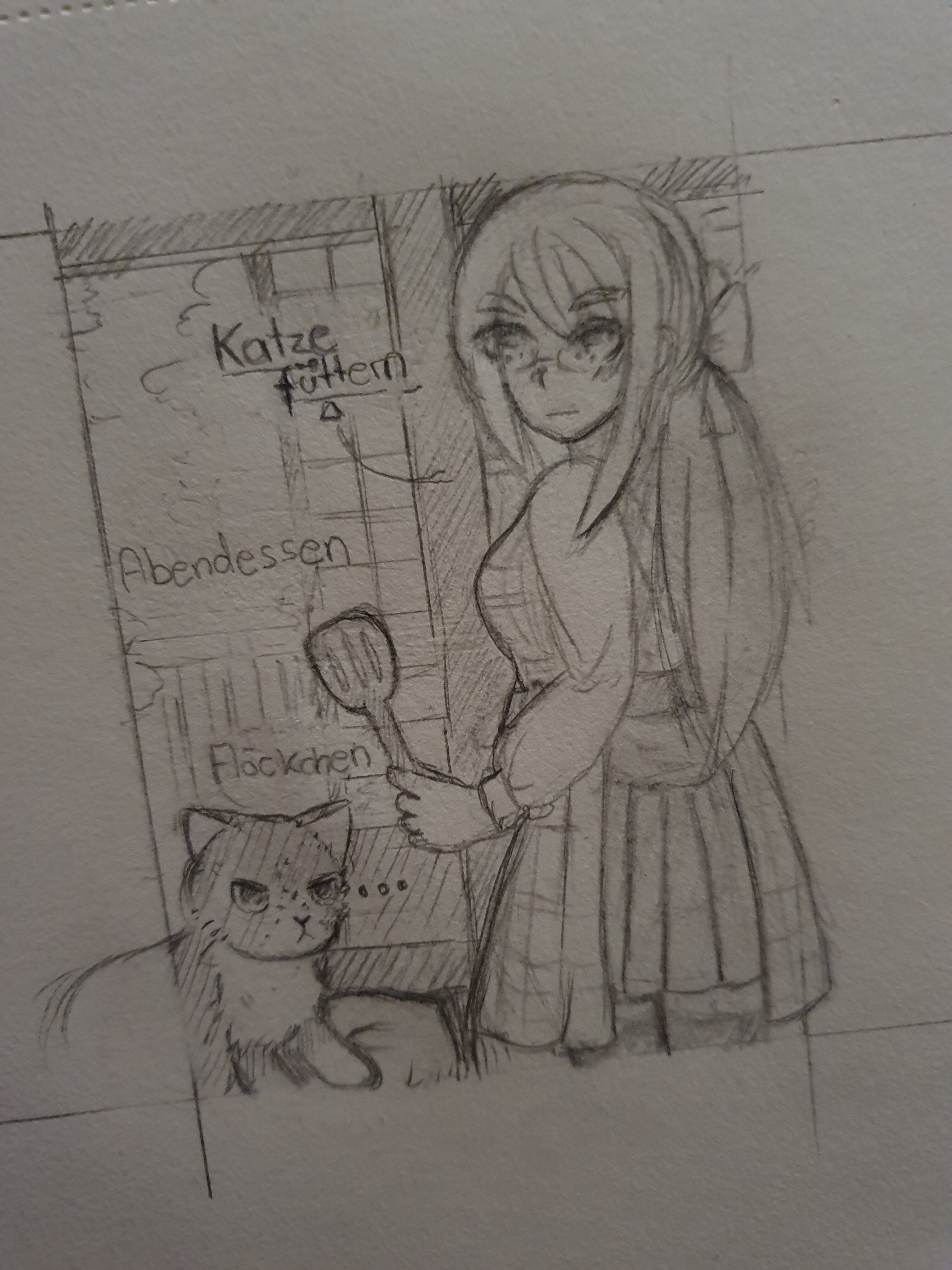 Hab jetzt auch mal die erste Skizze gemacht zu 13 Sentinels! Mein Plan ist die Spielemechanik im Story Modus einzubauen, bei der man “Nachdenken” kann bzw. bei bestimmten Punkten auch interagieren. Flöckchen ist der Name der Katze :3