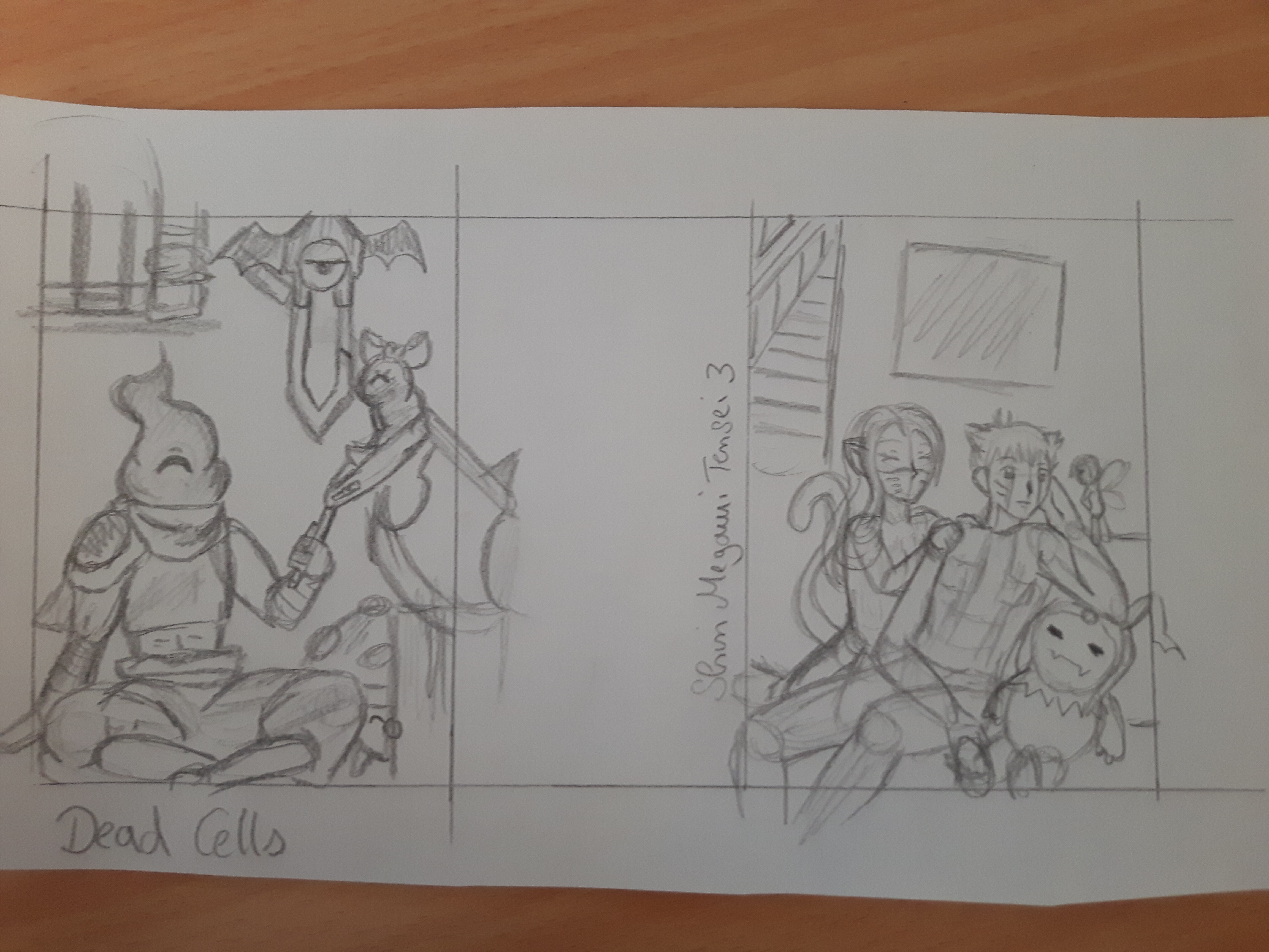Ansonsten hab ich hier mal 2 mögliche Skizzen (je nach dem wie meine Zeit es erlaubt…) für Dead Cells (nie ohne meine Pfanne!) und Shin Megami Tensei 3 (über das ich gestolpert bin in meiner Kiste, ganz wichtig natürlich mit Dante von Devil May Cry als Gastcharakter laut Videospielhülle xD)