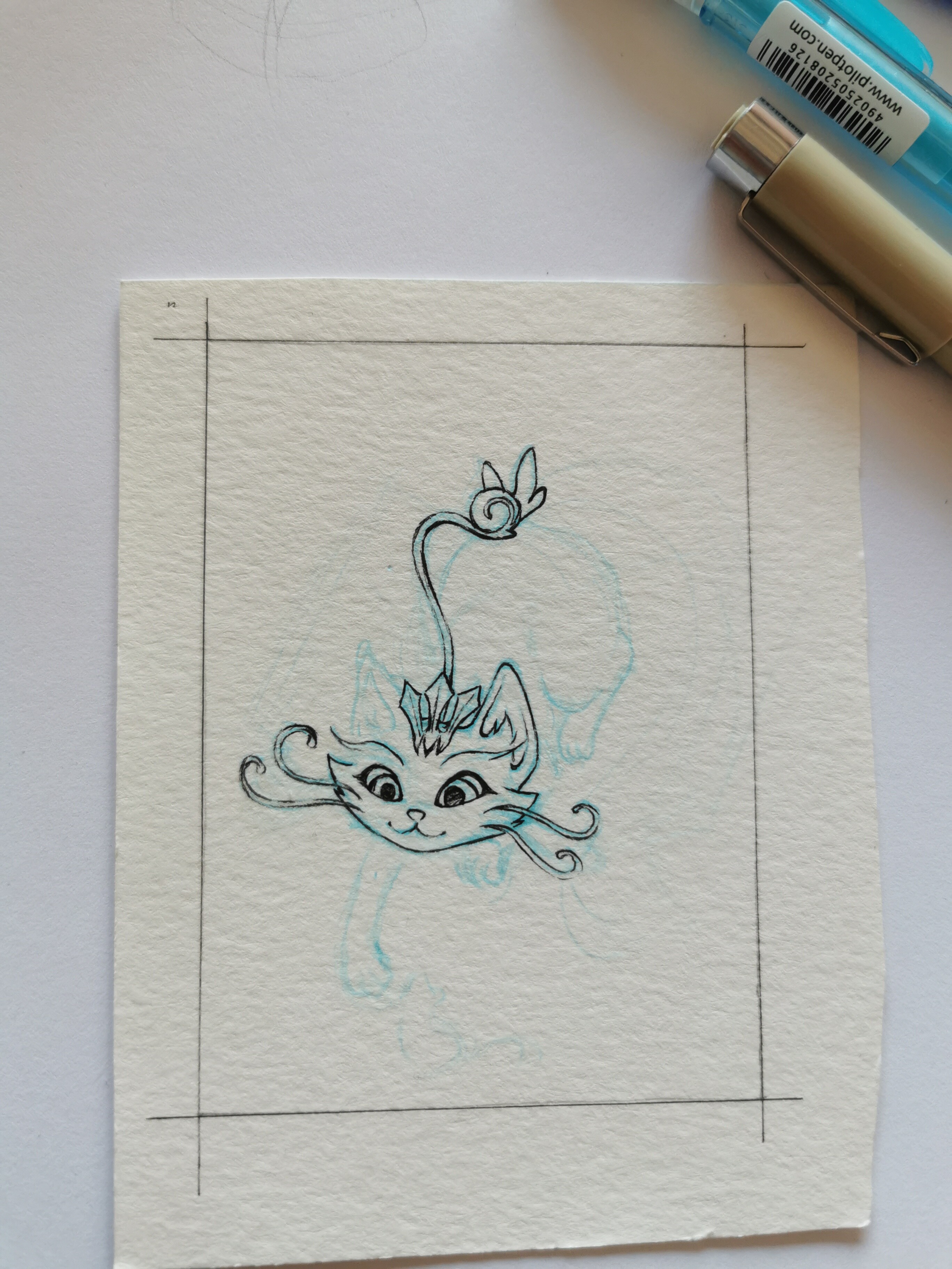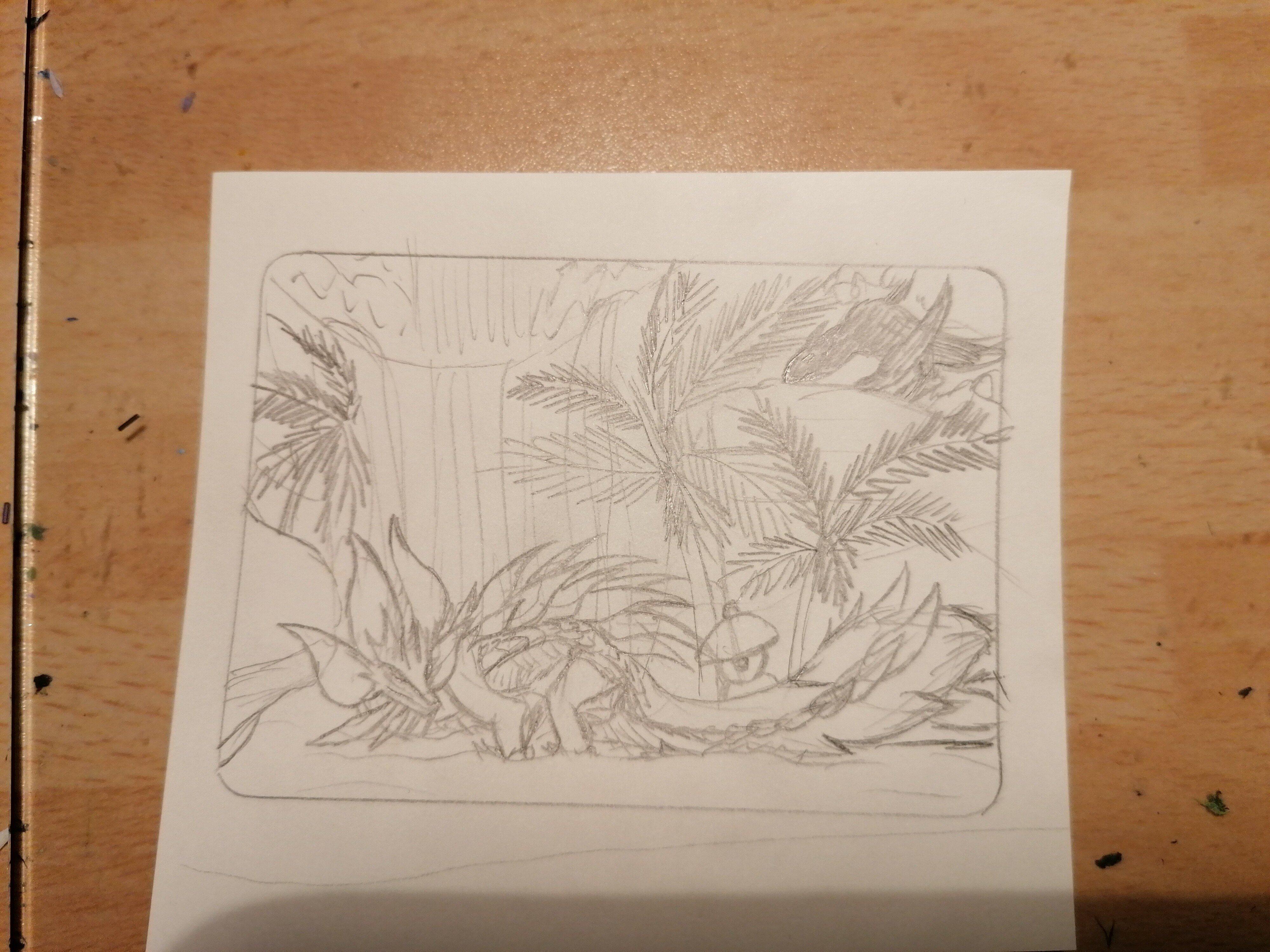 Hier ist meine dritte Skizze, ein Mizutsune aus Monster Hunter. Der Nargacuga im Hintergrund soll nur eine Siluette werden mit rot leuchtendem Auge damit er nicht zu arg vom Hauptmotiv ablenkt.