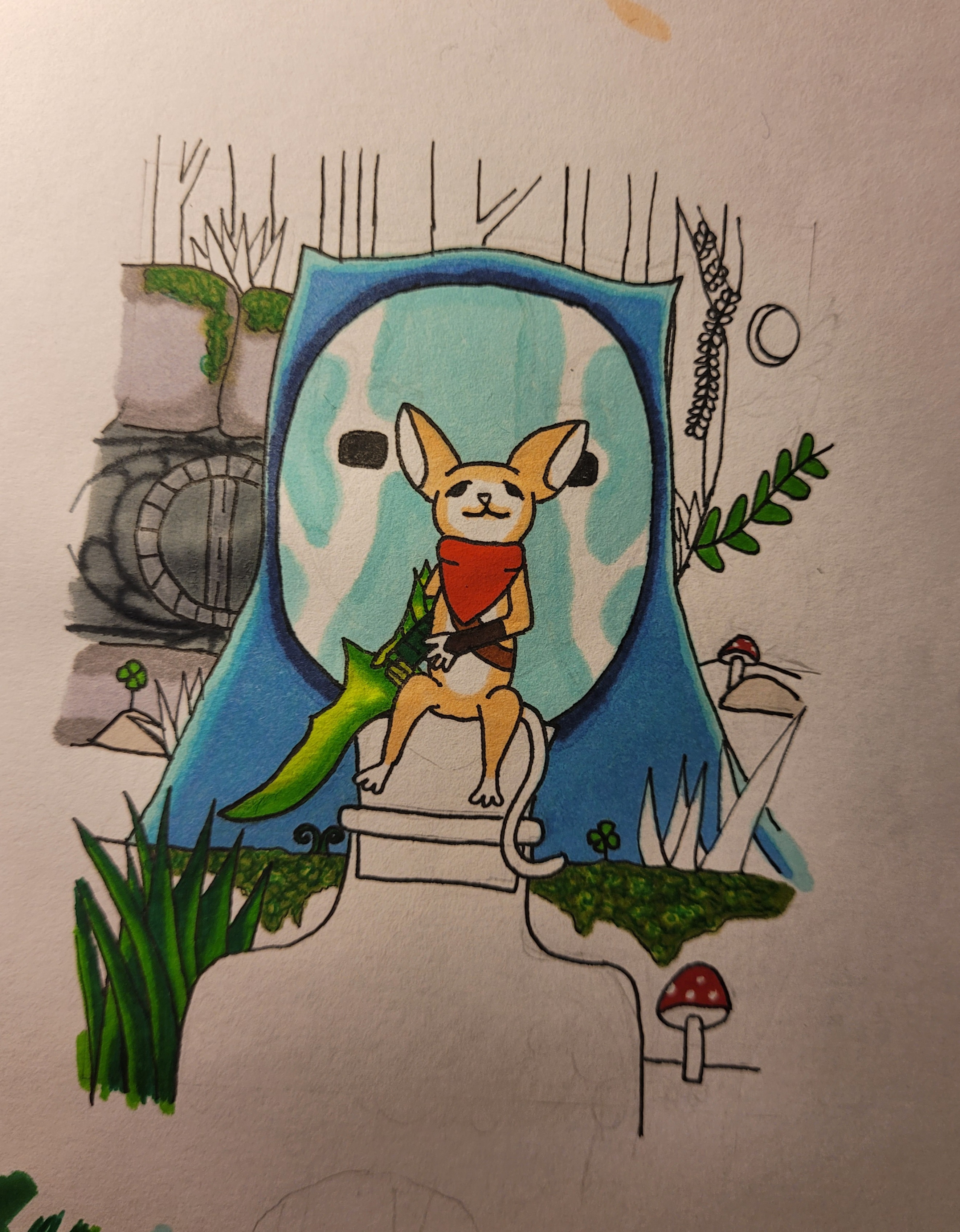 Auf dem Buch sitzt Yuumi schon, leider konnte man auf der leichten skizze das jetzt nicht sehen! Ich bin gerade am HIntergrund dran und orientiere mich da an dem Splashart un dversuche davon ein paar elemente zu nutzen! (Also den Kessel über dem Feuer, Bücher… Sobald die LInes fertig sind, gibt es davon natürlich auch ein Foto!