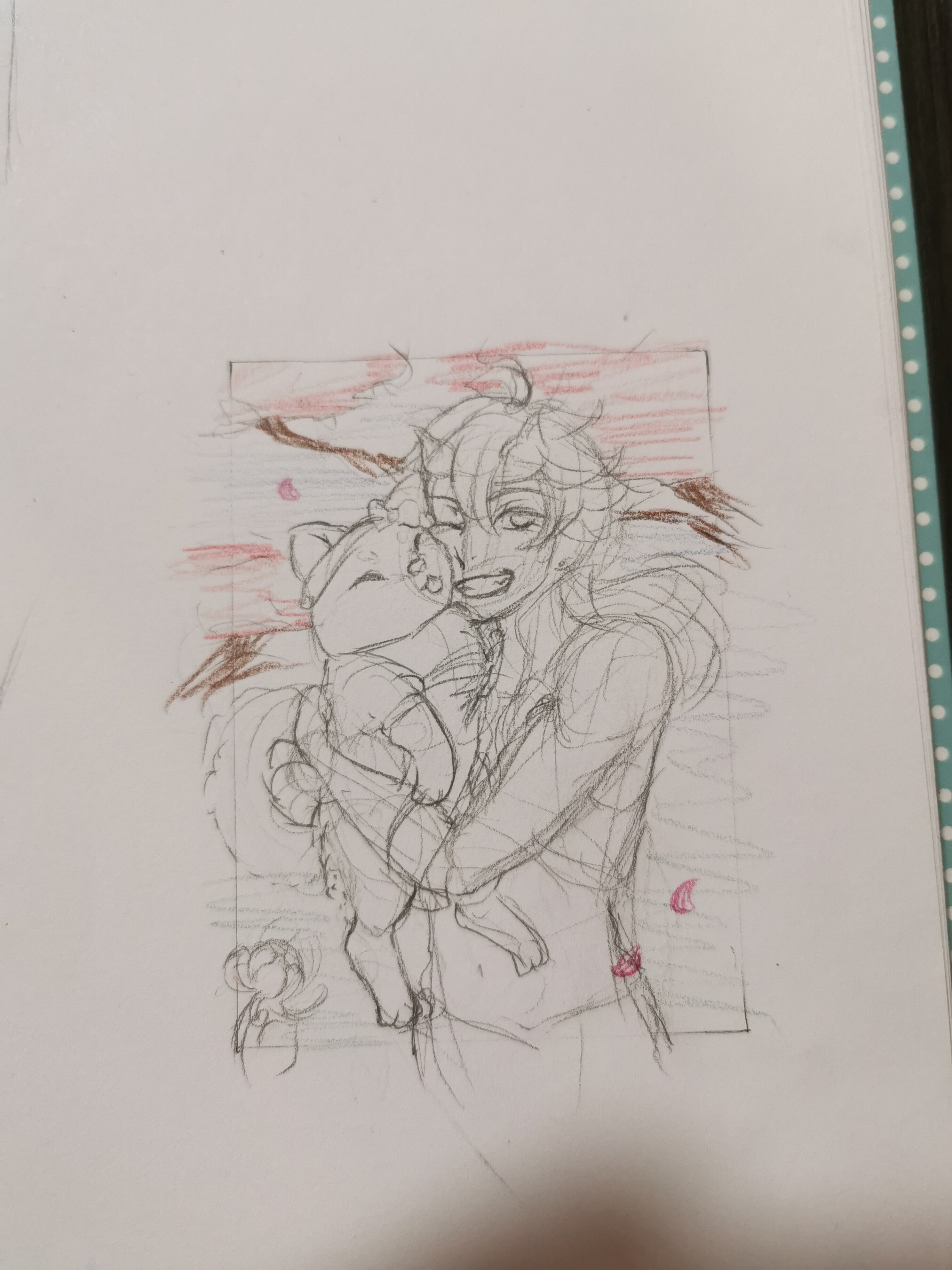 Ich wollte Thoma und Taroumaru aus Genshin Impact zeichnen und im Hintergrund eine Inazuma typische Landschaft mit kirschbäumen und Seidenblumen.