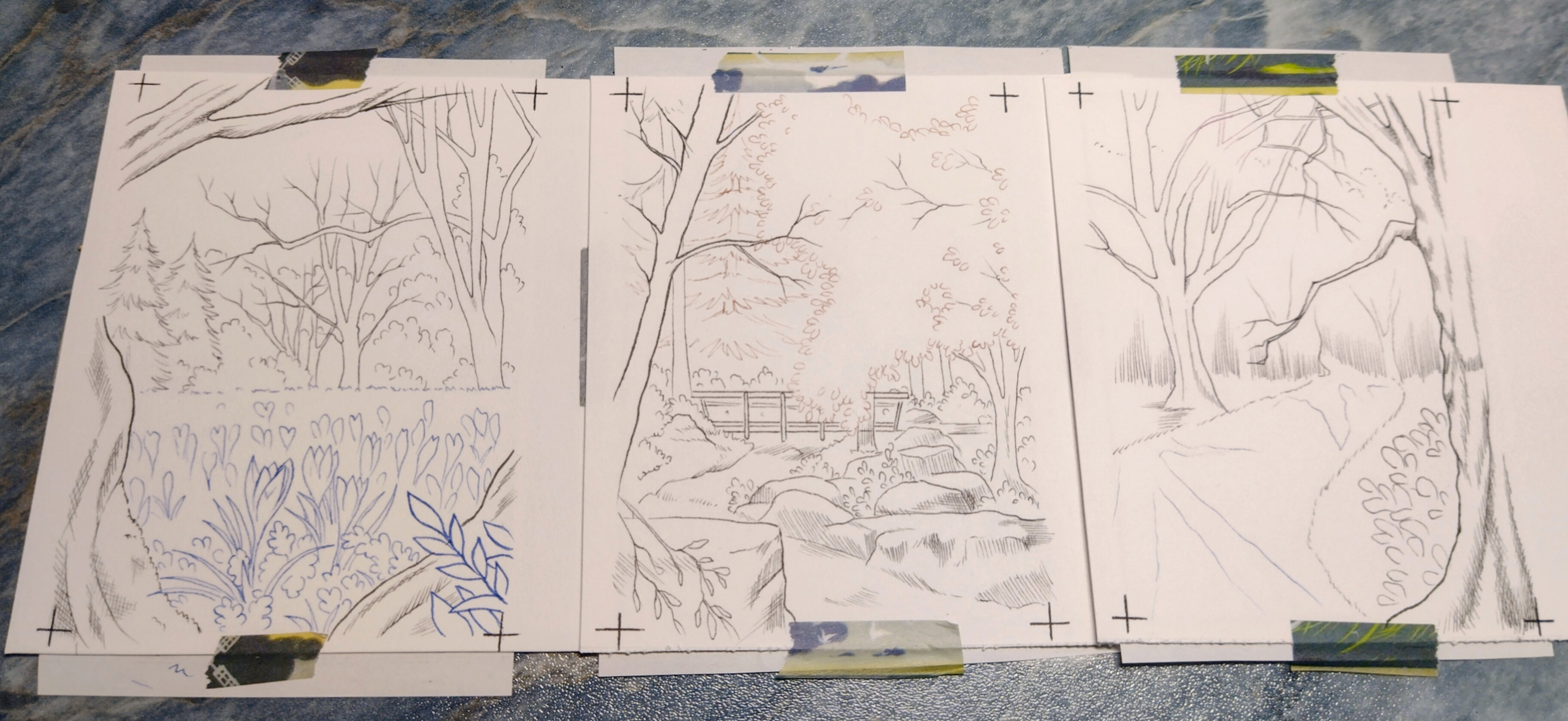 - Ein winterlicher Waldweg, von dem man hier zwar noch nicht viel erahnen kann, aber wo ich viel mit Gegenlicht und Schatten spielen will. (Da kommen auch noch mehr BĂ€ume hin, aber die werde ich dann mit dem Pinsel dort einbringen, wo aktuell nur Schraffuren sind :3).