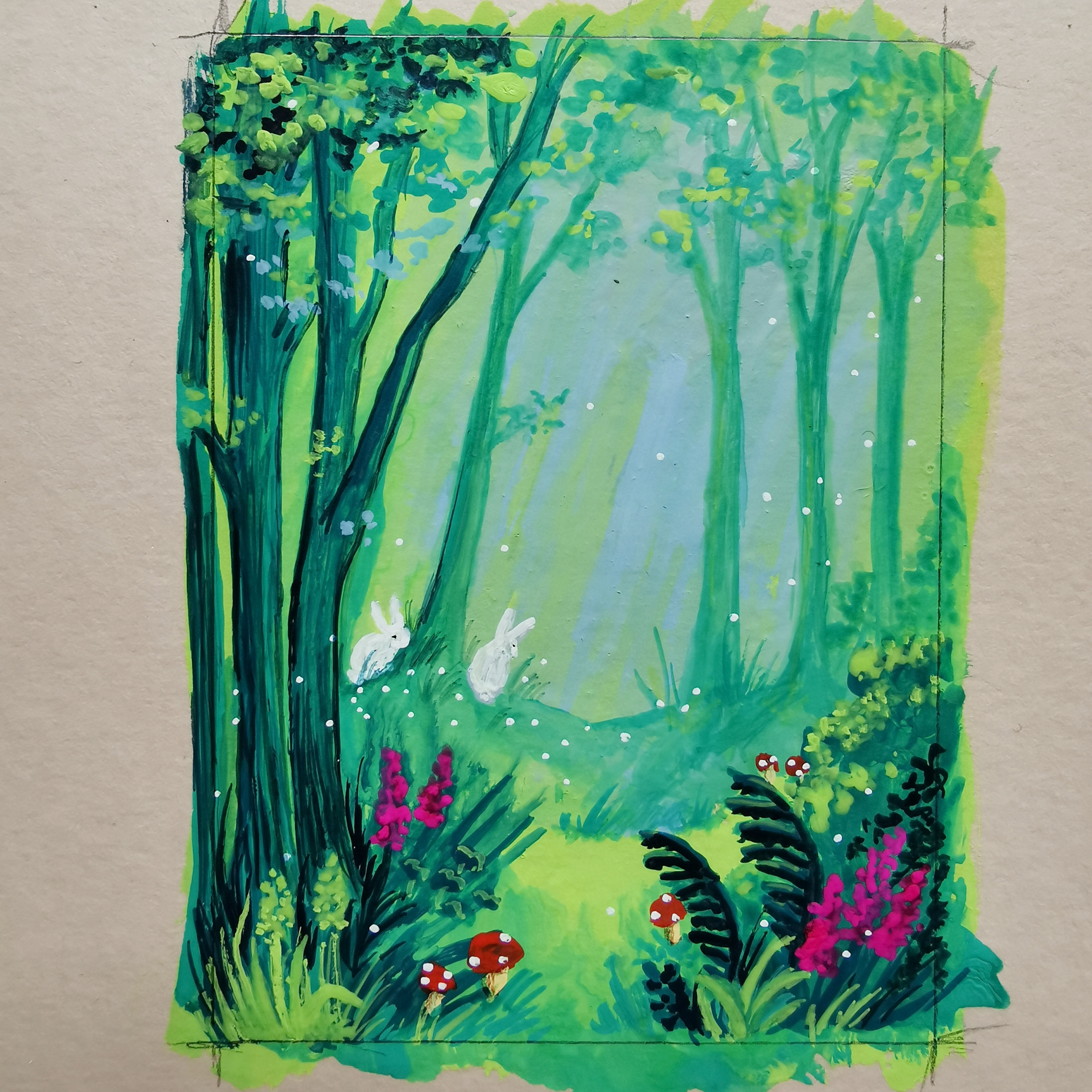 HÀtte hier auch eine erste Skizze. Da Fantasy-Motive zugelassen wÀren, musste ich irgendwie an einen magischen Pilzwald denken mit leuchtenden Pilzen. Geht das noch als Wald durch?