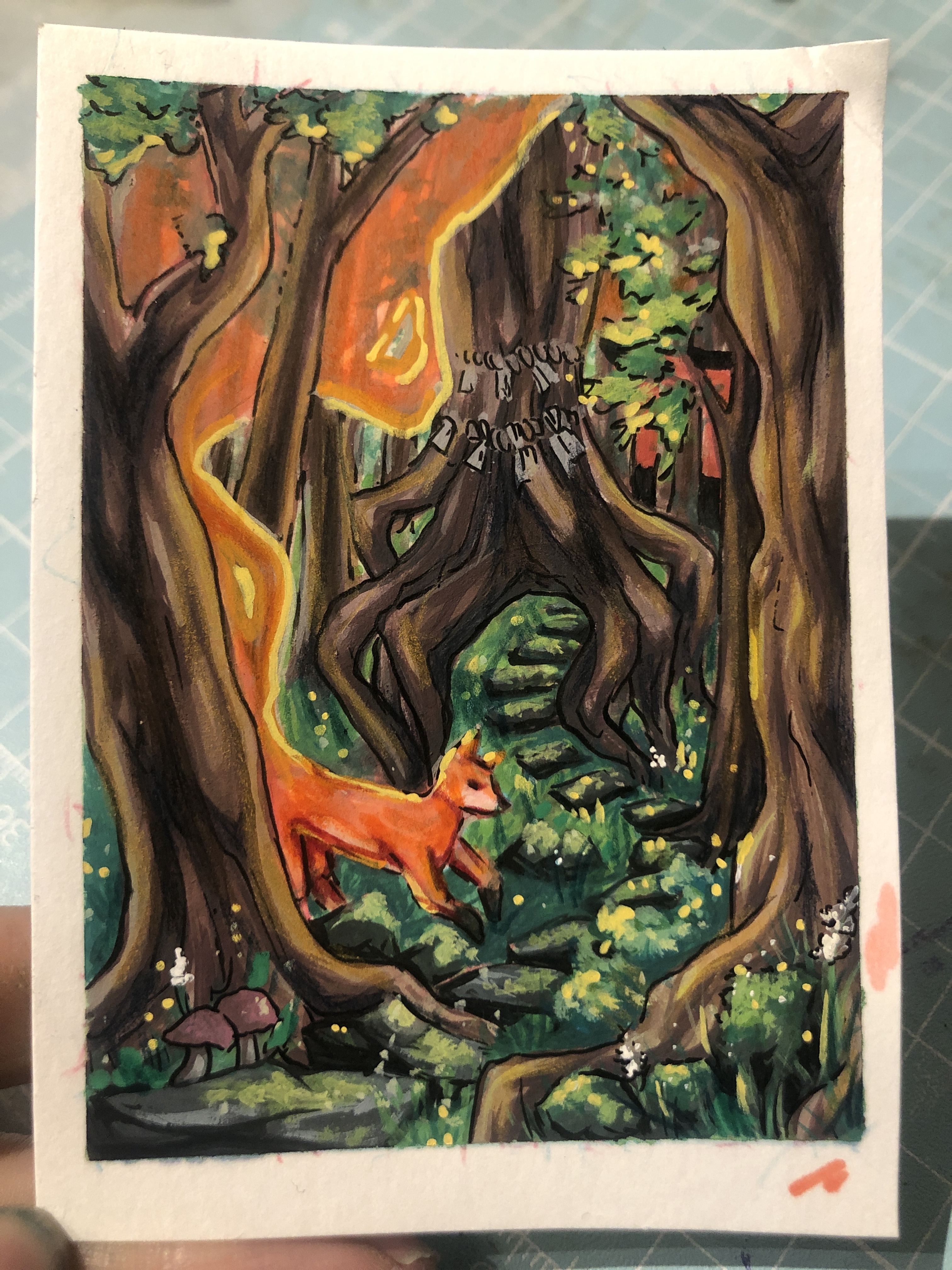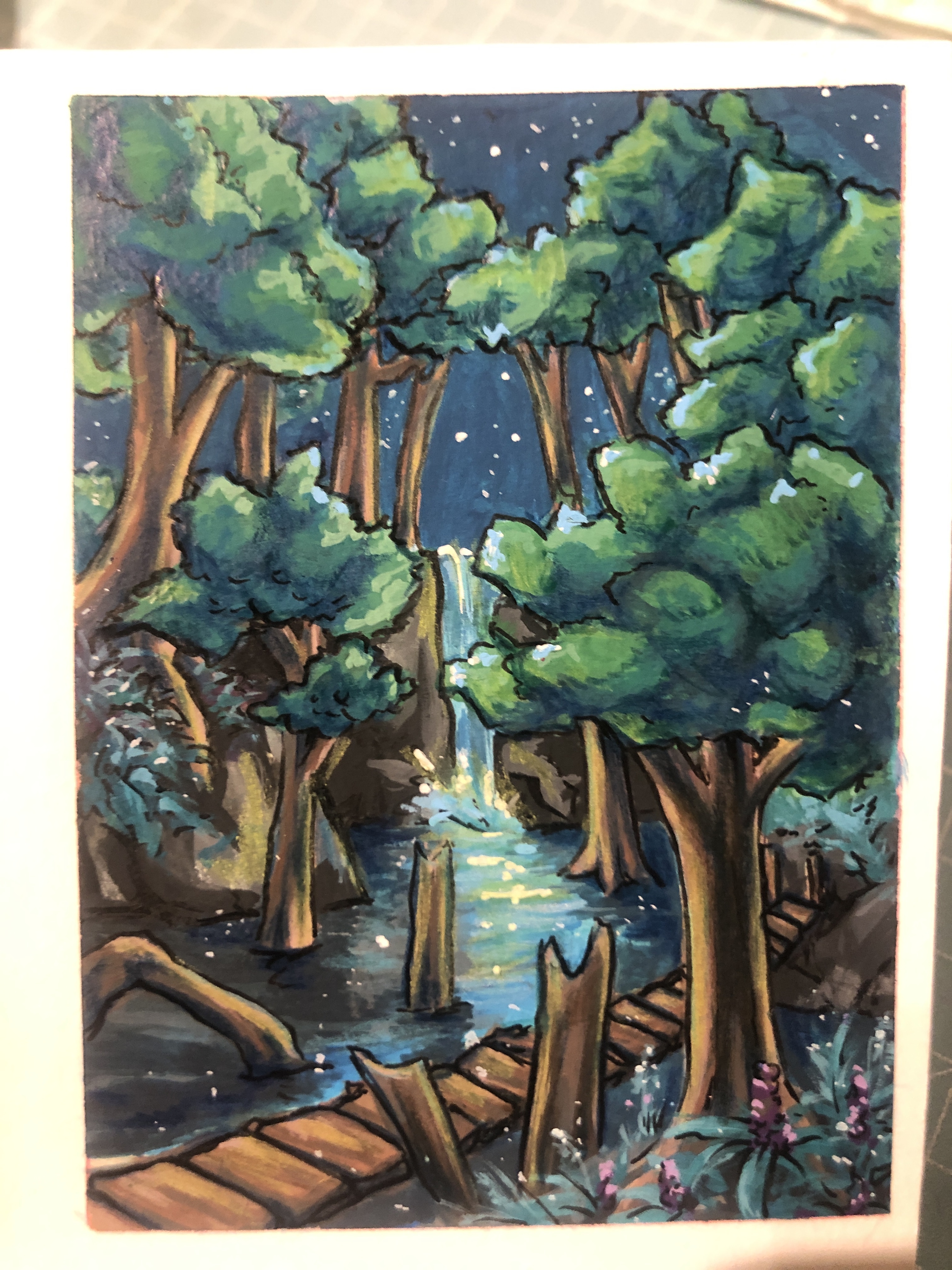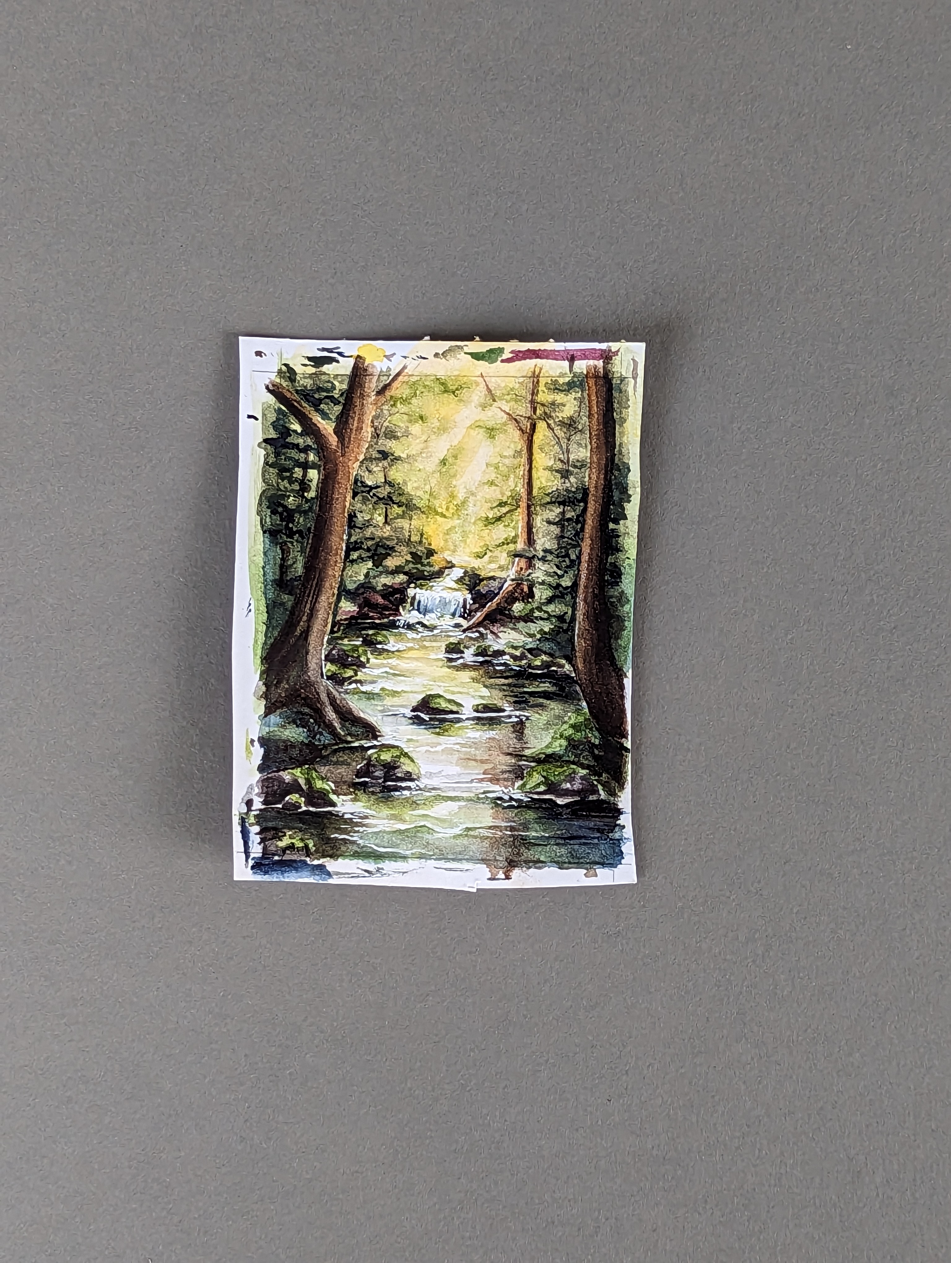 Und ich hätte vielleicht noch ein drittes Kärtchen ^^° Hatte mir heute nochmal eine meiner Skizzen vorgenommen, diesmal mit Tusche und Aquarell (warum auch einfach bei einer Technik bleiben, wäre ja vielleicht leichter :'D). Wäre der Wald da genug im Fokus? (Falls nicht, zwei Karten habe ich ja auf jeden Fall, dann würde ich dabei bleiben :))