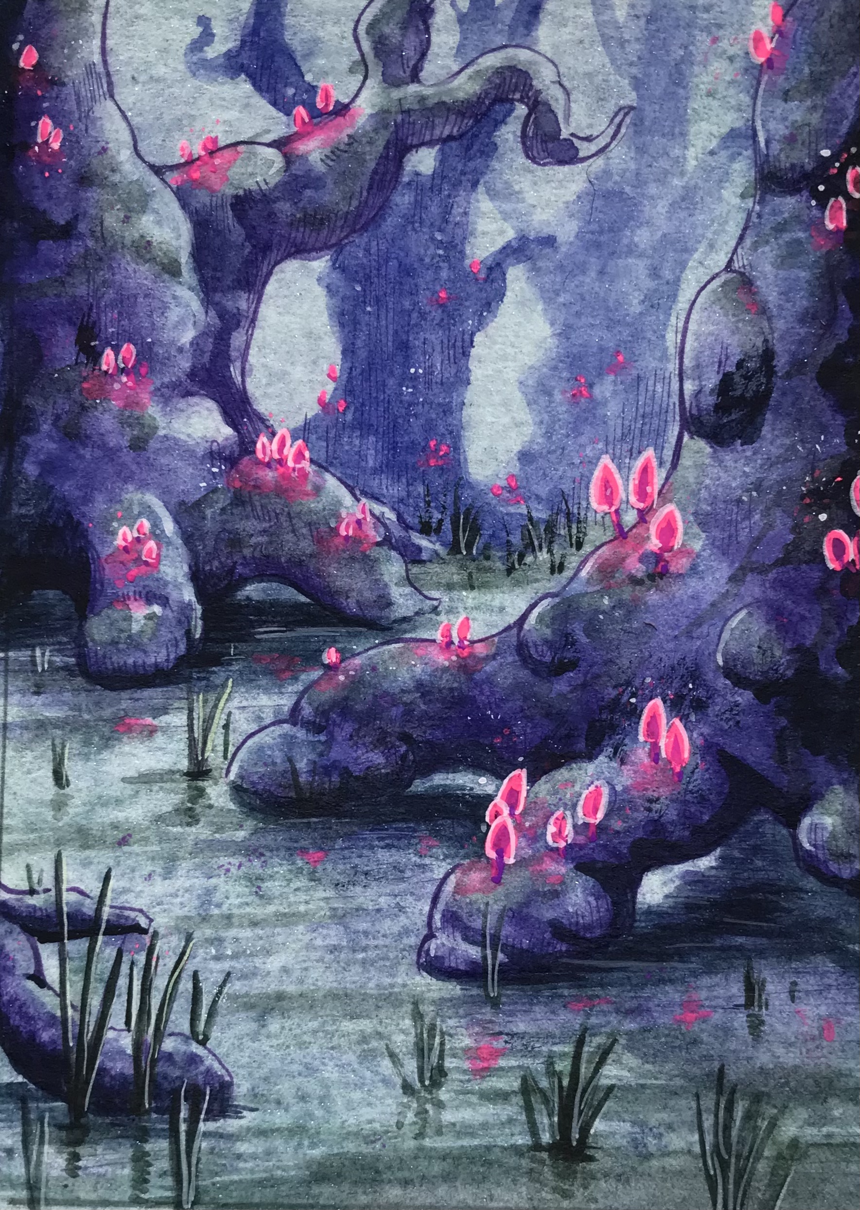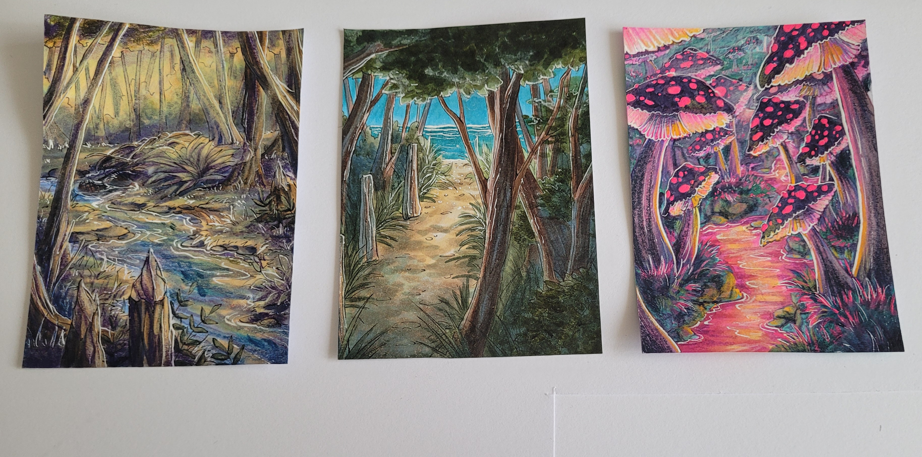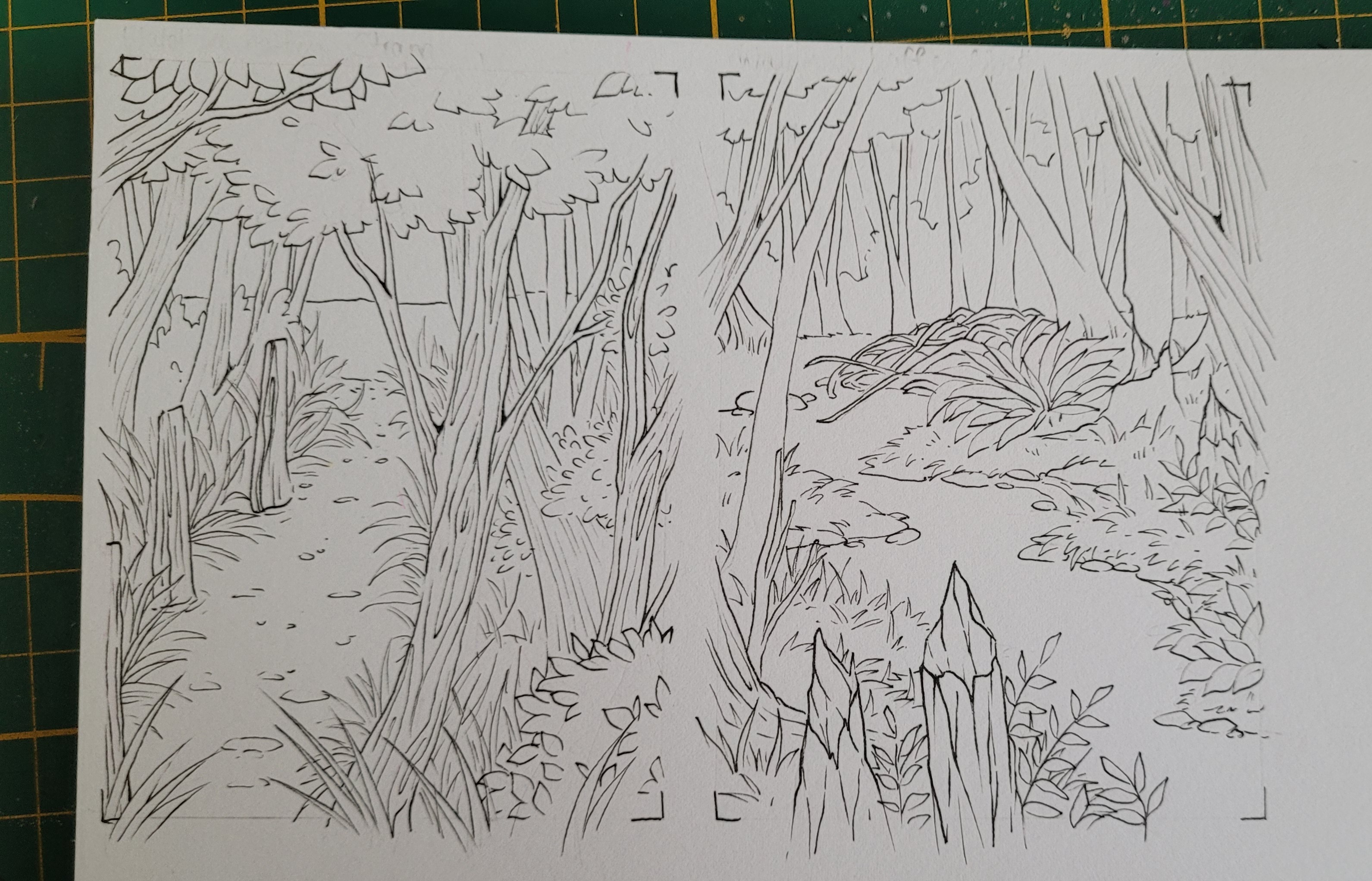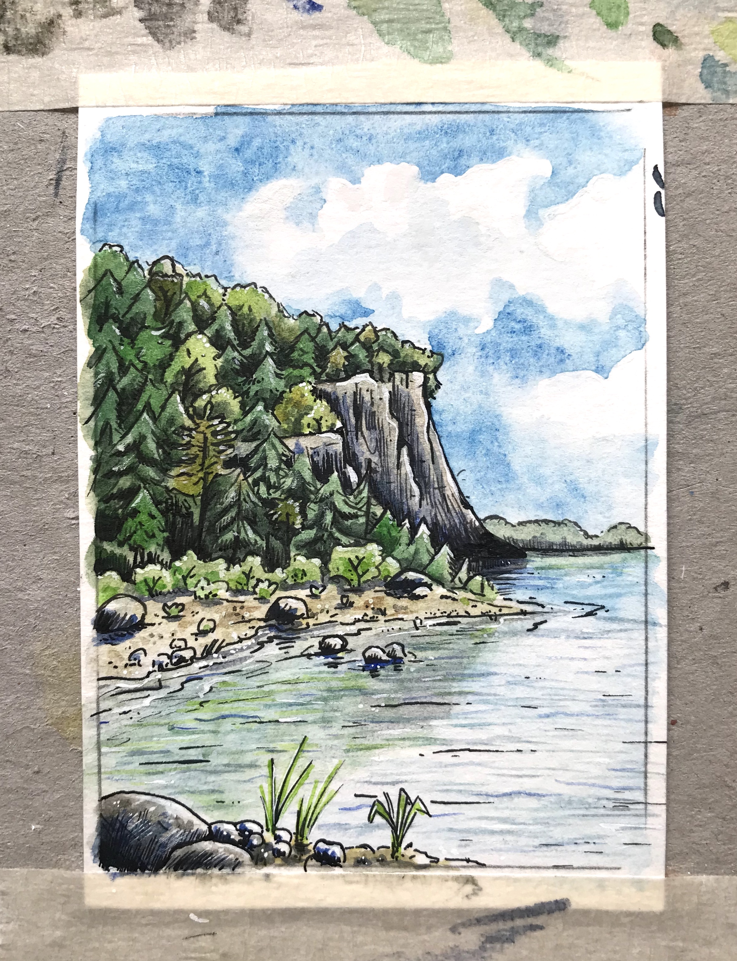 Und ich hätte vielleicht noch ein drittes Kärtchen ^^° Hatte mir heute nochmal eine meiner Skizzen vorgenommen, diesmal mit Tusche und Aquarell (warum auch einfach bei einer Technik bleiben, wäre ja vielleicht leichter :'D). Wäre der Wald da genug im Fokus? (Falls nicht, zwei Karten habe ich ja auf jeden Fall, dann würde ich dabei bleiben :))
