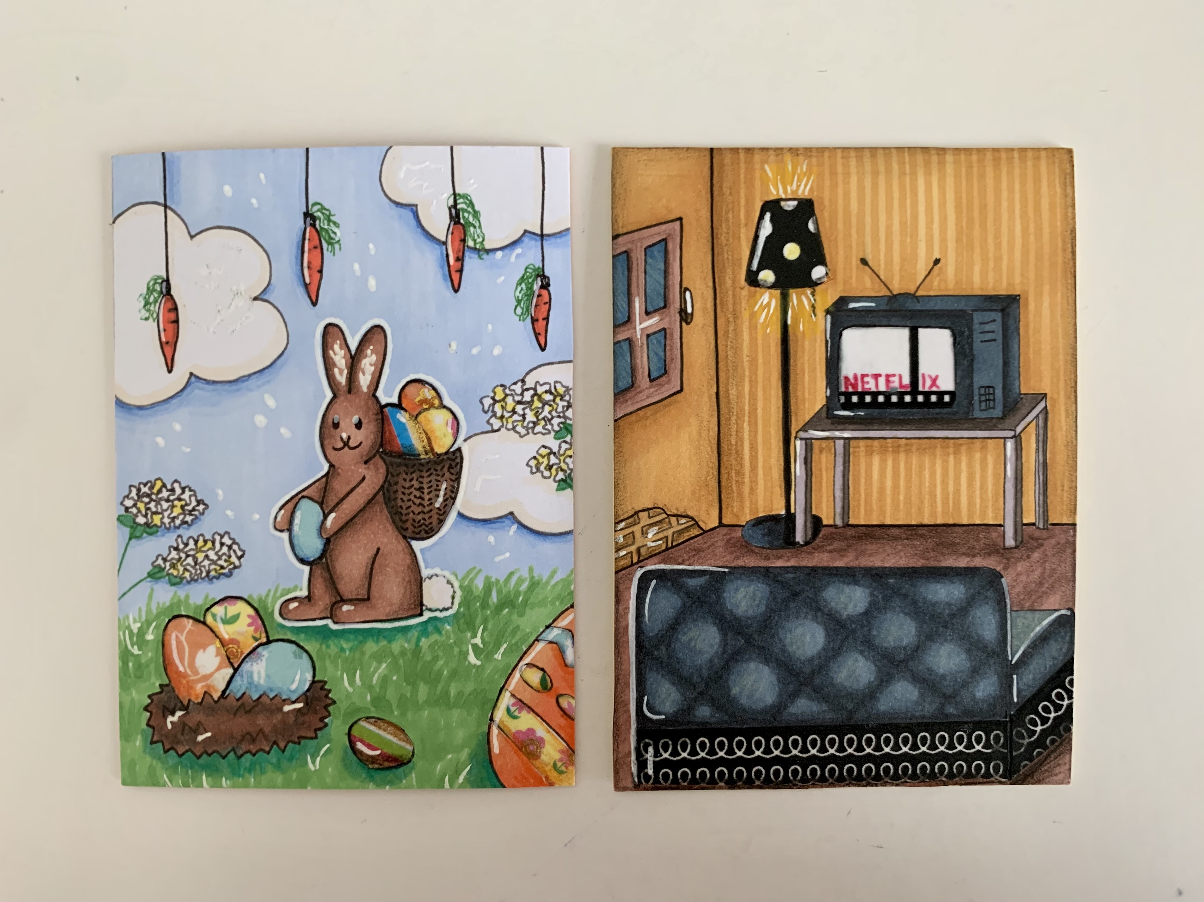 Einmal passend zur Osterzeit, viel bunt. Und das andere ein eher ruhigeres Bild.