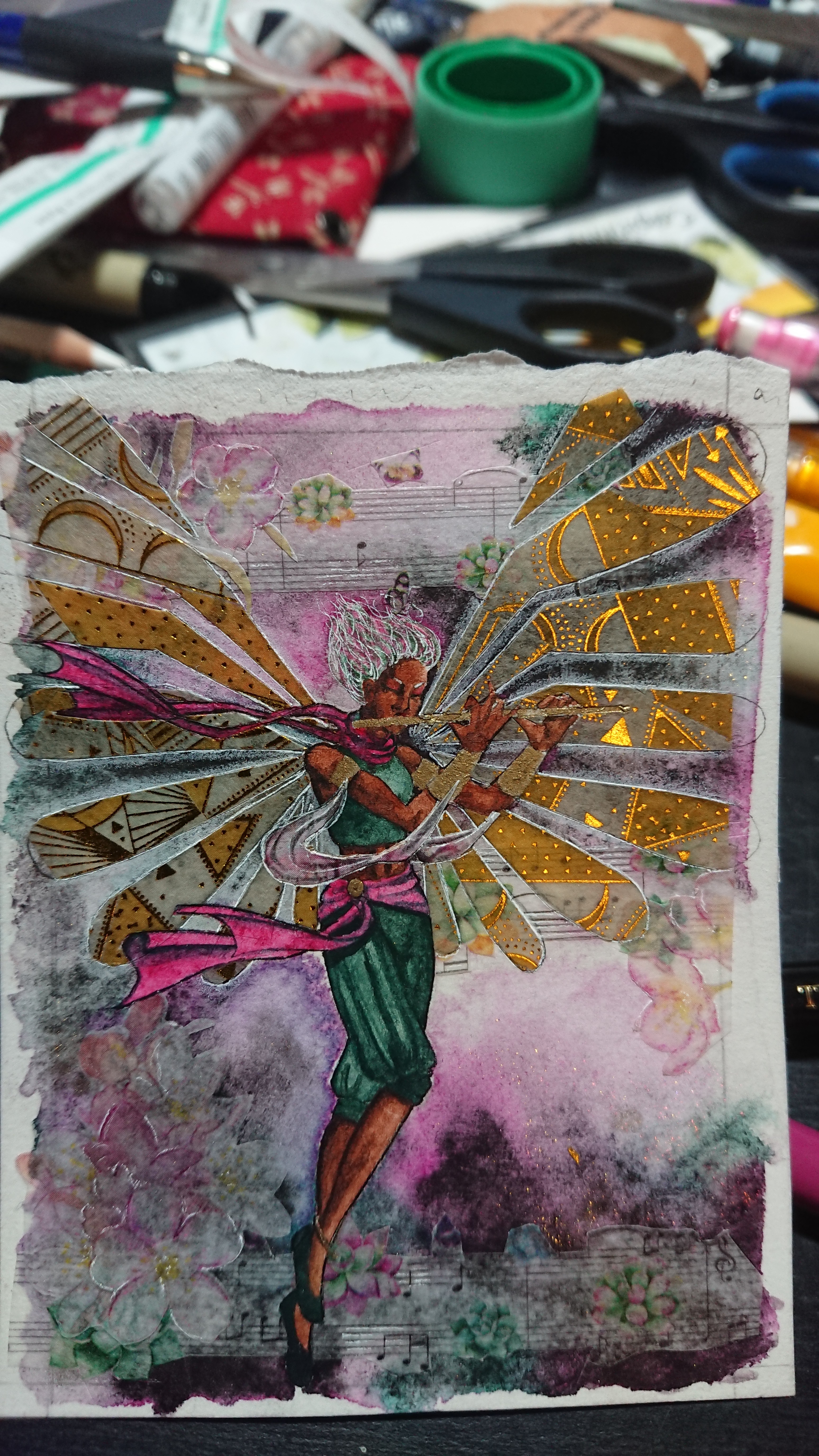 Der Gesamteffekt kann sich durchaus sehen lassen das stimmt. Die Washiflügel im Vordergrund werden besonders betont, aber die Washis im Hintergrund gehen um so mehr verloren. Vielleicht kannst du hier und da noch ein Akzent setzen, sodass du vielleicht ein Spiel von Materialität und Transparenz hast? Z.B. eine Blume die deutlich erkennbar ist und hinter hier die transparenten (nur in Bezug auf die hinteren Washis)