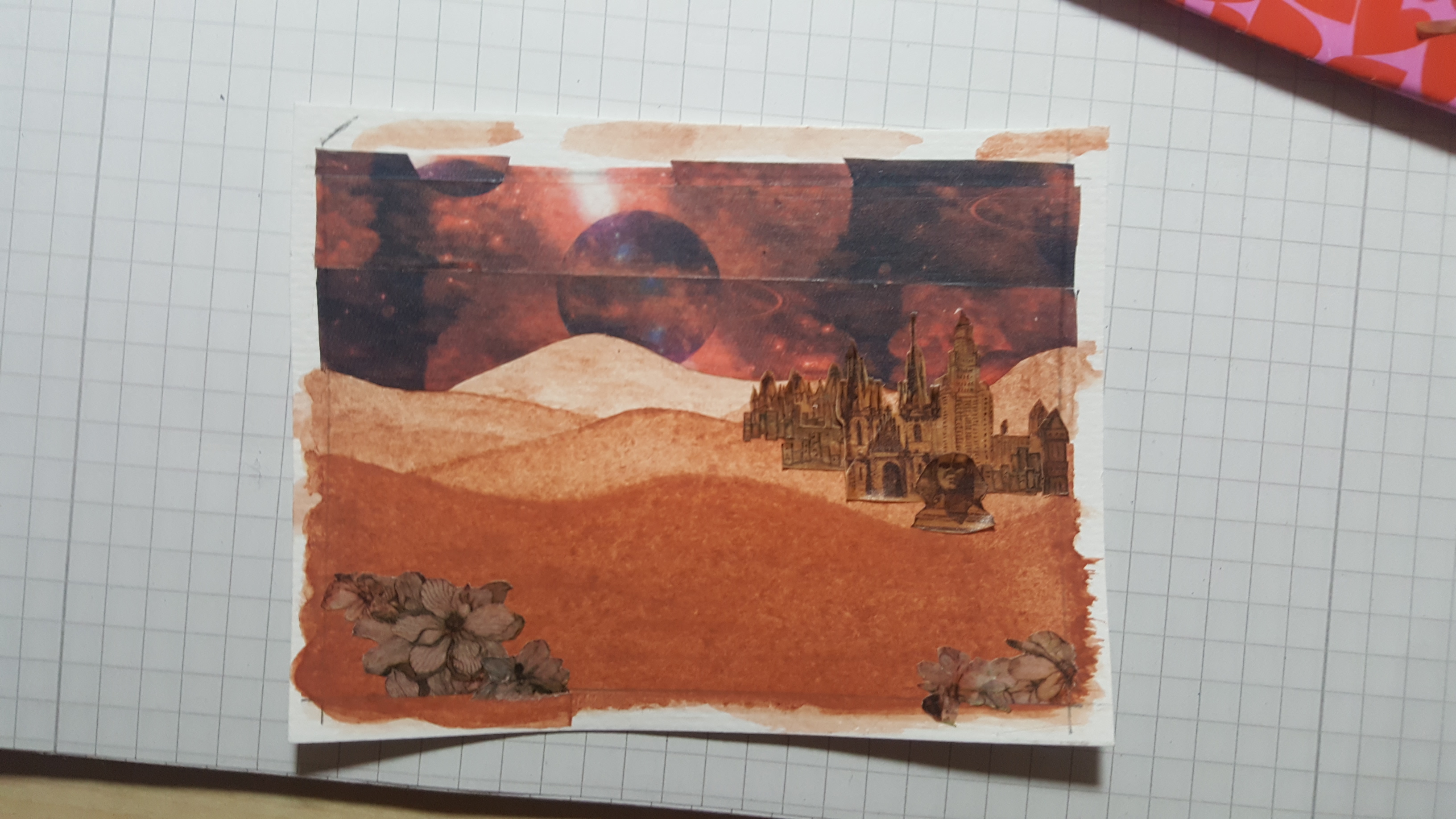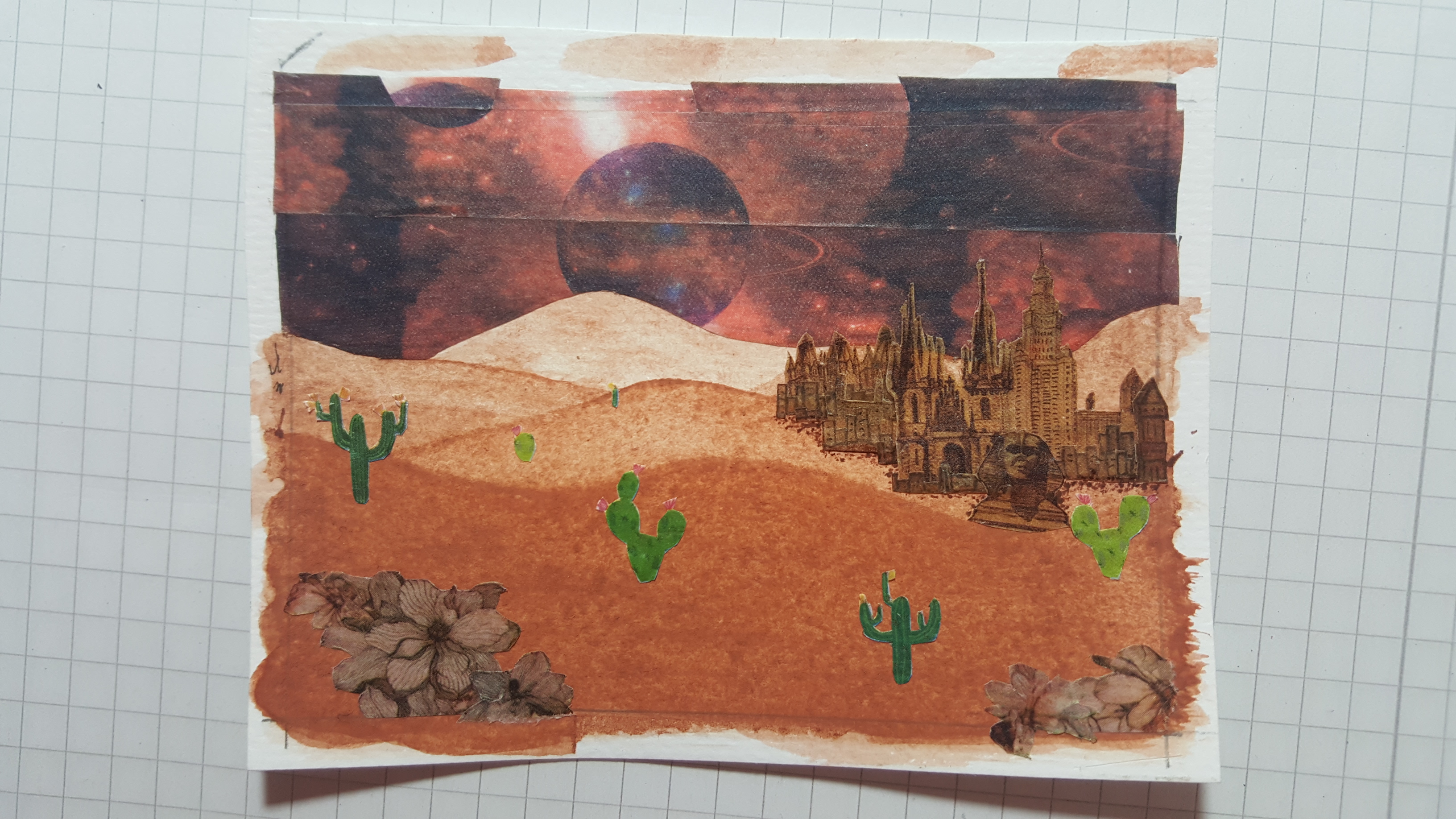 Das ist ein nicht-irdischer Planet mit einer Stadt und Pflanzen etc. Das Washi Tape wird natürlich am Ende noch sicher fixiert, ich arbeite noch an der genauen Komposition. Zudem bekommt die Planetoberfläche noch mehr Struktur und vielleicht auch mehr Pflanzen.