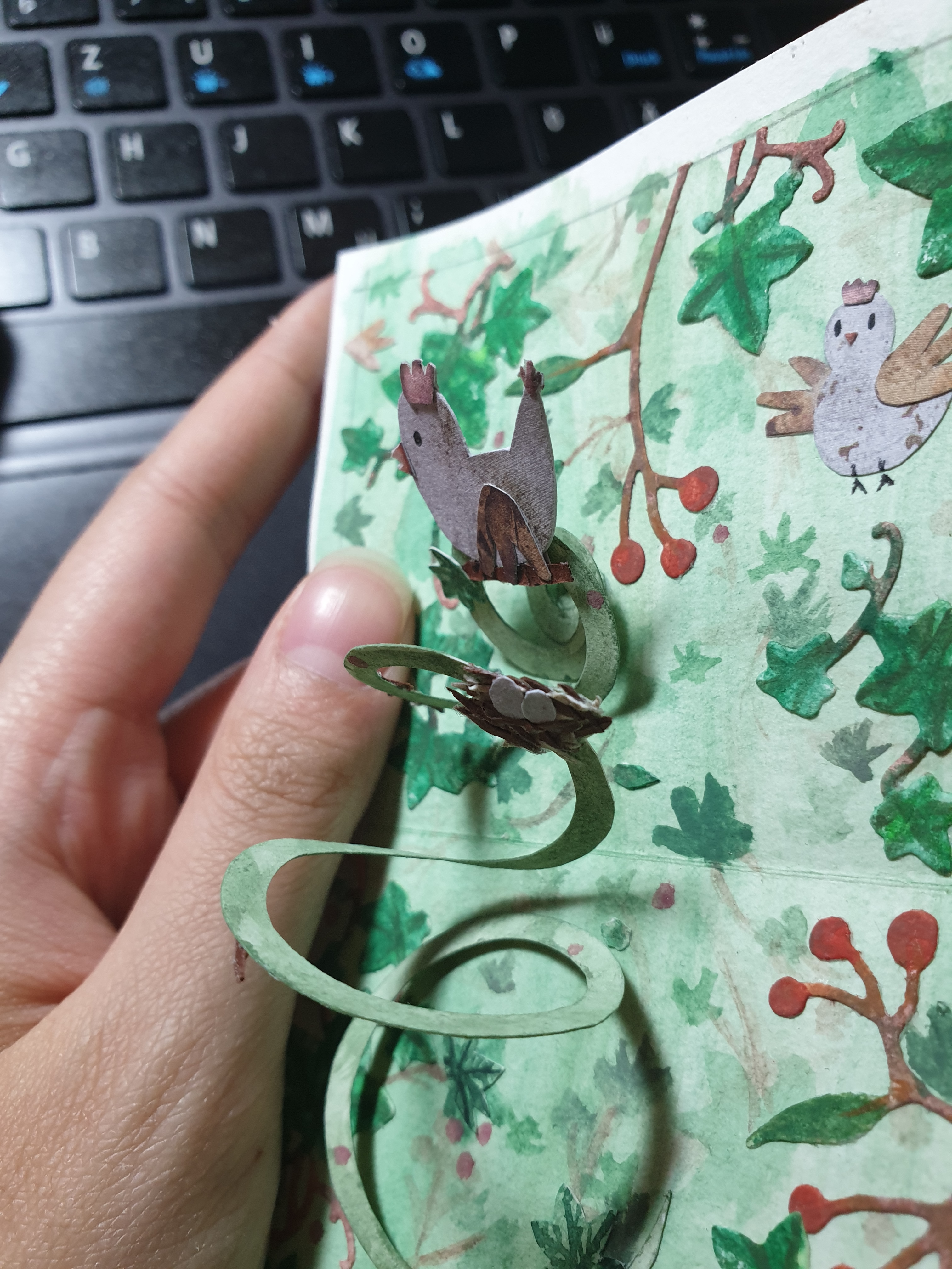 @Up-Quark Die Idee würde ich so zulassen. Die Vögelchen sind whimsical und somit zulässig, und Pop-Up-Karten sind ne Menge Arbeit. Supi! Was die Vorderseite angeht, würde ich sagen, sie sollte farblich und thematisch mit dem Innenraum harmonieren, ich würde evtl. einen solchen Vogel in größer draufmachen… bei der Bastelarbeit, die in der Karte steckt, bin ich dann aber weniger pissig, was einen detaillierten Hintergrund angeht - der Star der Karte ist ja das Innenleben.