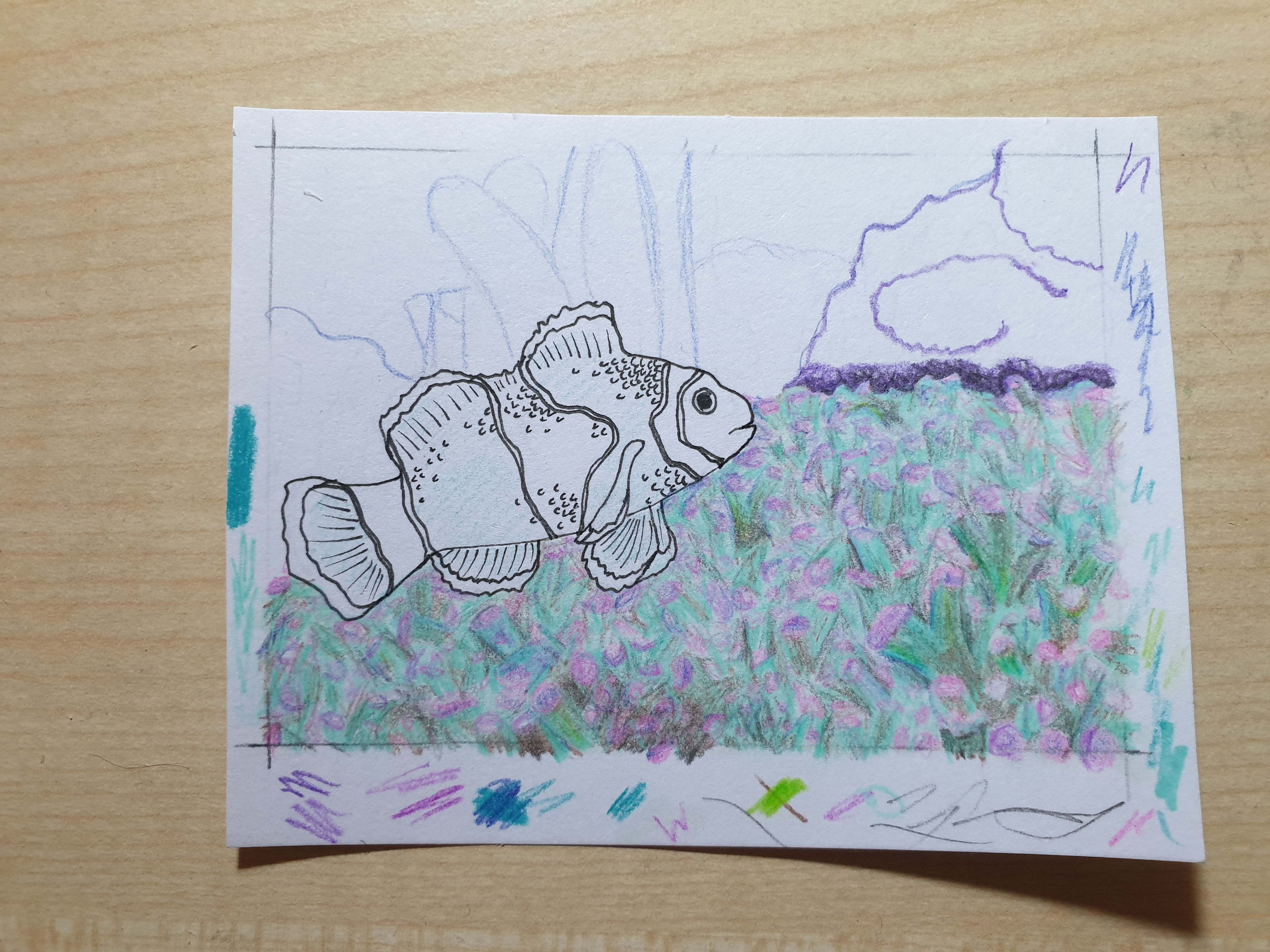 Als Referenz dienen Bilder unseres eigenen Aquariums, für den Anemonenfisch sah ich mir aber auch im Internet Bilder an. Er wird wahrsch. in der Farbe daneben (das Türkis) gefärbt), aber das steht noch offen.