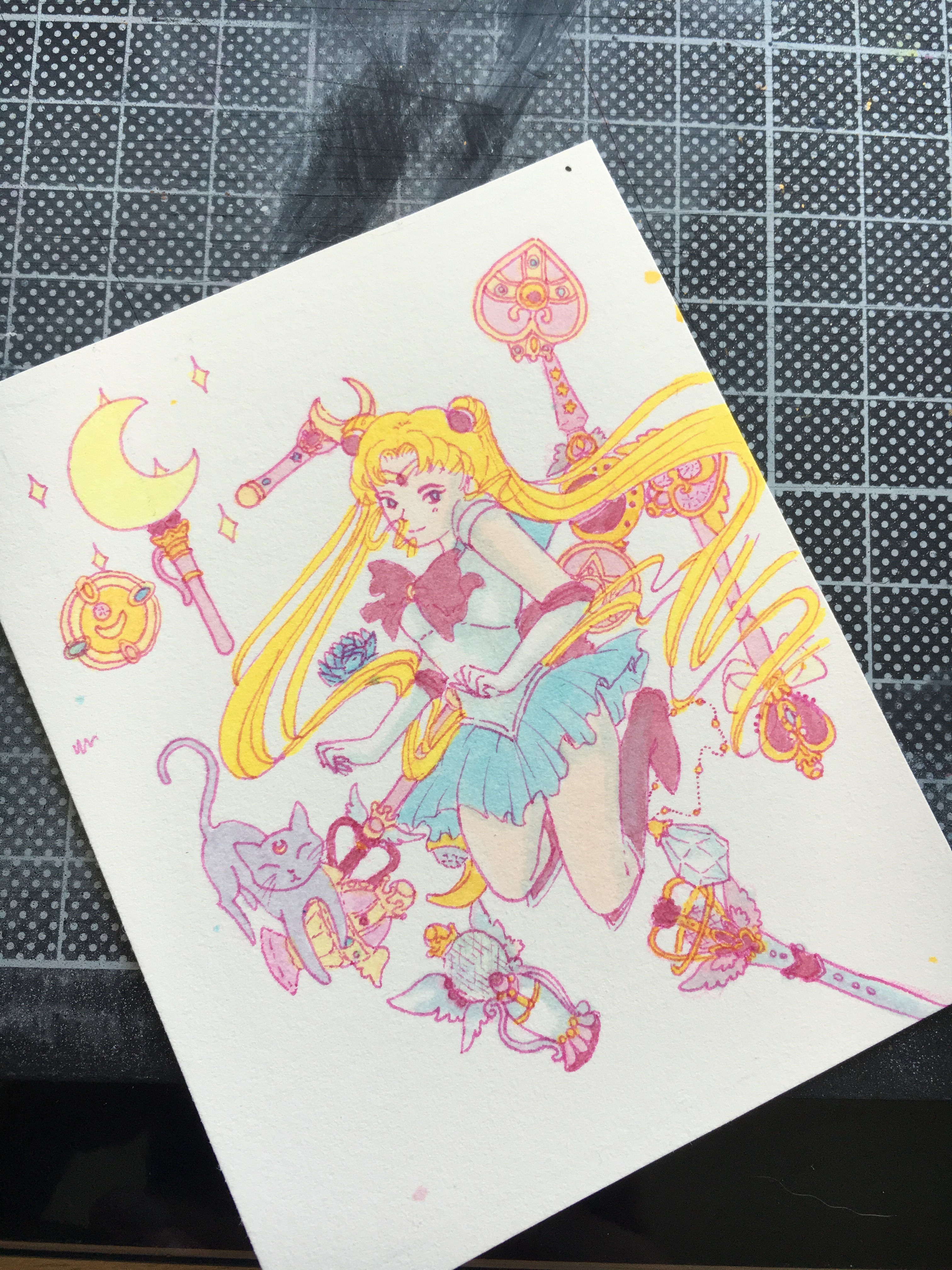 Leider ist das Motiv an sich noch etwas leer. An Wimmelzeug/personen ist da noch Platz für viel viel mehr ;-) Du könntest das noch ins Motiv einbauen, oder ne Idee bei dem Thema wären auch Bastelkarten, z.B. Schüttelelemente zum Wimmeln (also erkennbare Sachen nicht nur so Perlen oder Glitzer), oder auch klappbare Karten, wo man rundum Zeug hat, was das Hauptmotiv sinnvoll verdeckt, wenn man es aufmacht aber die elegante Sailor Moon zeigt.