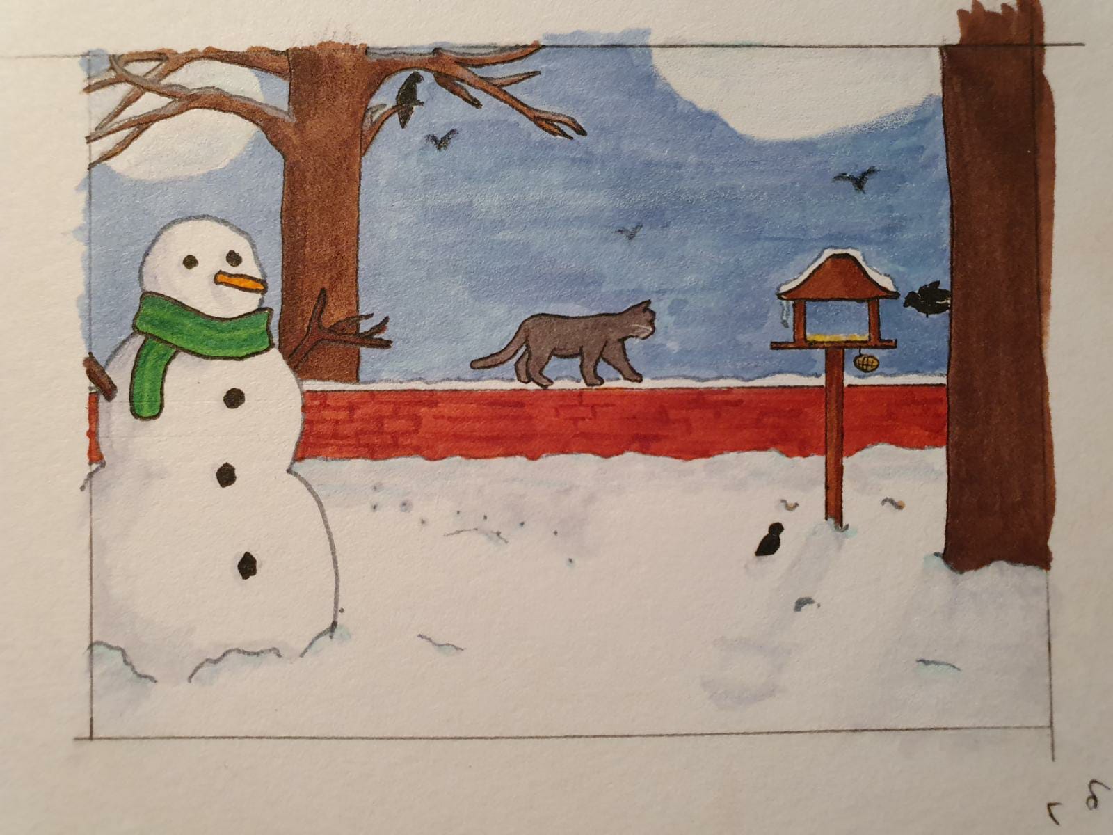 Ein Trüber Wintertag. Bei dieser Karte bin ich unsicher, ob sie zum Thema ausreicht. Ich habe, beim Blick aus dem Fenster in das Norddeutsche grau so gedacht, dass Winter ja leider leider keinesfalls immer Schnee bedeutet (inzwischen eher eine Besonderheit…). Darum habe ich einen kahlen Baum gemalt, und eine Katze, die sehnsüchtig - gelangweilt - truairg ? - aus dem Fenster schaut. Der Schneemann daneben ist eine kleine Figur, das ist meiner eigenen Wohnungs-Deko nachempfunden. Ich weiß aber nicht, ob das so rüberkommt und bin bei der Karte insgesamt unsicher, ob sie winterlich genug ist?