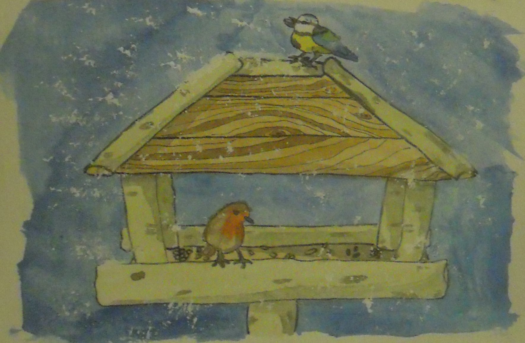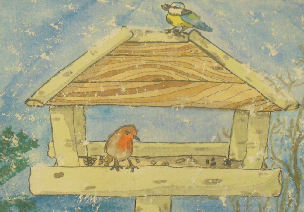 Bei den Vögeln im Garten ist ein wenig gewachsen. Damit der Fokus weiterhin auf dem Häuschen liegt, und weil mir der schon vorhandene Schnee da auch sonst in die Quere gekommen wäre (übermalen ist mit dem Deckweiß eher ungünstig), eher sanft an den Rändern. Aber es macht auf jeden Fall etwas mit der Karte und ich danke noch mal sehr für die Idee!