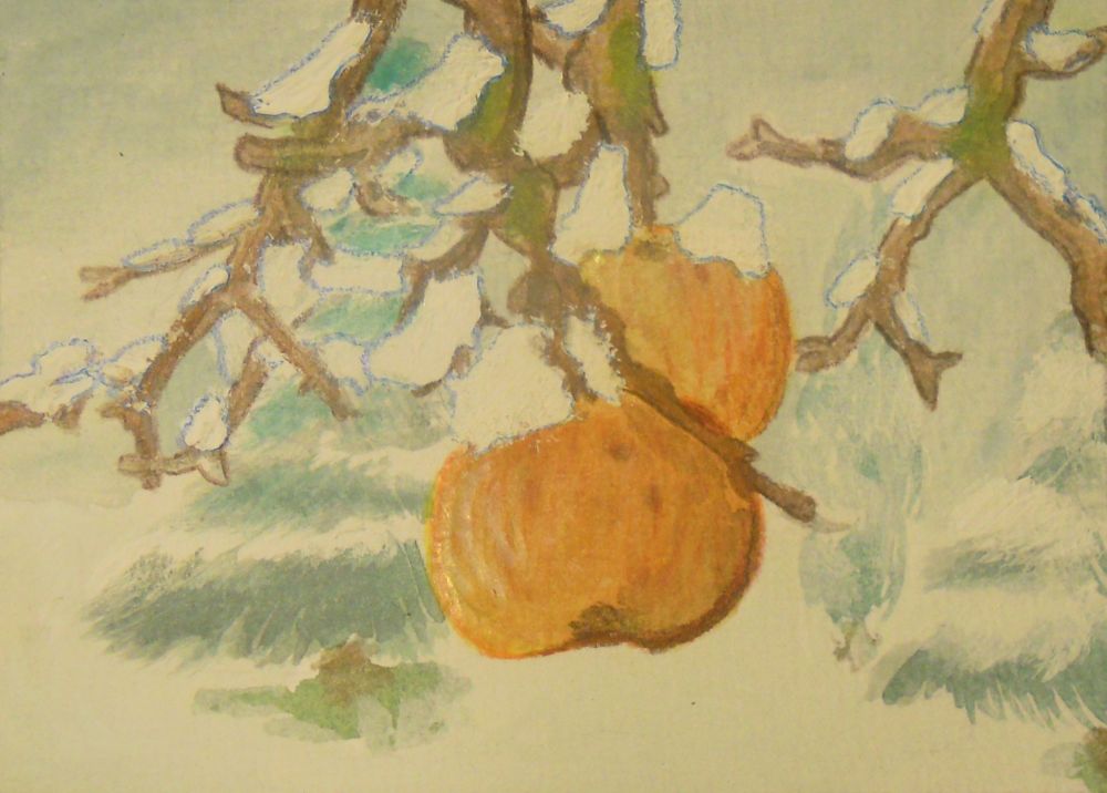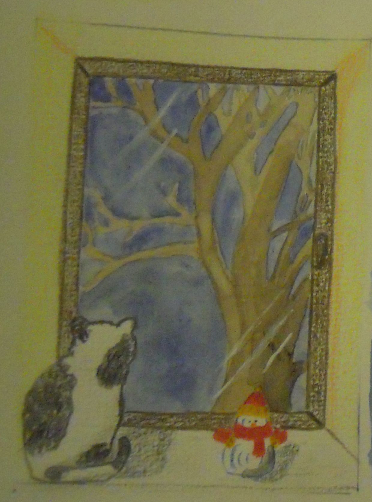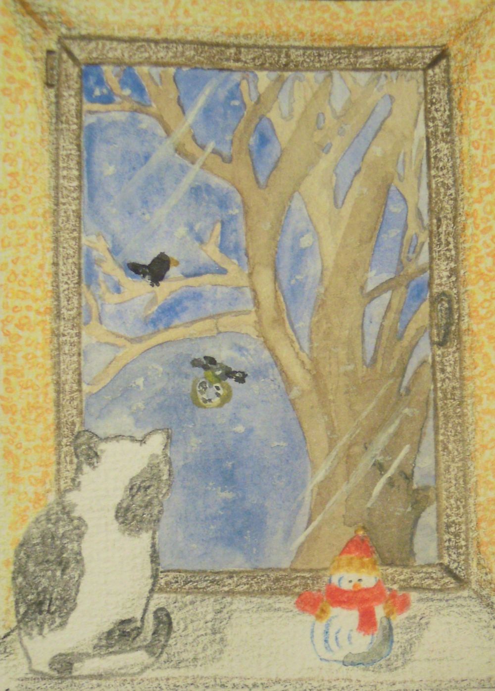 Die Katze hat jetzt ein paar Vögel zum beobachten bekommen und ich habe - bewusst sehr dezent - ein paar Schneeflocken angedeutet; auch die Wand habe ich etwas überarbeitet: