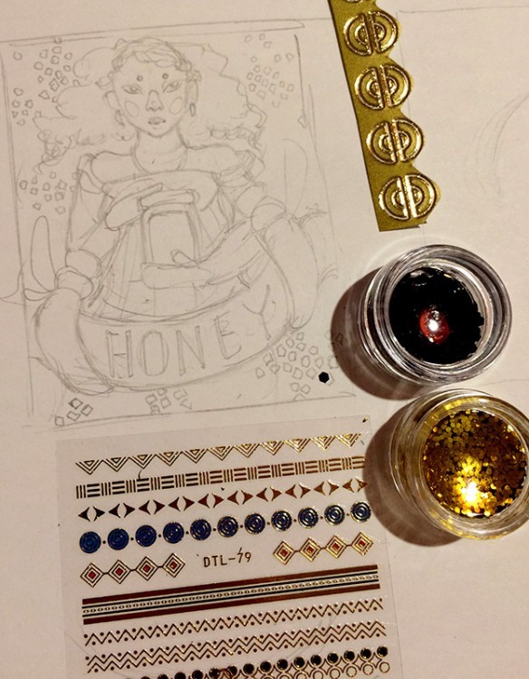 Hihi, ich hab auch schon eine erste Skizze: Es wird etwas golden. :'D Auf die Idee kam ich dadurch, dass der schwarze Glitter so eine Wabenform hat, da waren Bienen irgendwie naheliegend. xD Die schwarzen Glitterteile sollen also dieses Wabenmuster rundherum werden, der goldene Glitter der Honig im Glas, die Unterkörper der Bienen will ich mit diesen schwarz-goldenen Klebestreifen vom Stickerbogen machen und die kleinen Innenteile der halbrunden Sticker sollen die Ohrringe werden. :)