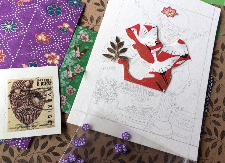 Trifft absolut meinen Geschmack mit den vielen Details und Pflänzlein. (Genial btw. wie du die Briefmarke einsetzen willst, auf die Idee wäre ich gar nicht gekommen o.o).