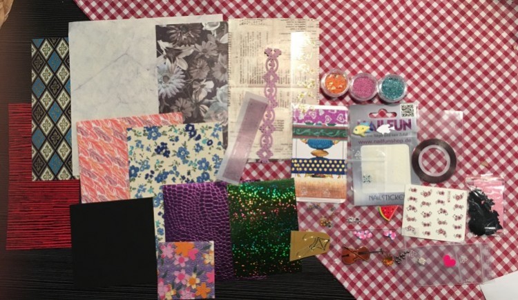 Ich habe versucht, es etwas zu sortieren. Wenn ich richtig gezählt habe, sind es 38 (da hat sich doch was versteckt!) verschiedene Bastelmaterialien, mit so viel hatte ich nicht gerechnet —