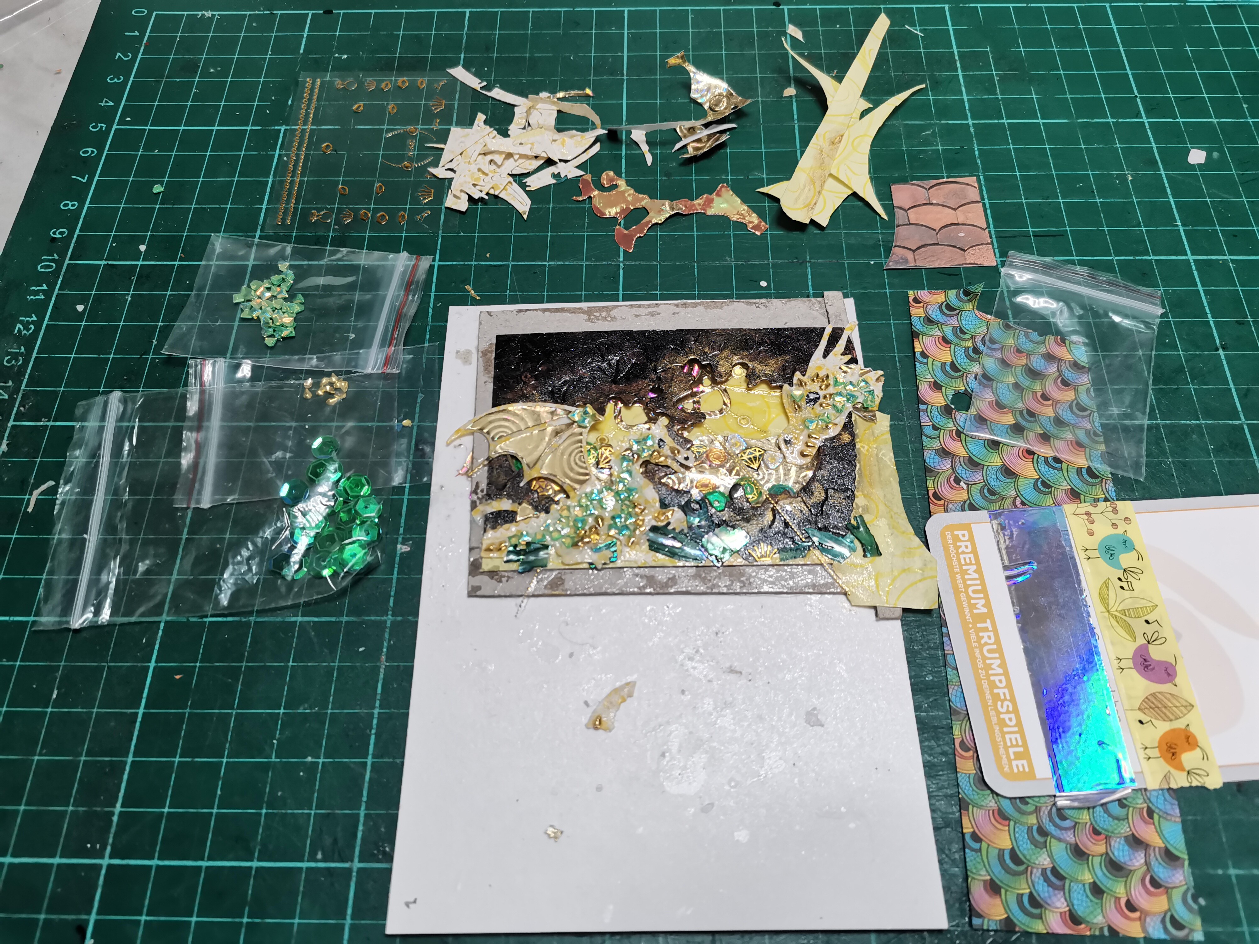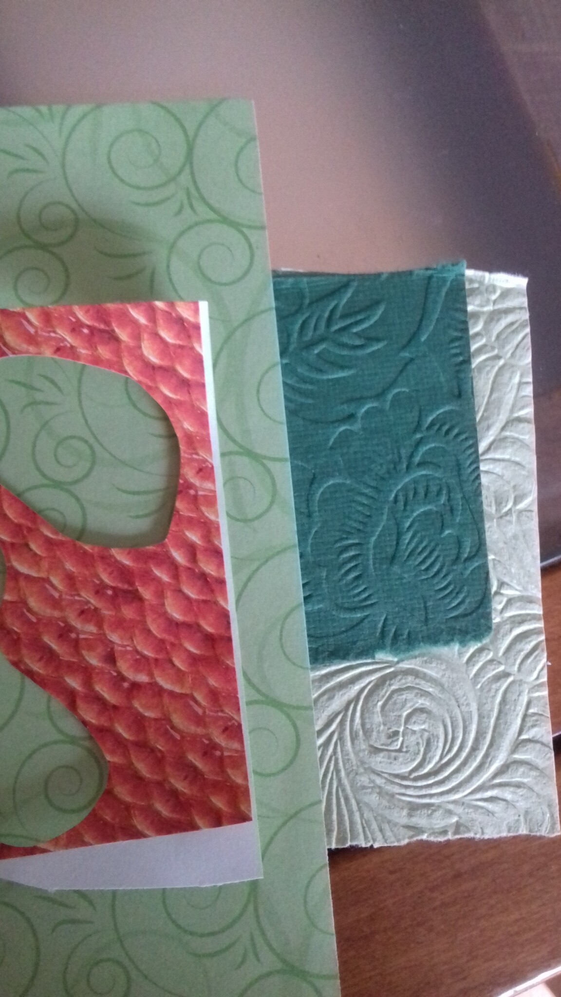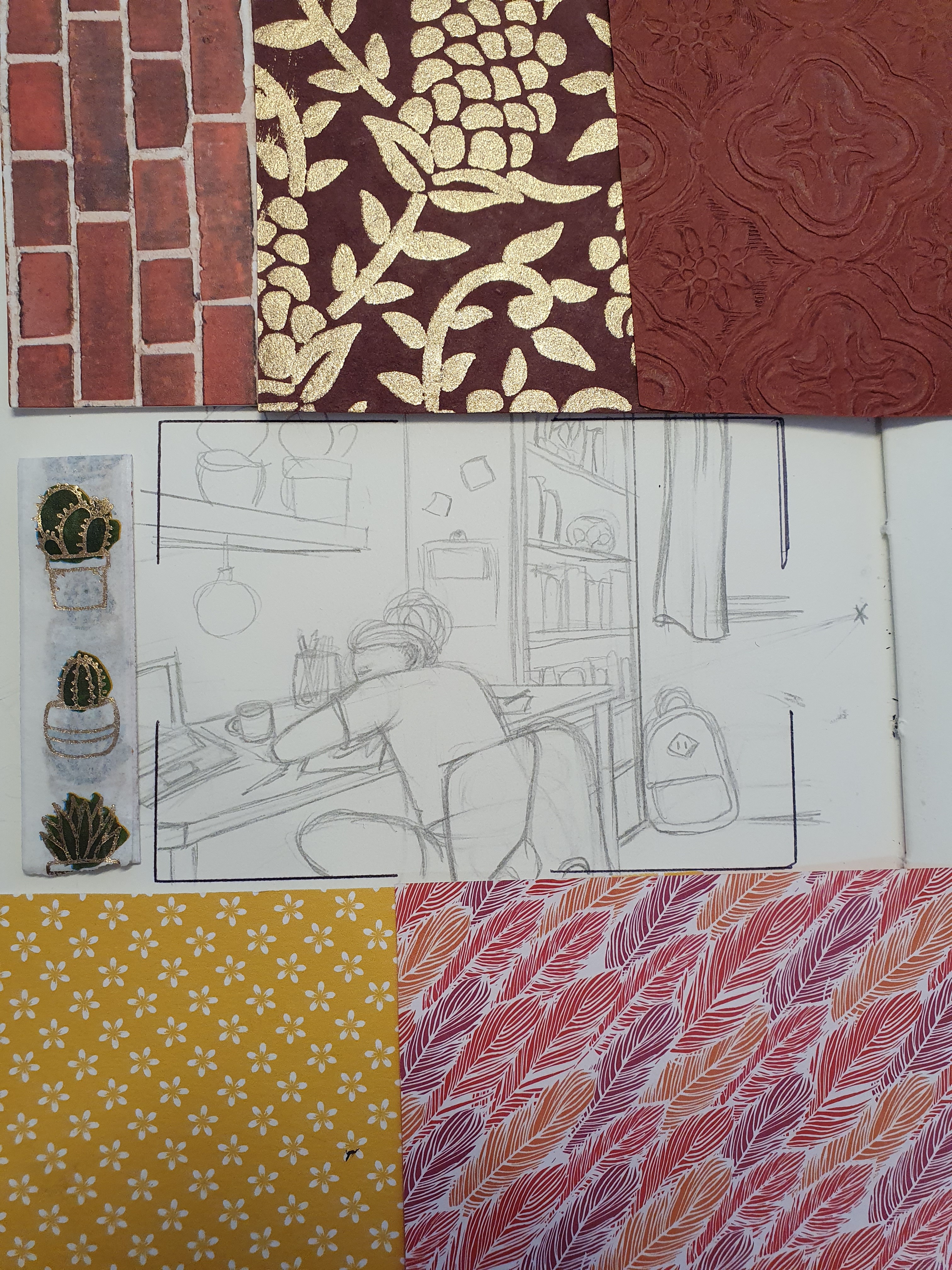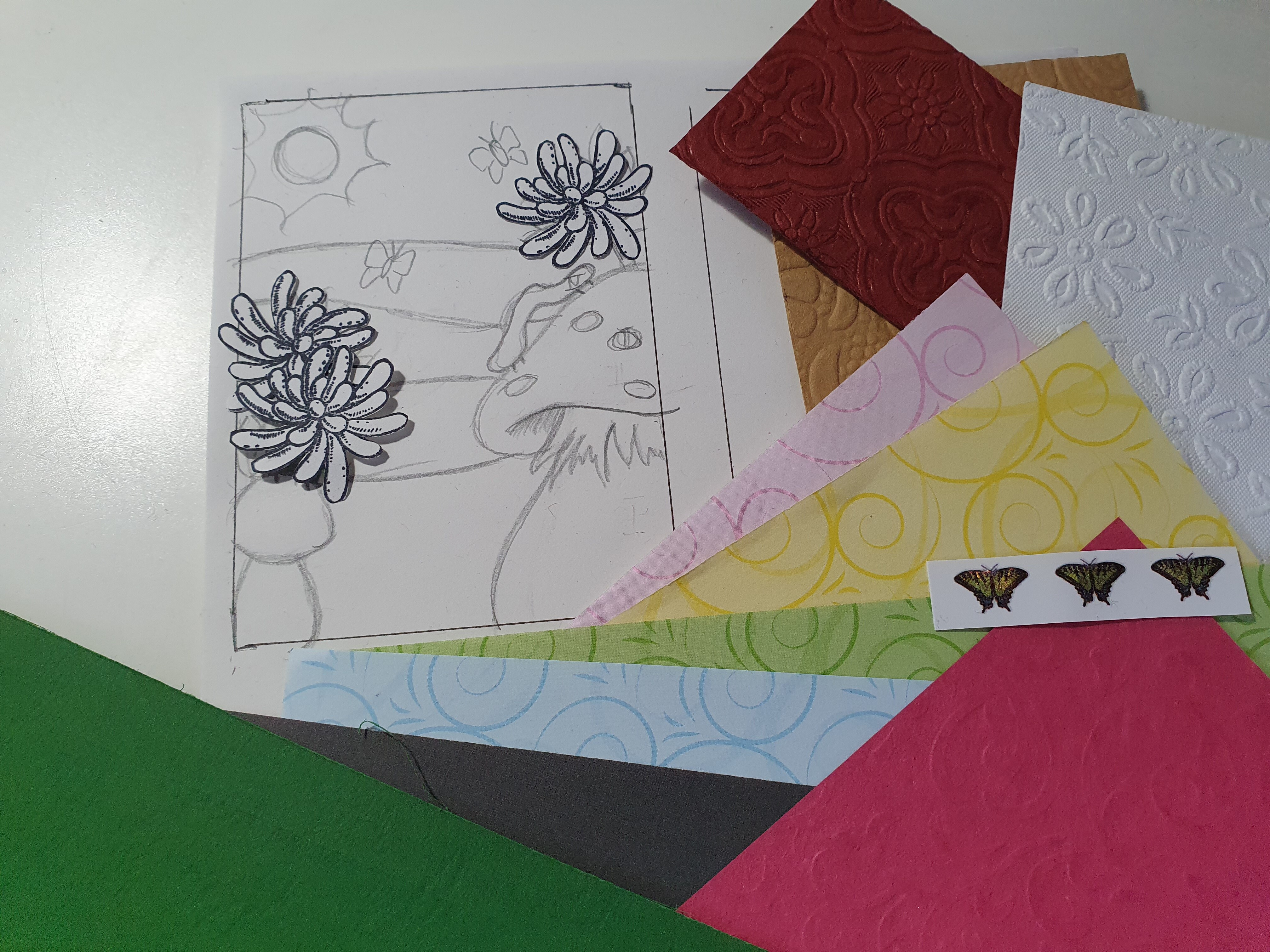 - Die verschiedenen Strukturpapiere sollen für die Pilze herhalten, einen Teil der Sonne und eventuell die Raupe auf dem großen Pilz.