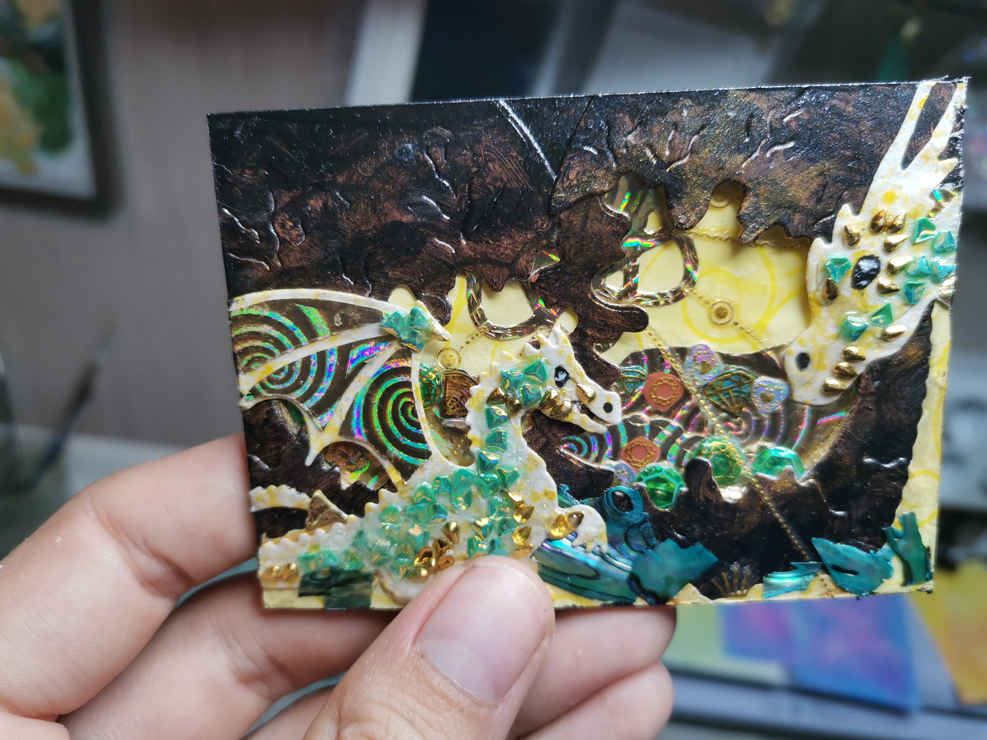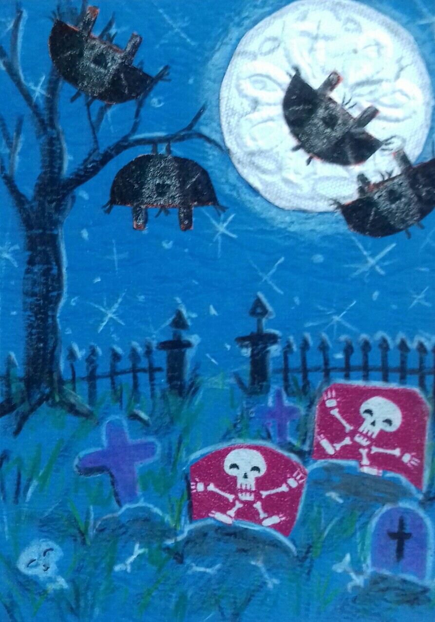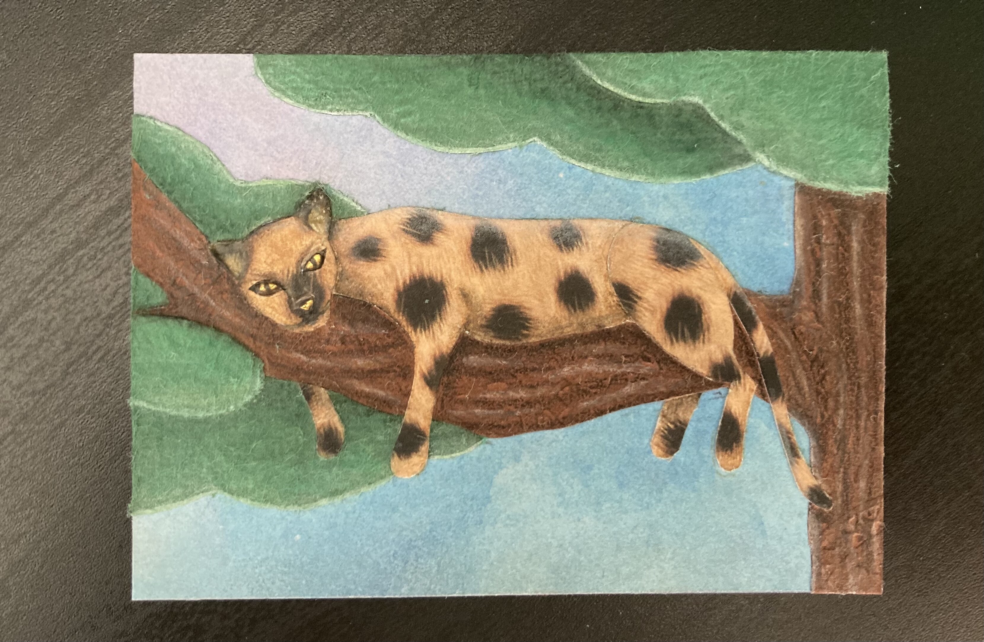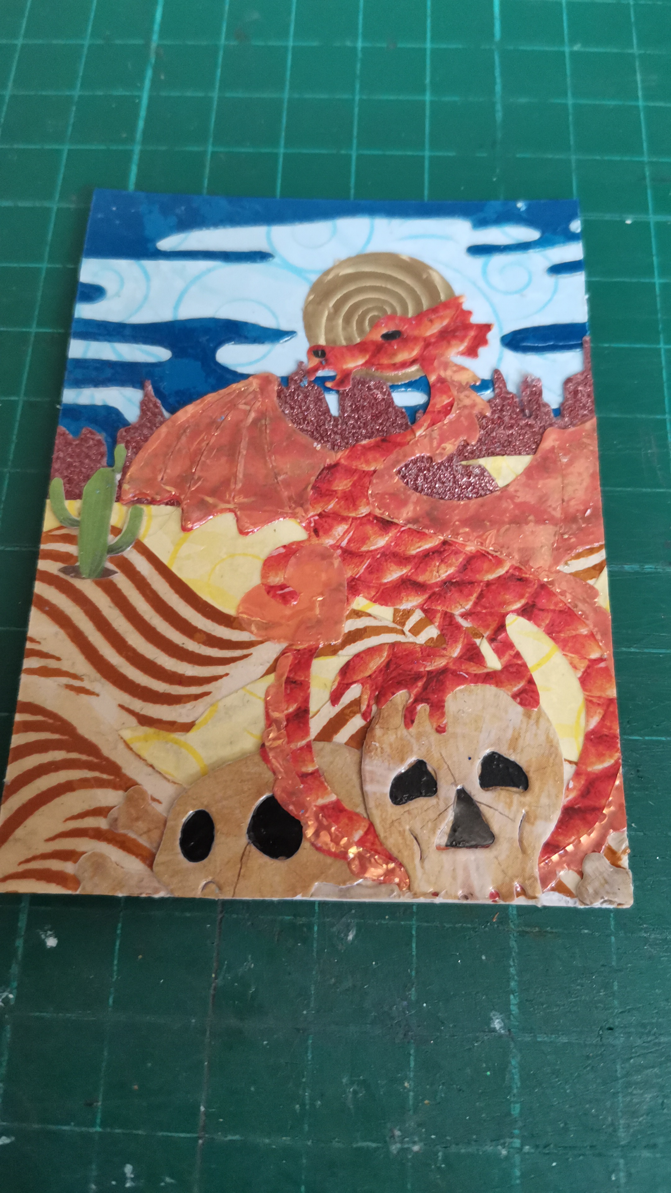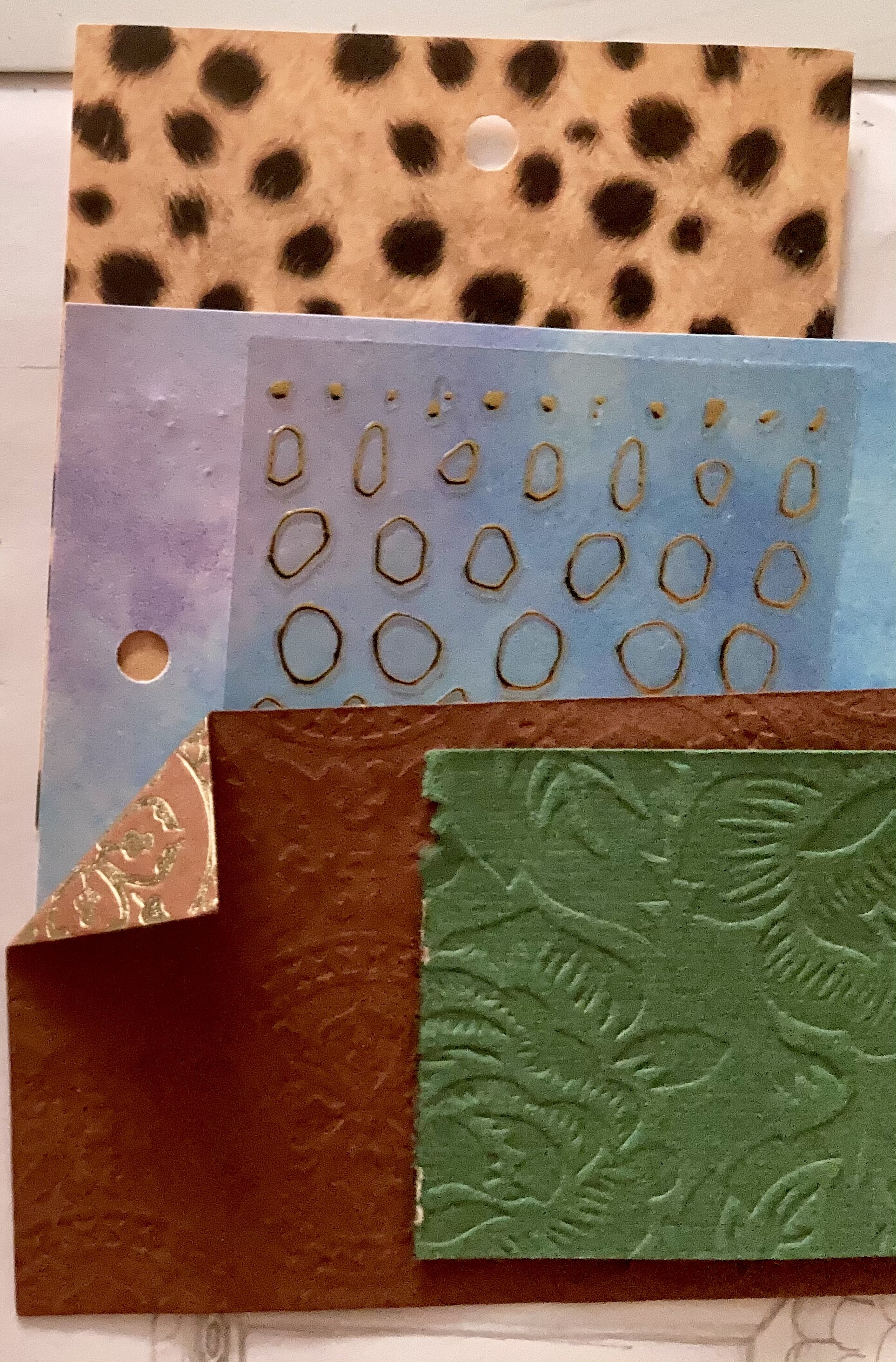 - Die verschiedenen Strukturpapiere sollen für die Pilze herhalten, einen Teil der Sonne und eventuell die Raupe auf dem großen Pilz.