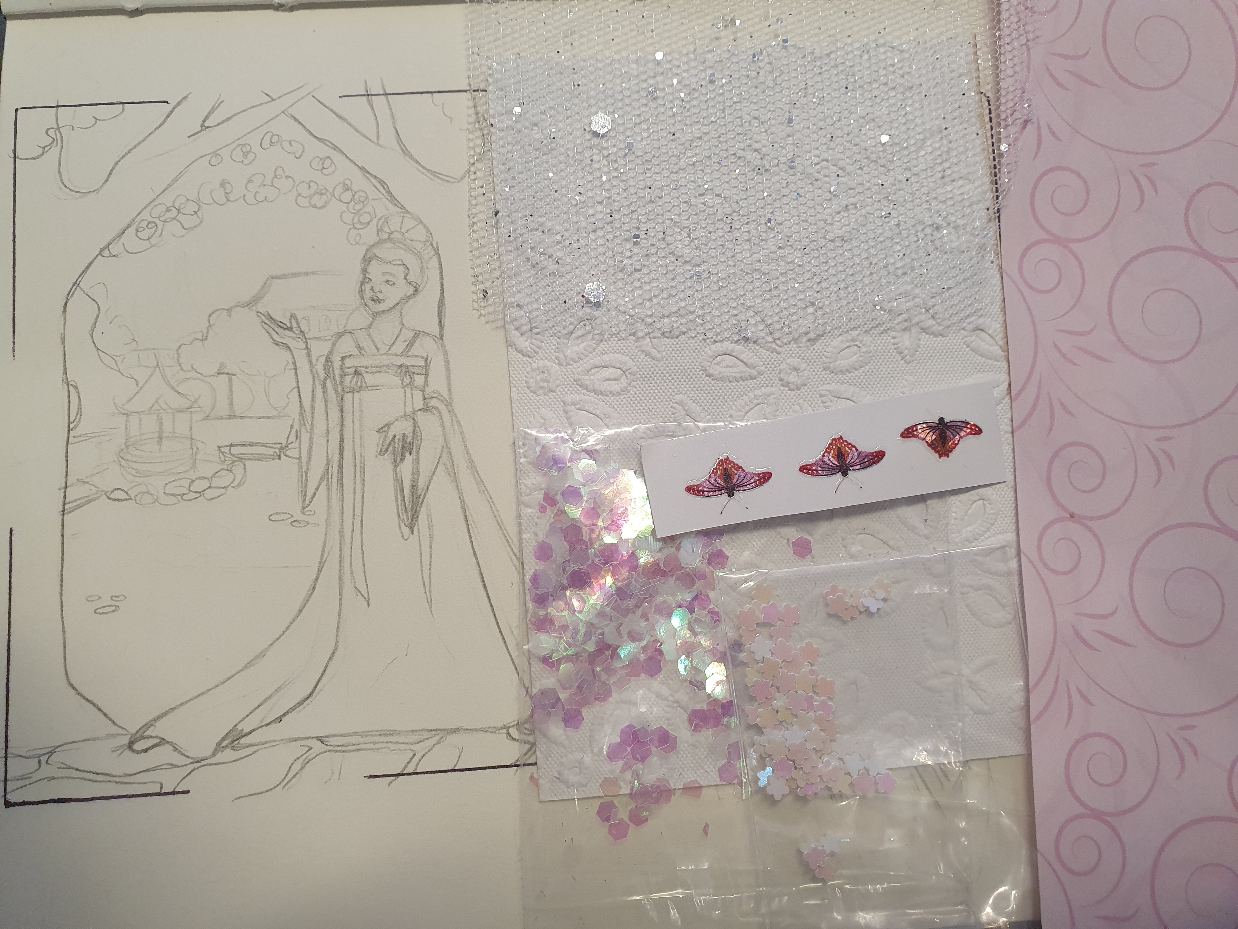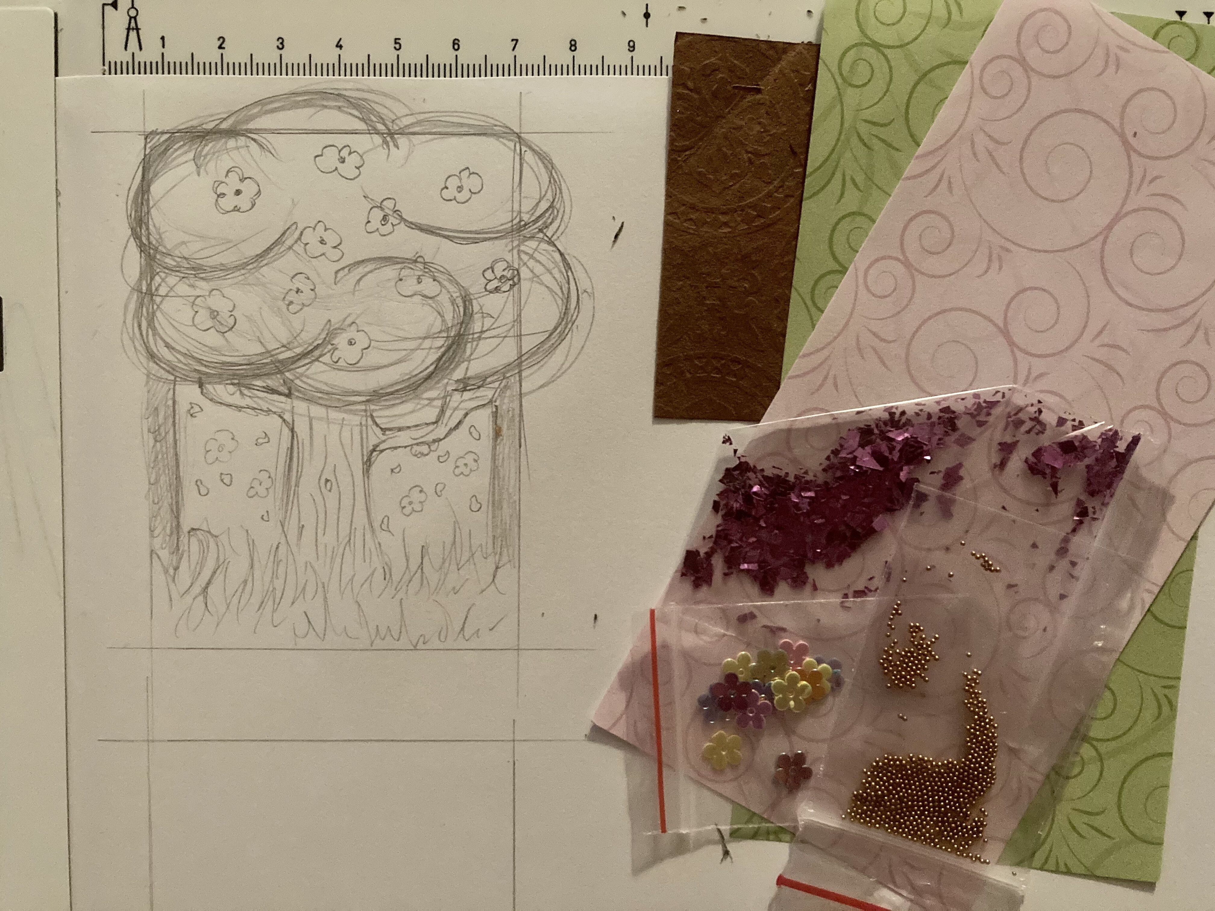 - Die pastelligen Papiere sollen für den Himmel, die Wiesen und die verschiedenen Blüten( das Papier soll bestempelt und ausgeschnitten werden) genutzt werden.