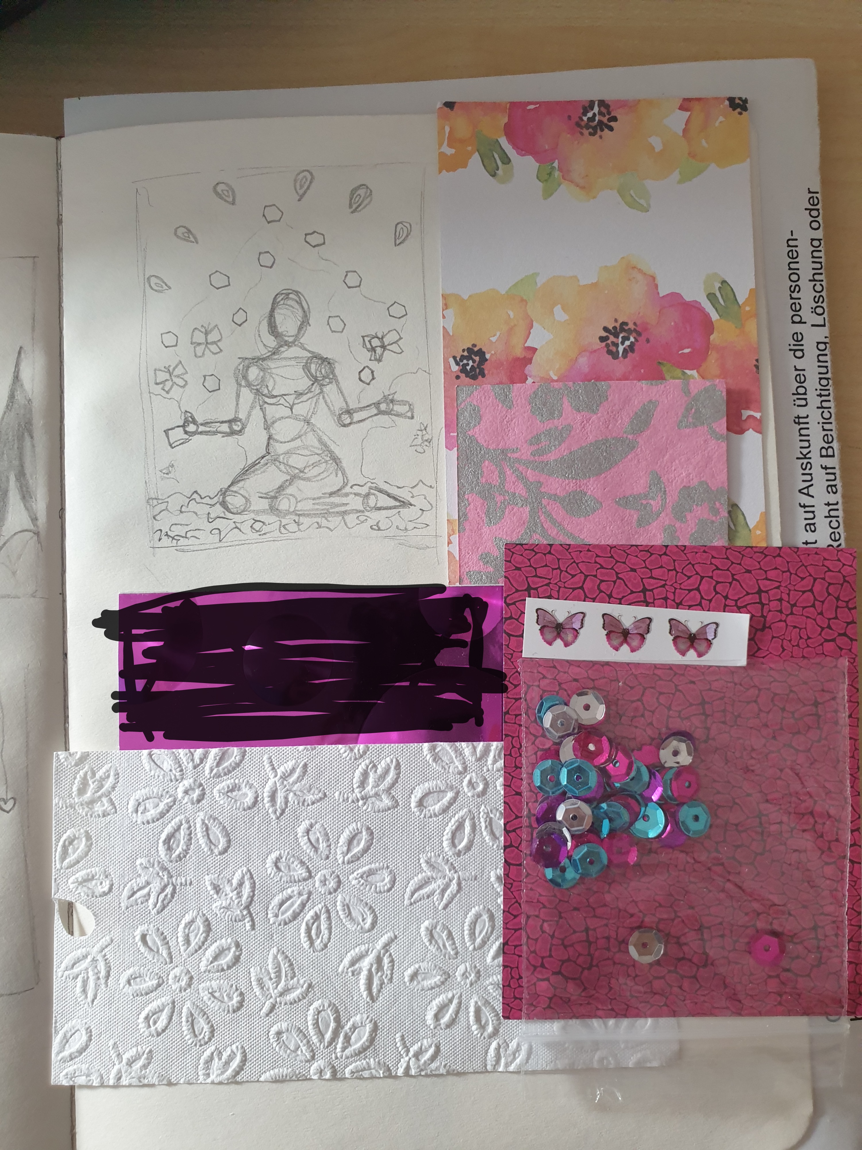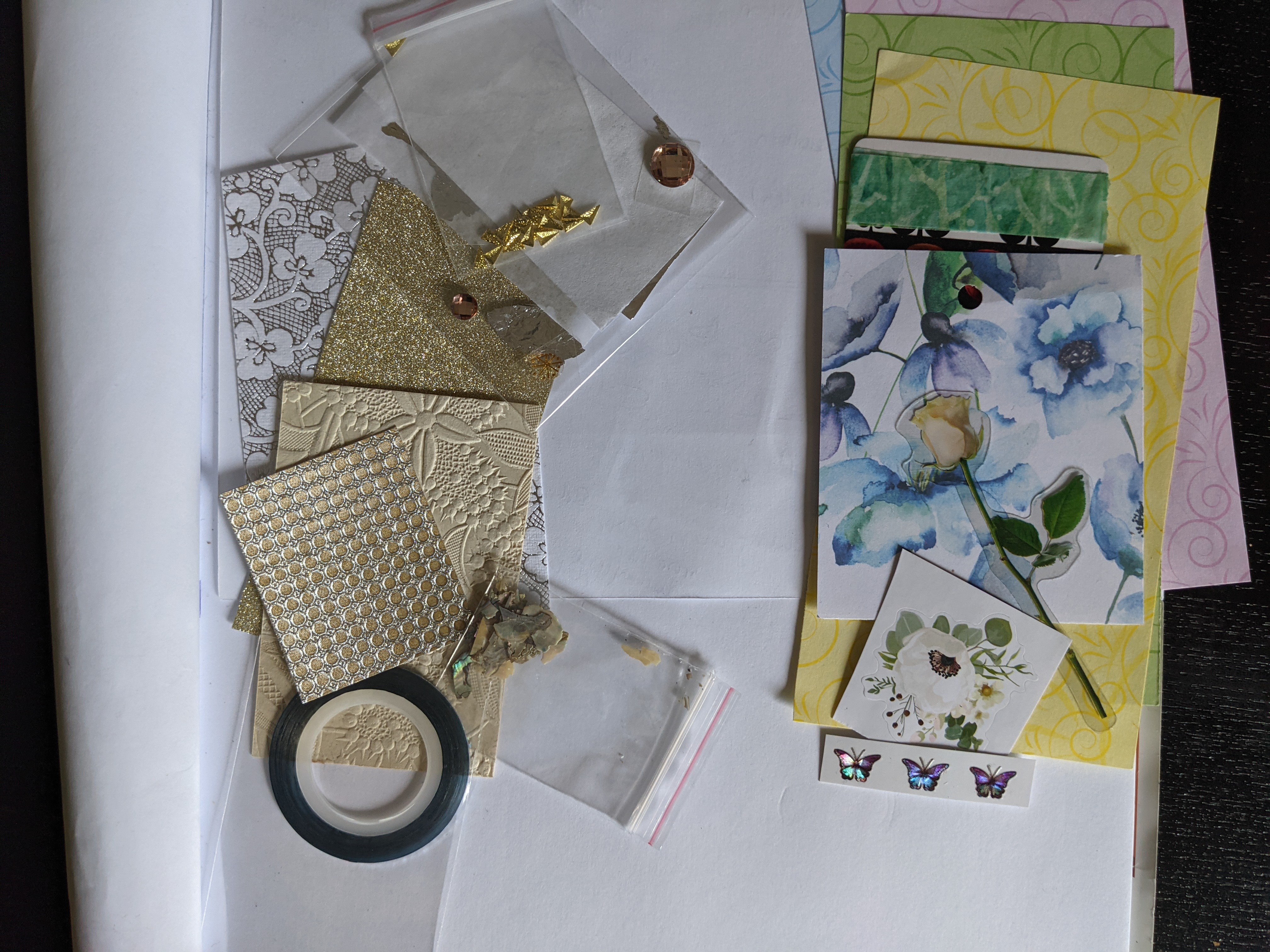 Rechts wären alles so Papiere und Materialien, die super für eine Pflanzen- bzw Blumenkarte zusammen passen würden. Hier muss ich aber auch noch schauen, wie das Motiv aufgebaut werden soll. Aber Thema wäre hier definitiv Pflanzen/Blumen/Natur.