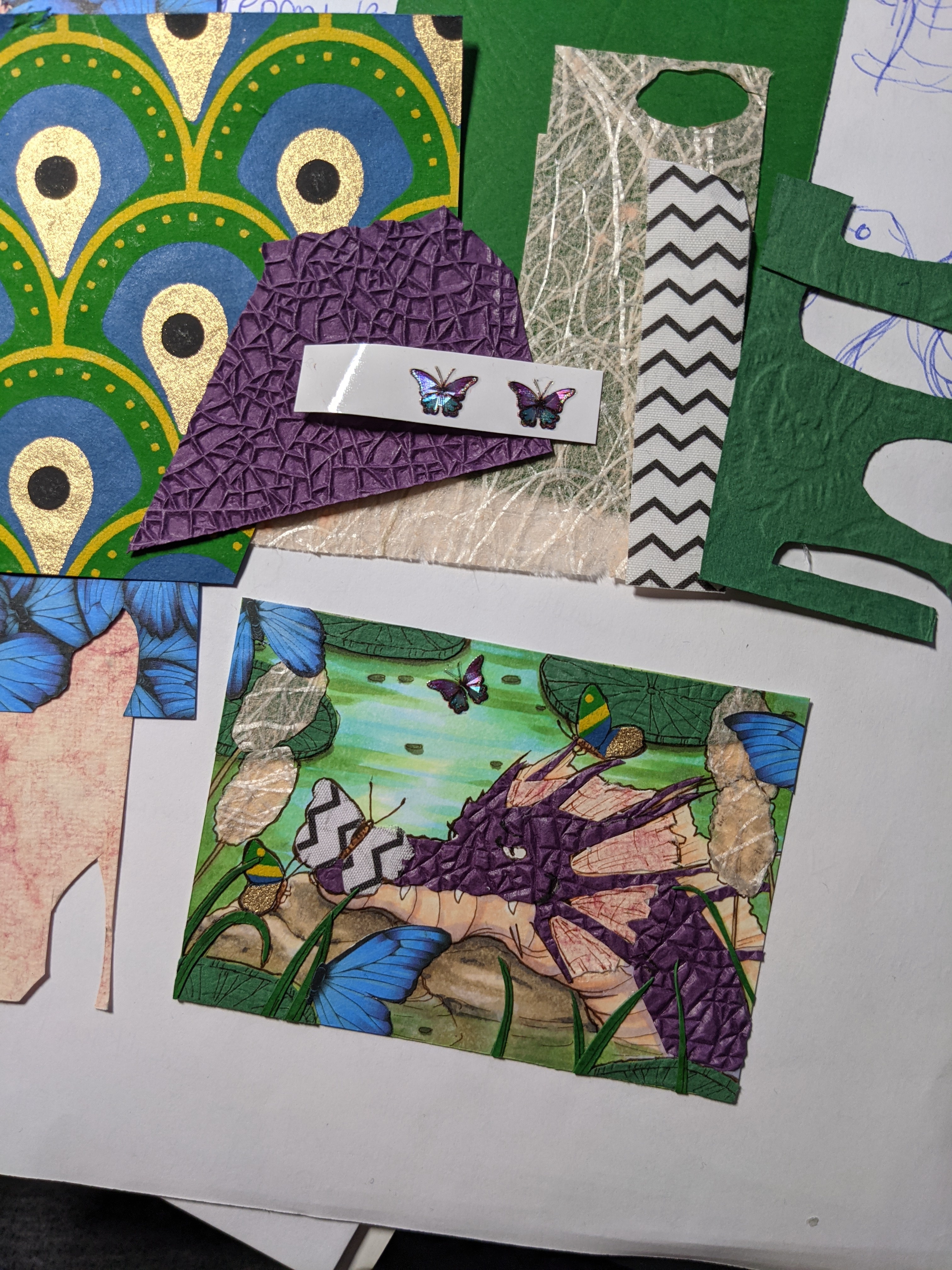 Links sind 1x Gepardenmuster, 1x orangenes Washitape und 1x Rosa-Beige-Papier (was ich für meinen Drachen bei der Kopfflosse bereits verwendet hatte) bereits für 3 der Muscheln geplant. Diese Perlmuttbrösel würde ich wohl gerne bei der Schnecke rechts mit einsetzen.