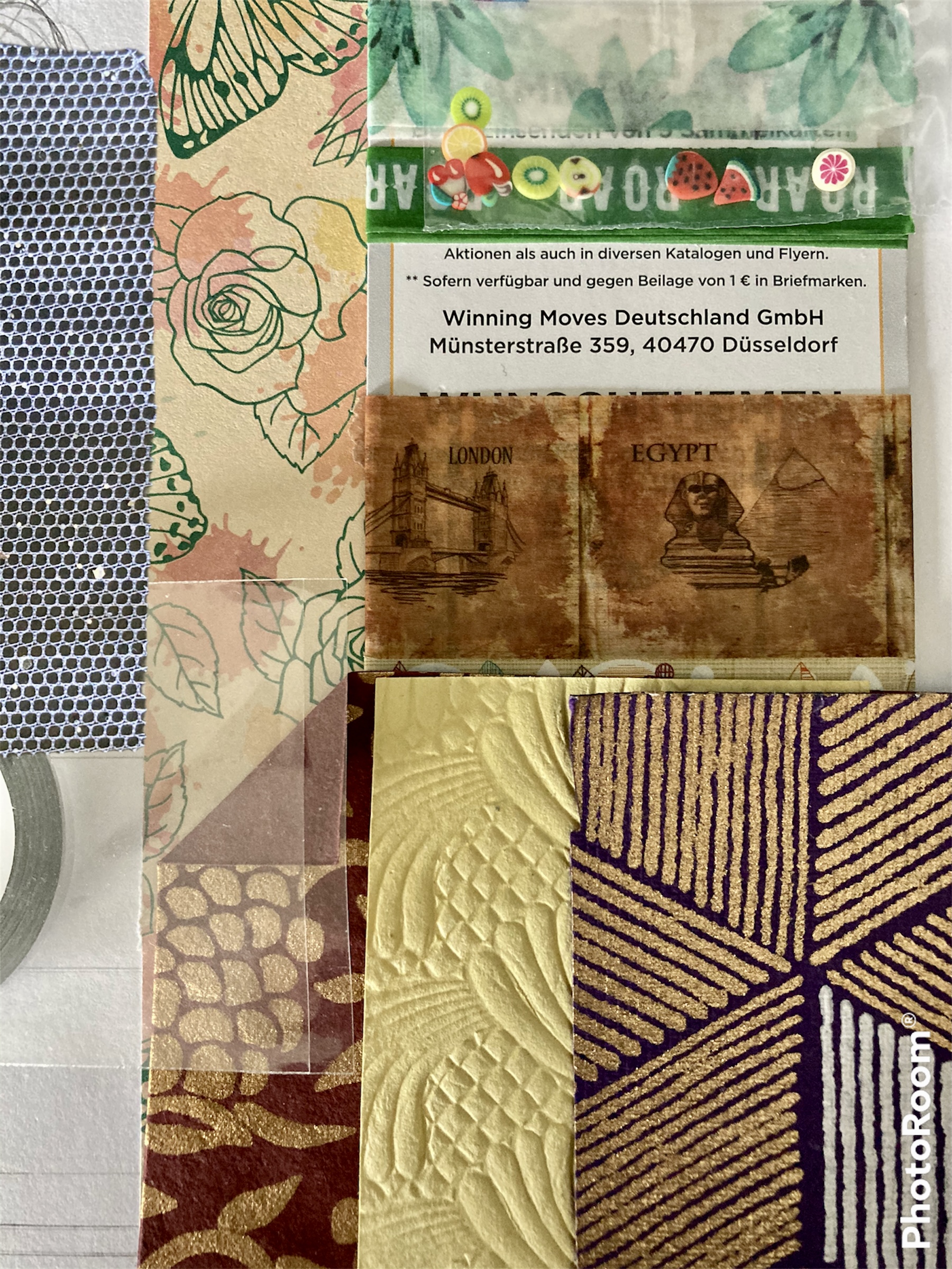 Materialien versuche ich alle in der Karte unterzubringen, bei den drei grünen Papieren muss ich schauen, obs passt oder nicht doch zu viel wird.