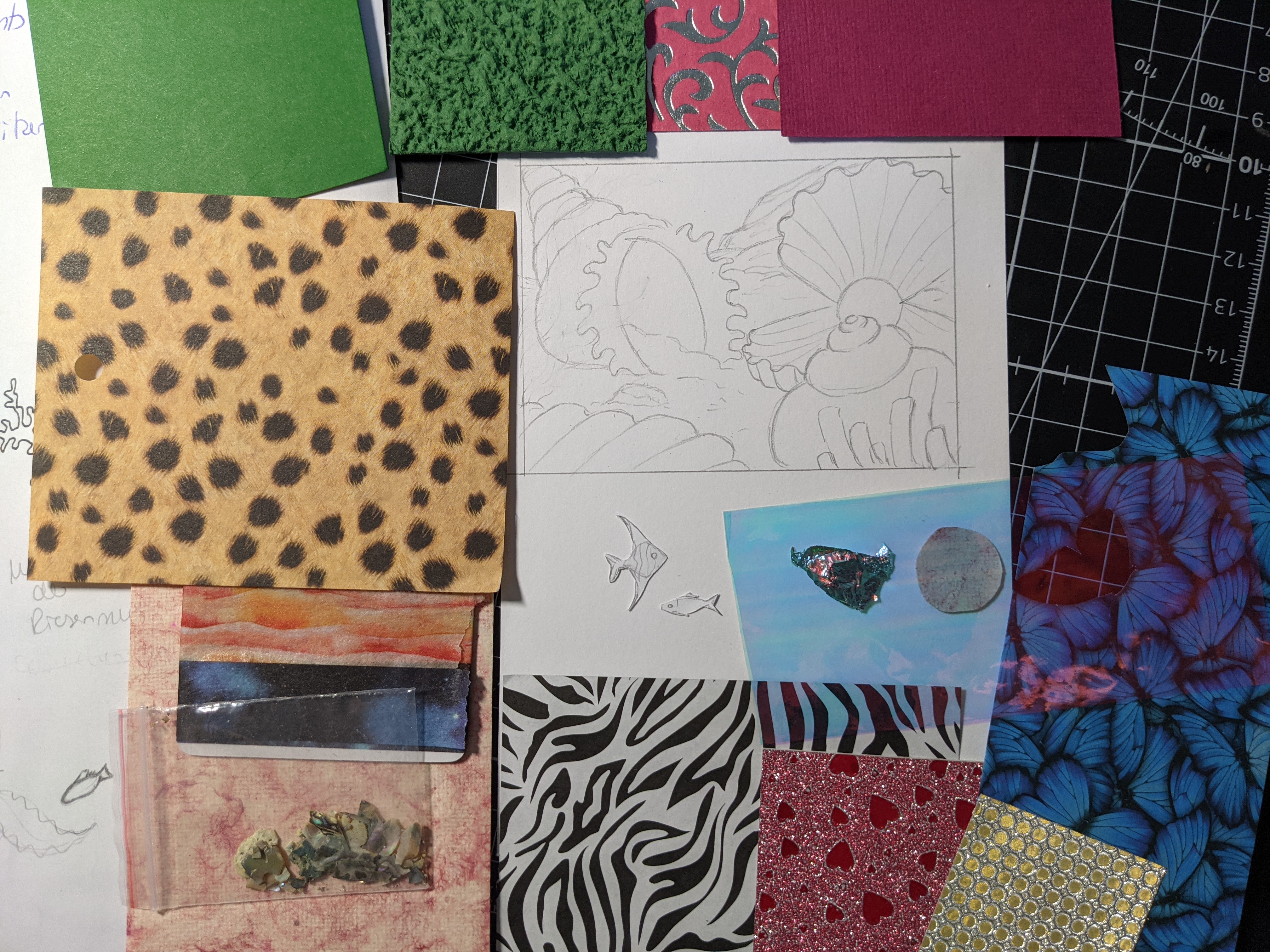 Bei der Muschel mit Perle überlege ich noch, wie ich die Perle machen soll. Ich hab so tolles Holopapier(?), was sich dafür eignen würde, wenn ich vielleicht noch etwas drunter lege. Und da überlege ich entweder das rosa-beige Papier nochmal als Unterlage oder tatsächlich das Schlagsilber (sieht man beides auf dem Foto, das bläuliche unter der Kartenskizze). Hier bin ich noch sehr zwiegespalten. Oder einfach nur selbst colorn und dann die Folie drüber legen