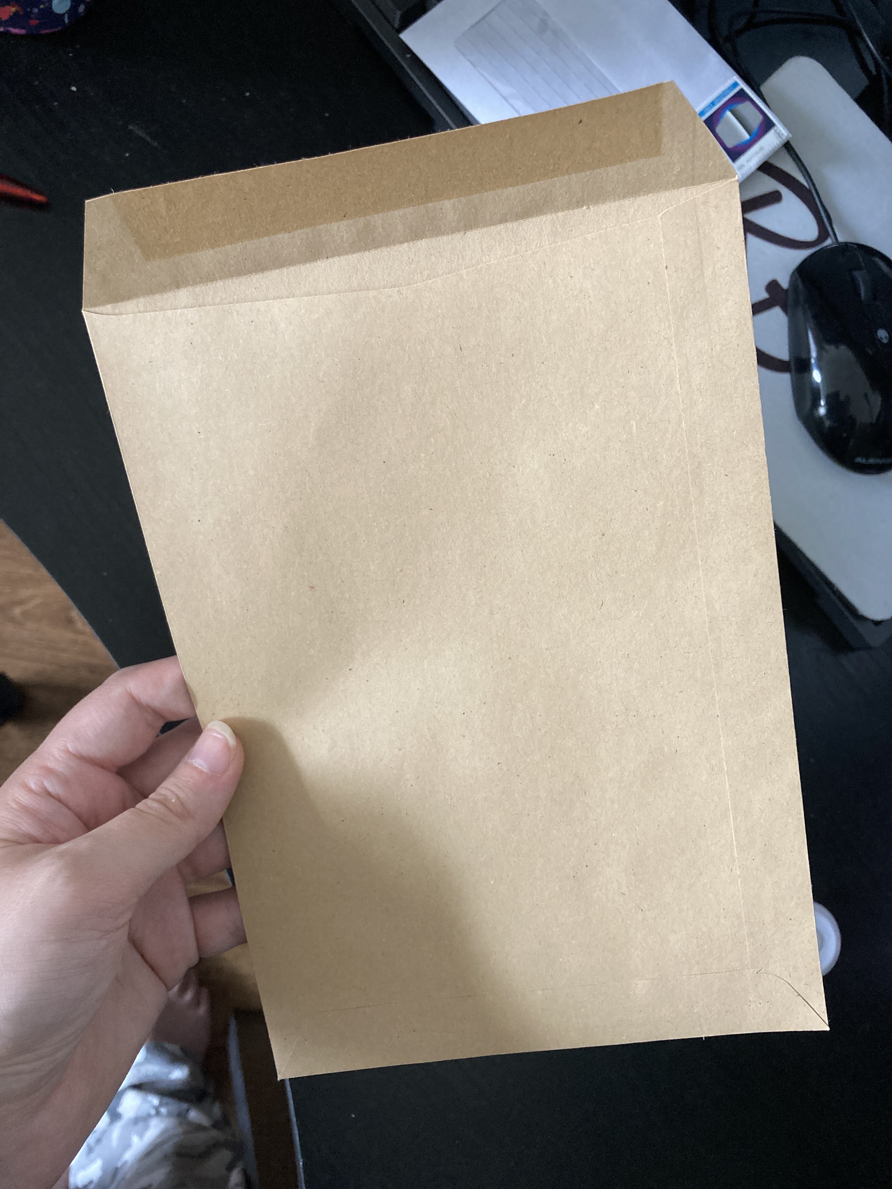ist halt normale braune Versandtasche. Die karten werden bei mir sicherheitshalber troz Verstärkung noch in mein Rückumschlag reingesteckt.