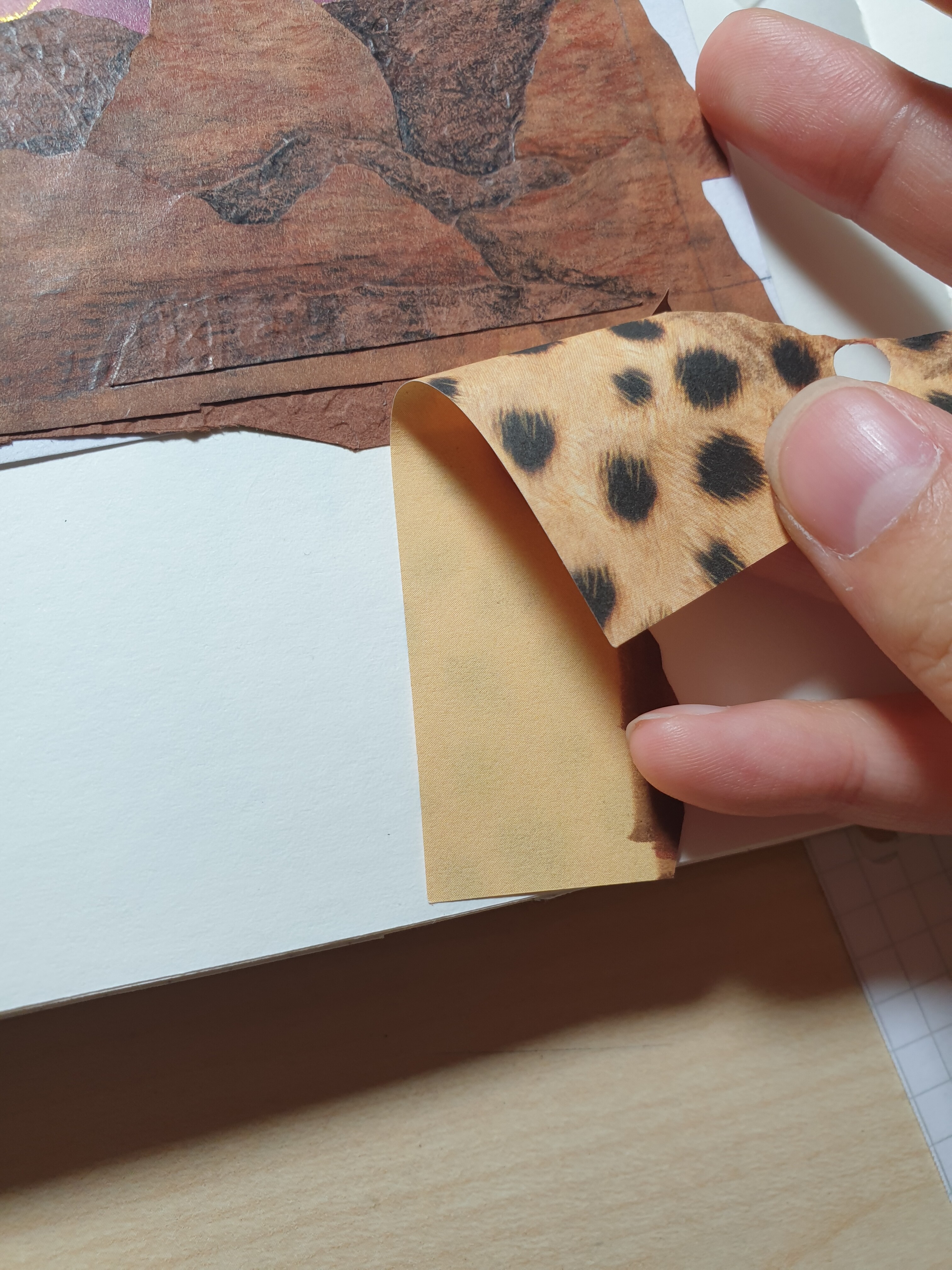 Material: Blauer Karton, Backstein-Muster-Papier, Gold-Muster-Papier, Croissant-Tattoo, Sticker (Spange), Streifen-Muster