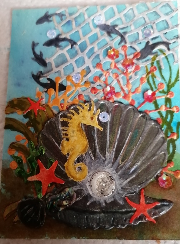 @Wendolin Du hast eine wunderschöne Unterwasserwelt geschaffen. Die Perle aus Perlmutt ist sehr schön gestaltet und wirkt auch sehr wertvoll. Ich mag auch den Einsatz der Pailetten als Wasserblässchen und Schmuck an der Koralle.