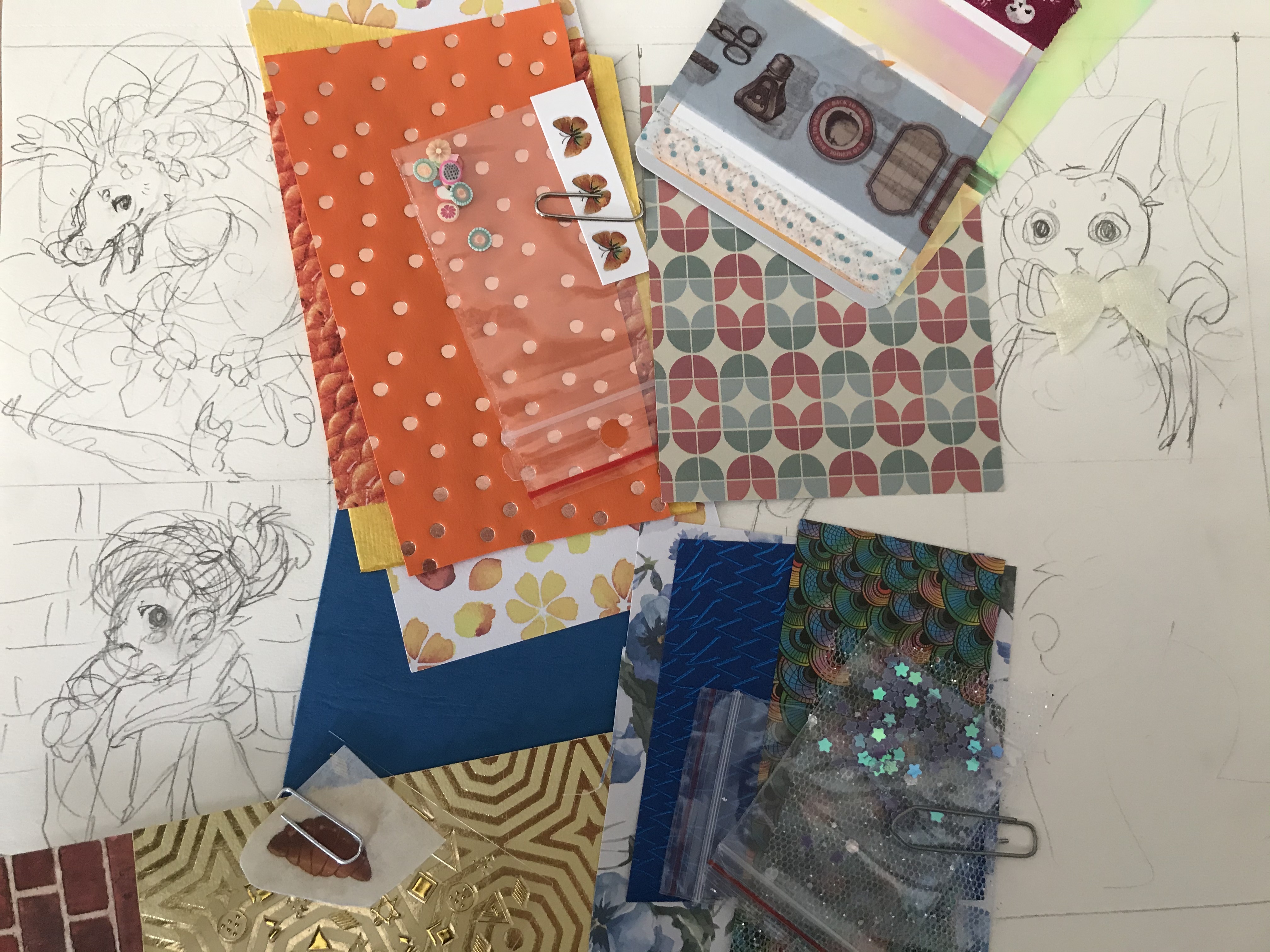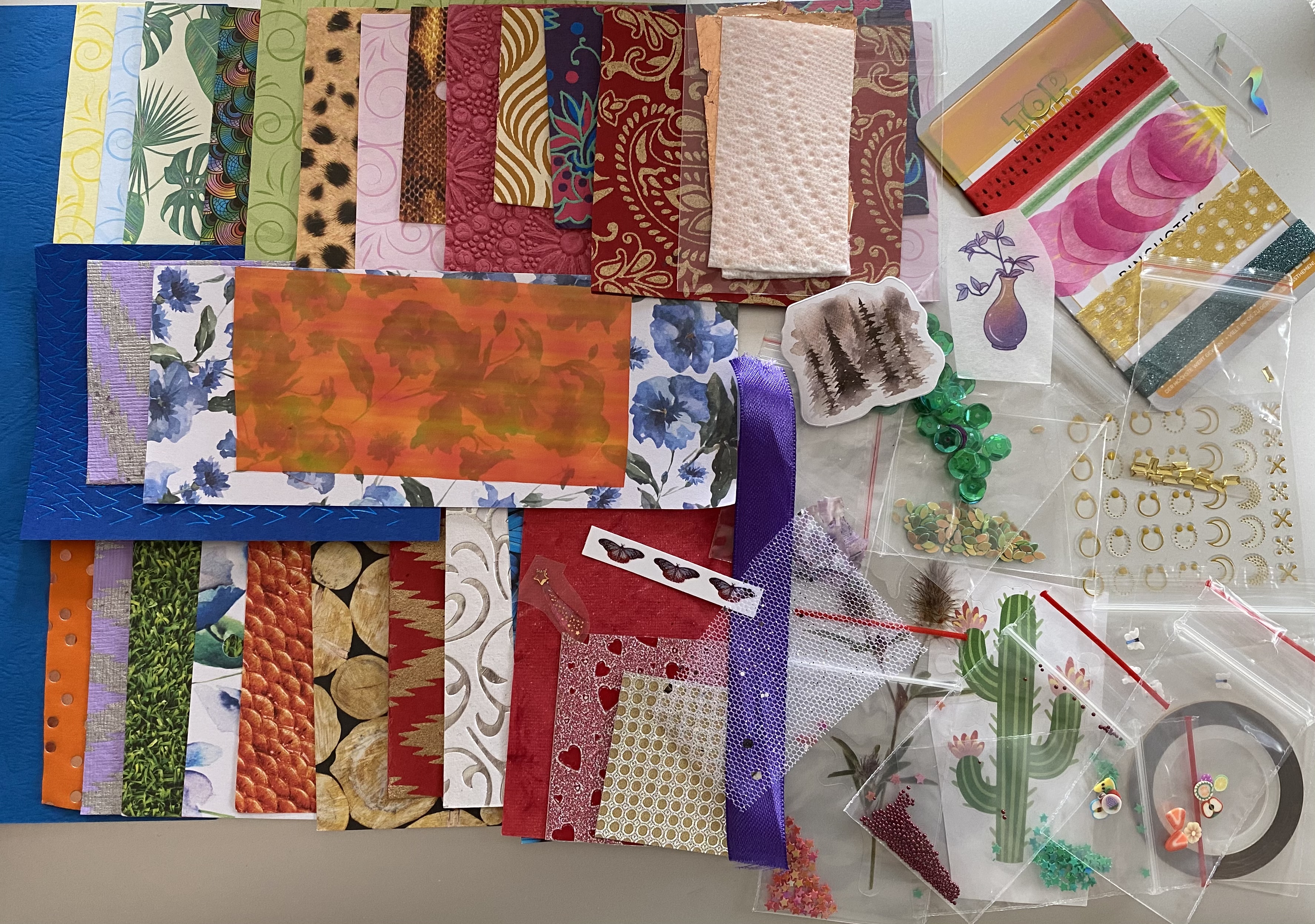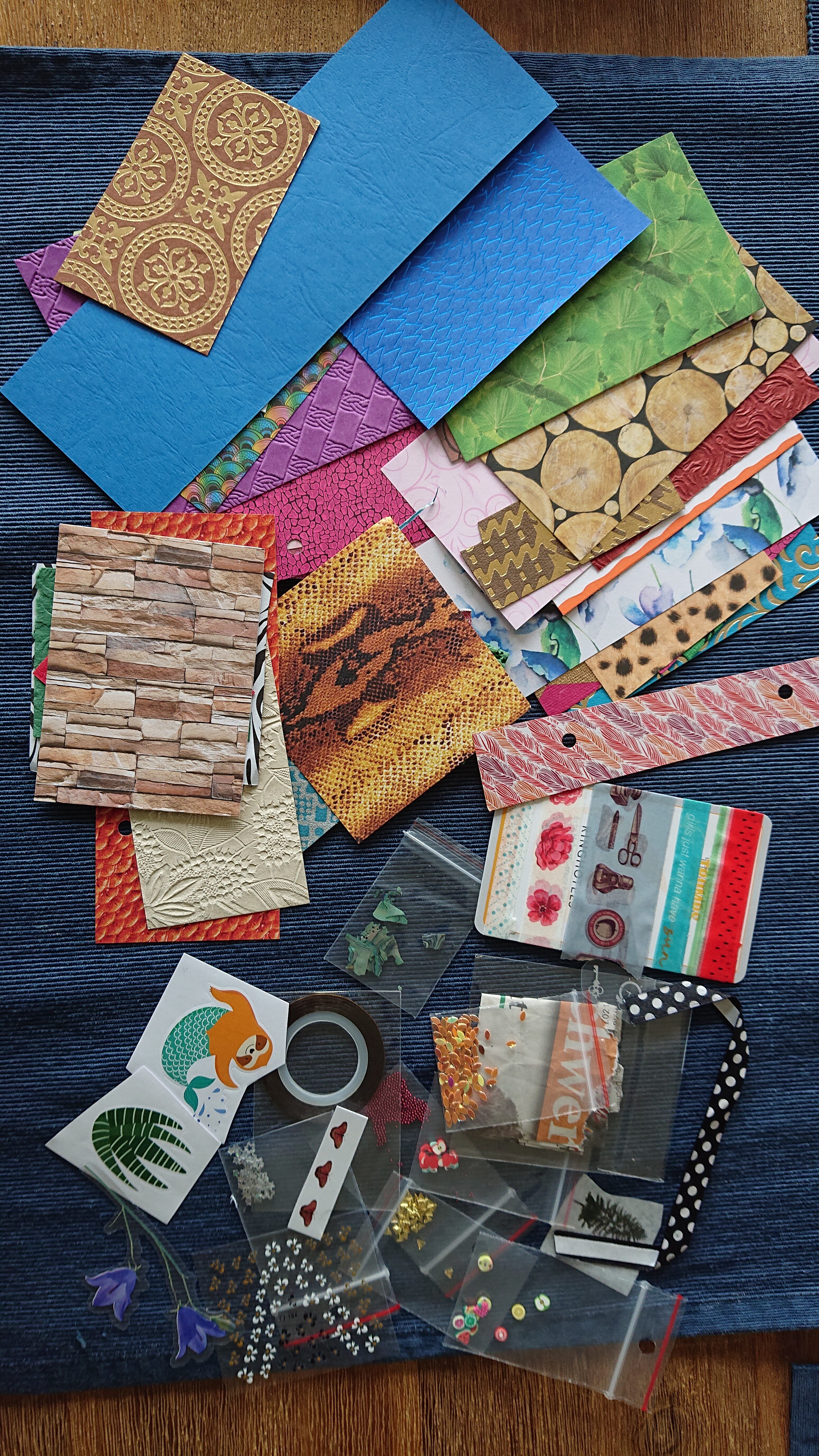 Ich habe mal ein bisschen hin- und hergelegt und mal vier temporäre Stapel an zusammenpassenden Materailien gelegt. Gaaaanz grobe Motivideen/Richtungen hab ich auch schon.