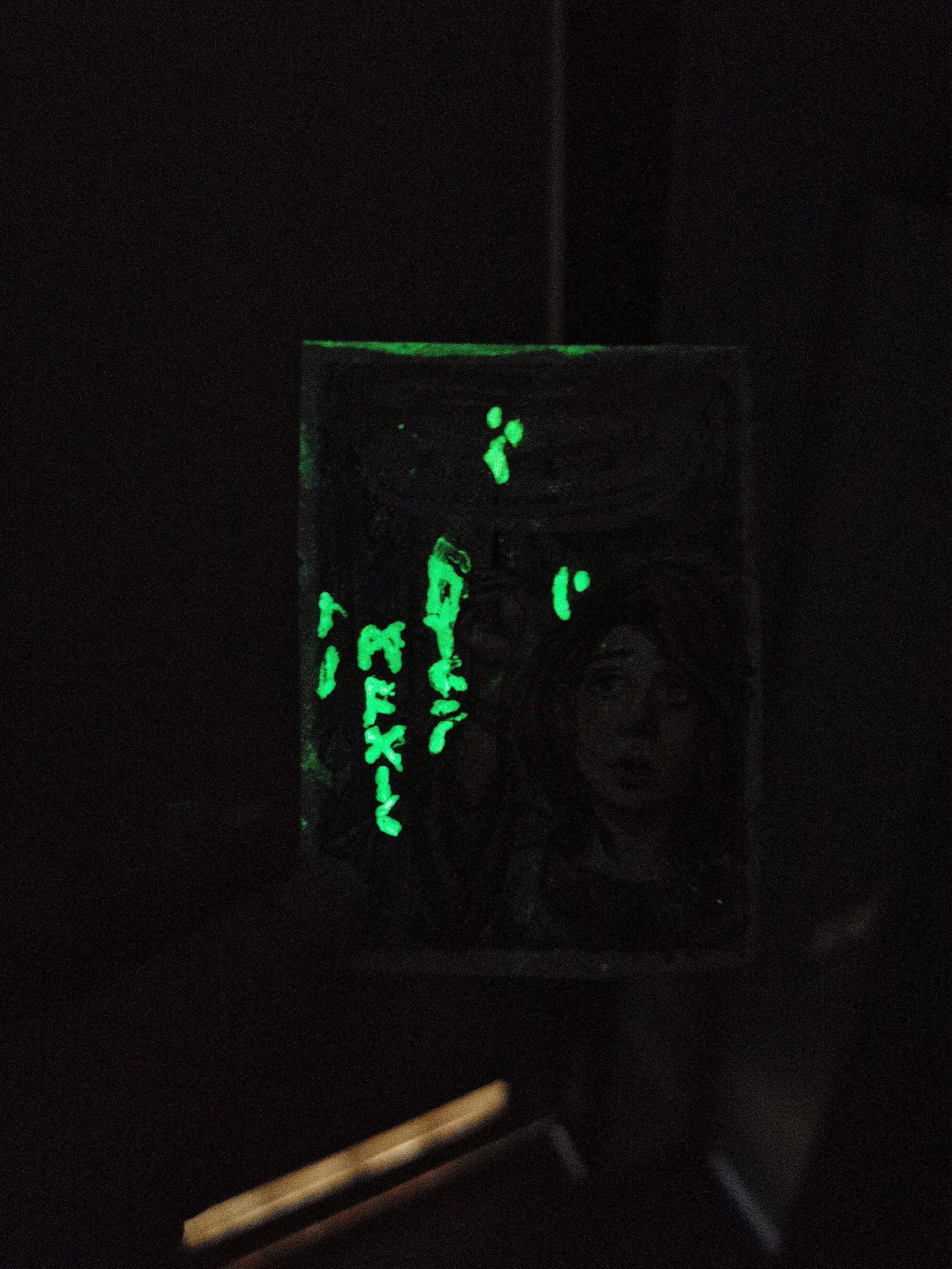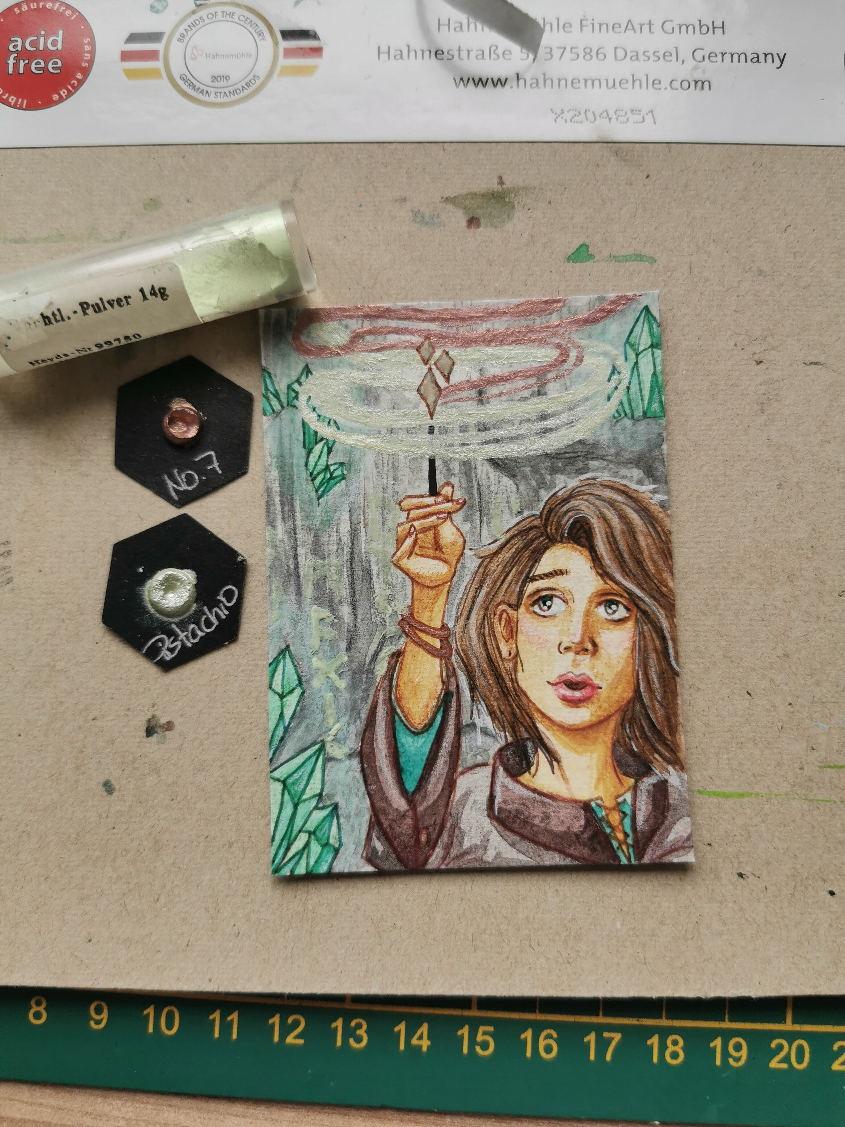Materialien aus der Tüte: Schimmerfarben “No. 7” und “Pistachio” (Zauberstab Rauch, Armreifen, Robenknopf), Nachtleuchtpulver (Zauberstab Rauch, Runen an Felsen)