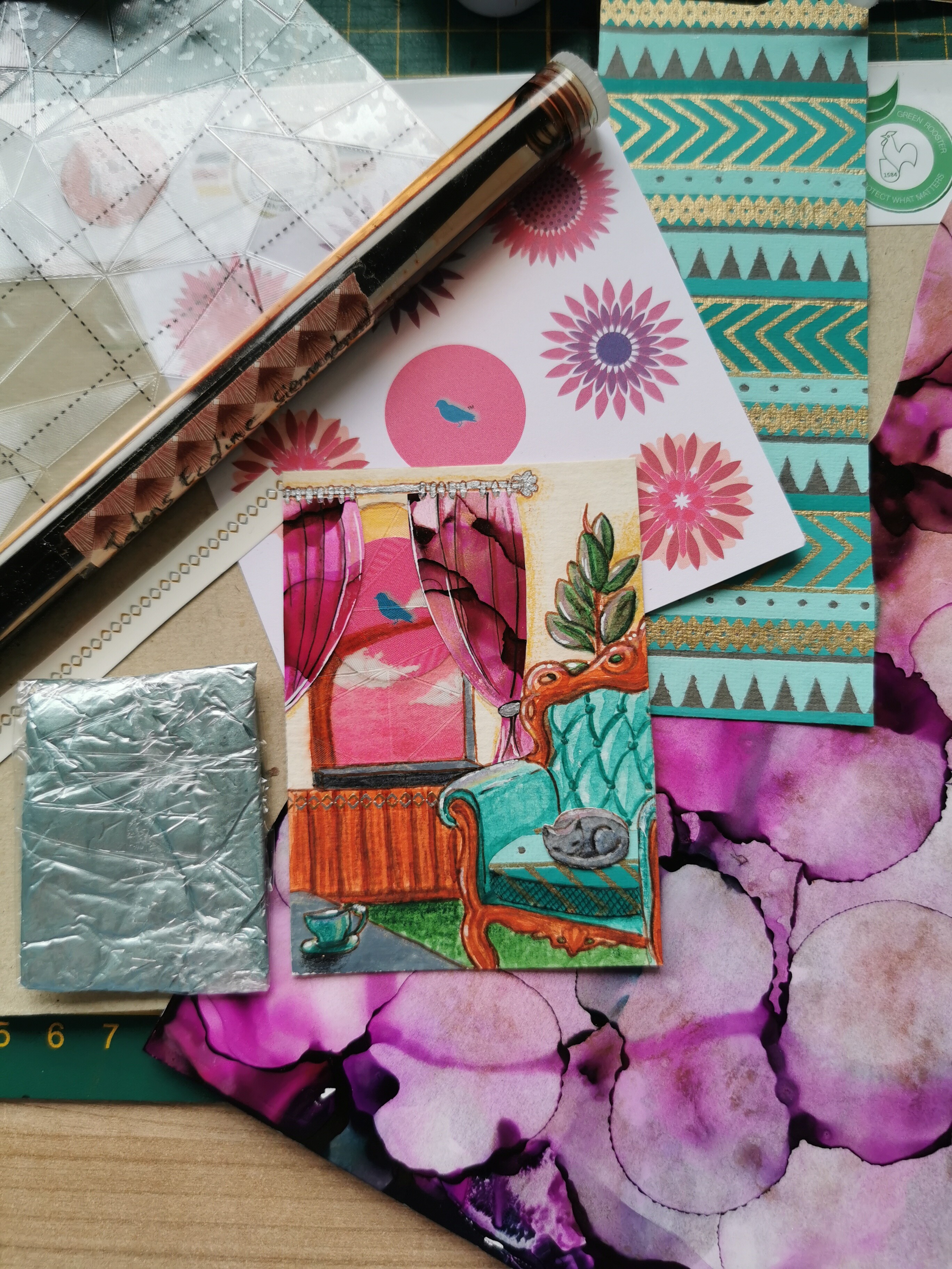 Materialien aus der Tüte: pinker Kreis mit Vogel (Fenster) , Tupfenpapier (Gardinen), “Zink” Farbe (Gardinenstange, Gardinenband), Texturfolie (Fensterscheibe), Glitzertattoo (Holzwand), grünes Papier (Kissen), Aquarellfarbe (Holz an Wand und Stuhl)