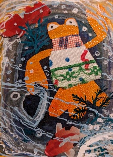 Material : orange Glitzerfolie, Stoff mit Mustern, grüne Spitzenbodüre, oranges Gitterband, Stickerfisch