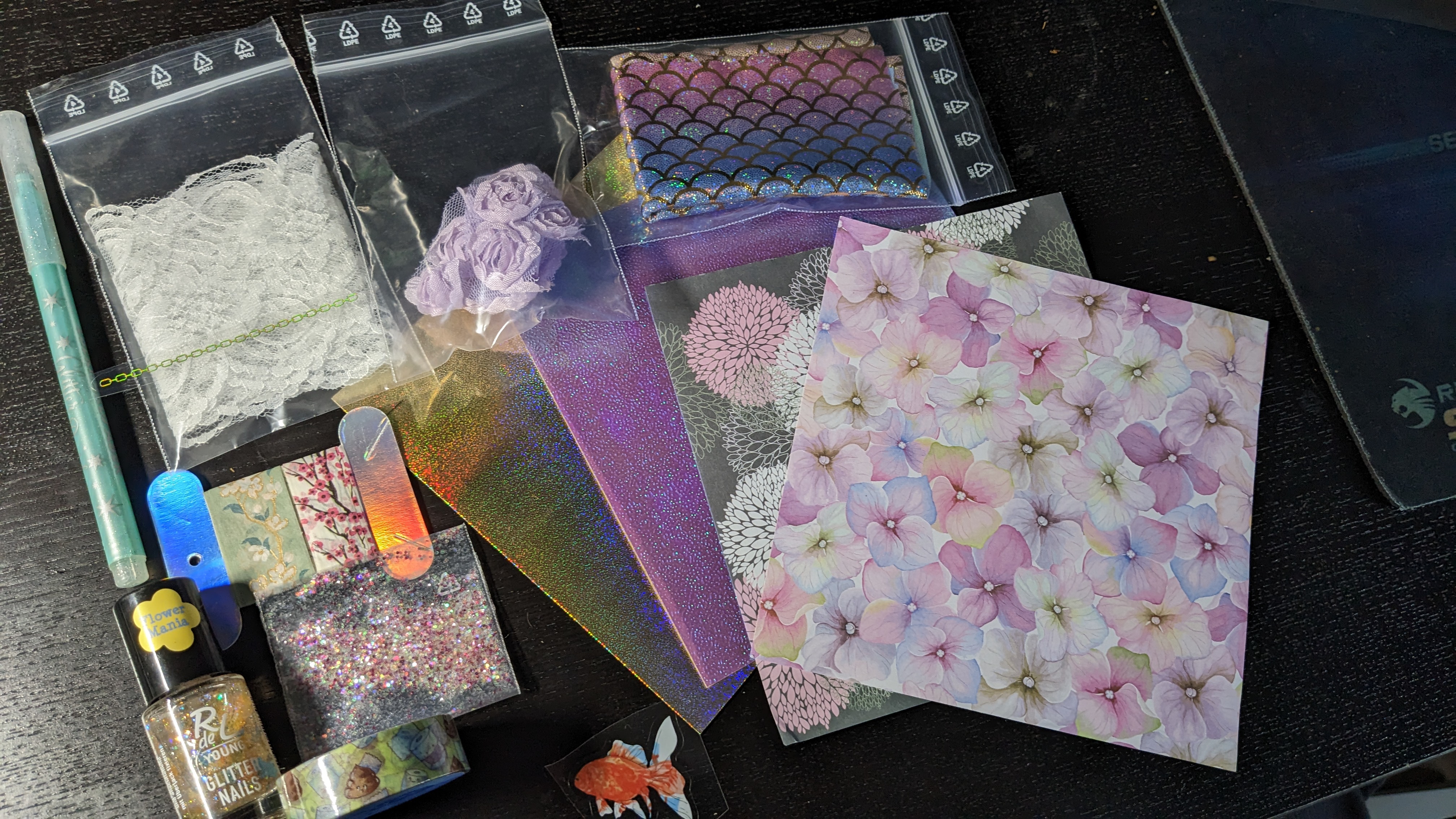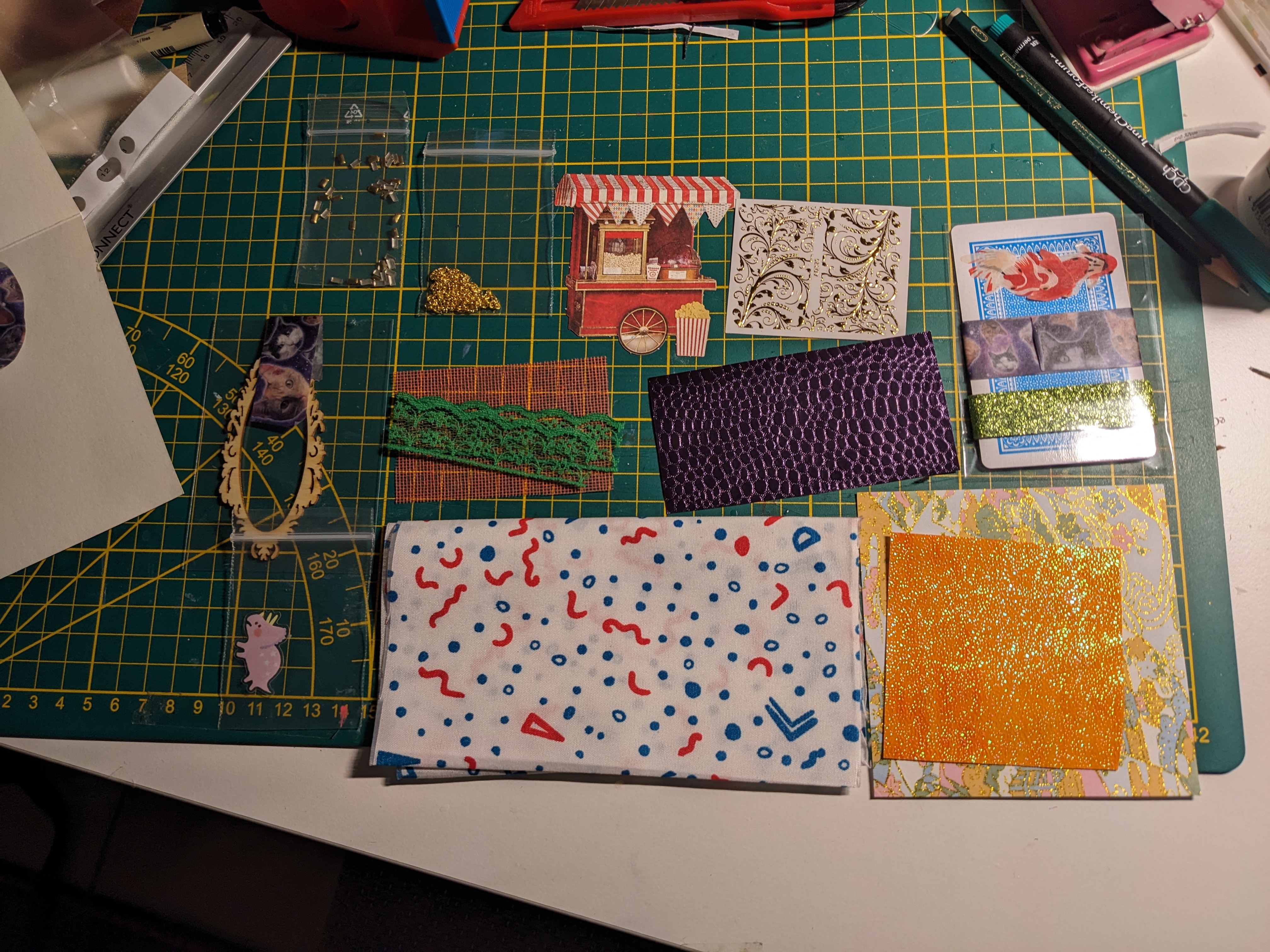 Liebe Wichtelmama @Eleisis, vielen Dank für diese Herausforderung! Glitzer und Stoffe sind tatsächlich nicht meine alltäglichen Materialien für Karten und ich muss krass aus meiner Komfortzone, aber ich werde mein Möglichstes versuchen, alles aus den Materialien herauszuholen! Besonders angetan bin ich aber jetzt schon vom Fischsticker und dem sehr geilen Schuppenstoff! <3