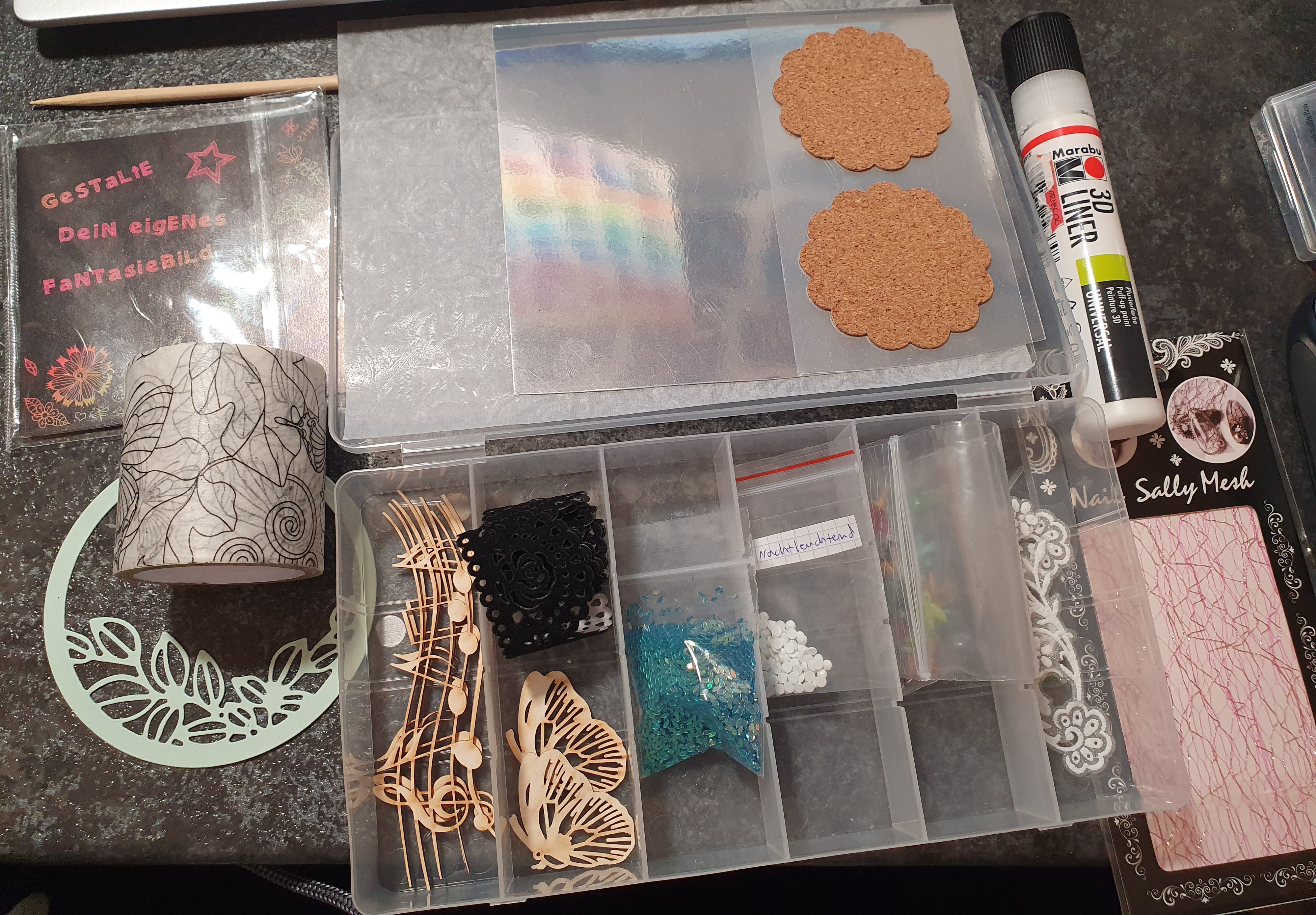 Was ich schonmal sagen kann ist dass definitiv alles glitzern wird was ich so fabriziere :D Ich hab auch schon eine grobe Idee, dafür muss ich aber erstmal was austesten. Ich hab aber mit ein paar Materialien schon rumprobiert, das nachtleuchtende Pulver gefällt mir richtig gut