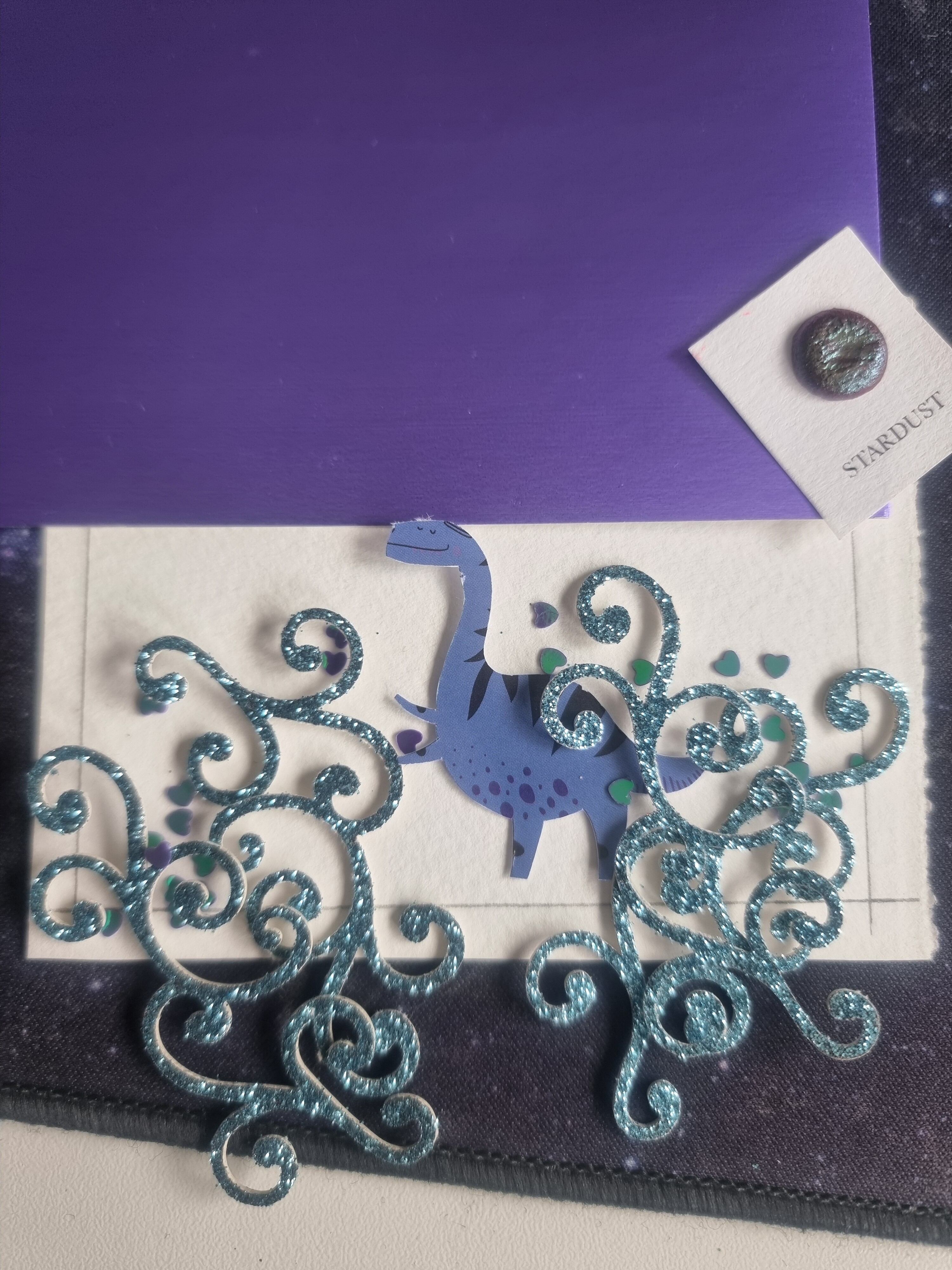 Ein Dino beim Pflücken von kleinen Herzchen-Beeren. Mit Aquarellfarbe und Schimmerpapier wird dann ein Hintergrund gestaltet. Ich denke an einen fancy lila Himmel mit Wolken und eine kraterige Landschaft (woooow, so etwas habe ich ja noch nie gemacht :o)