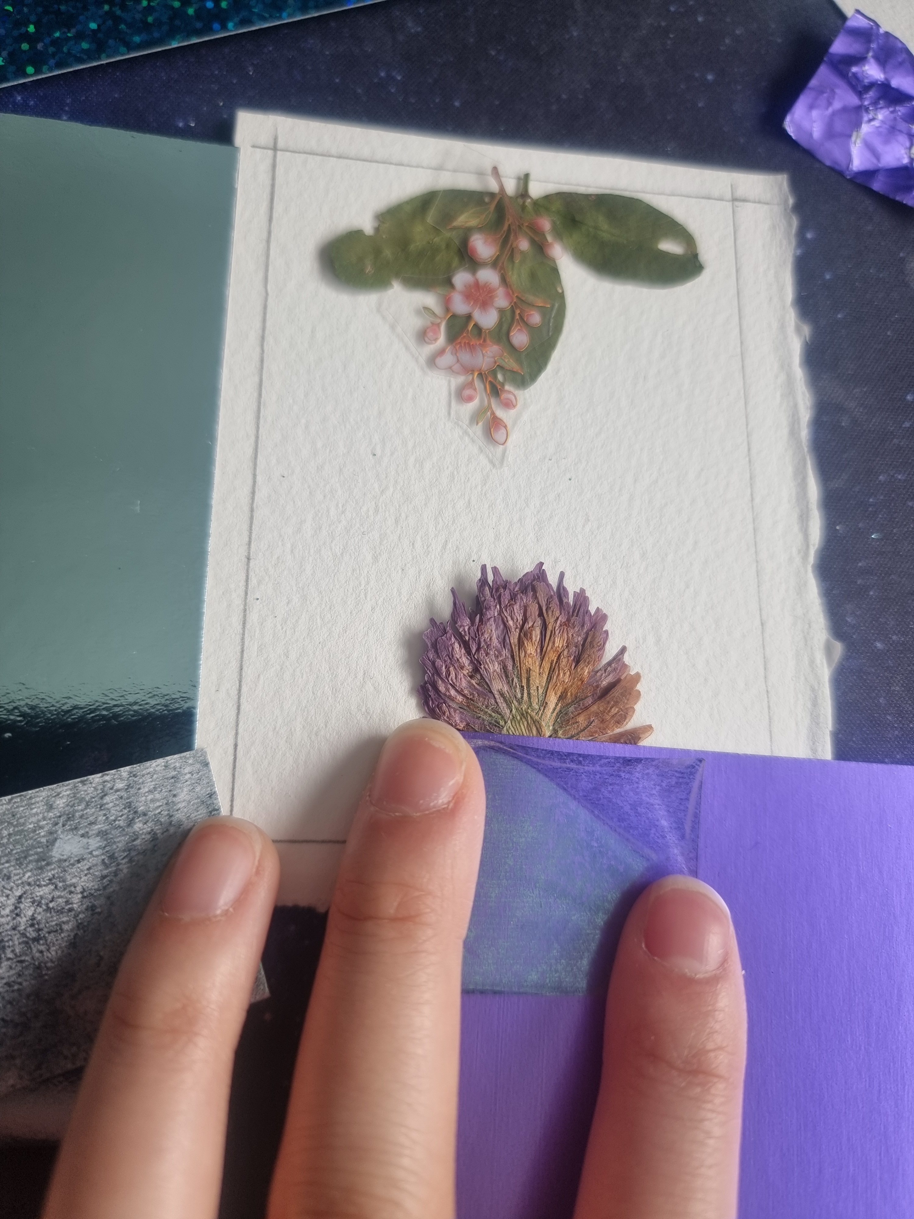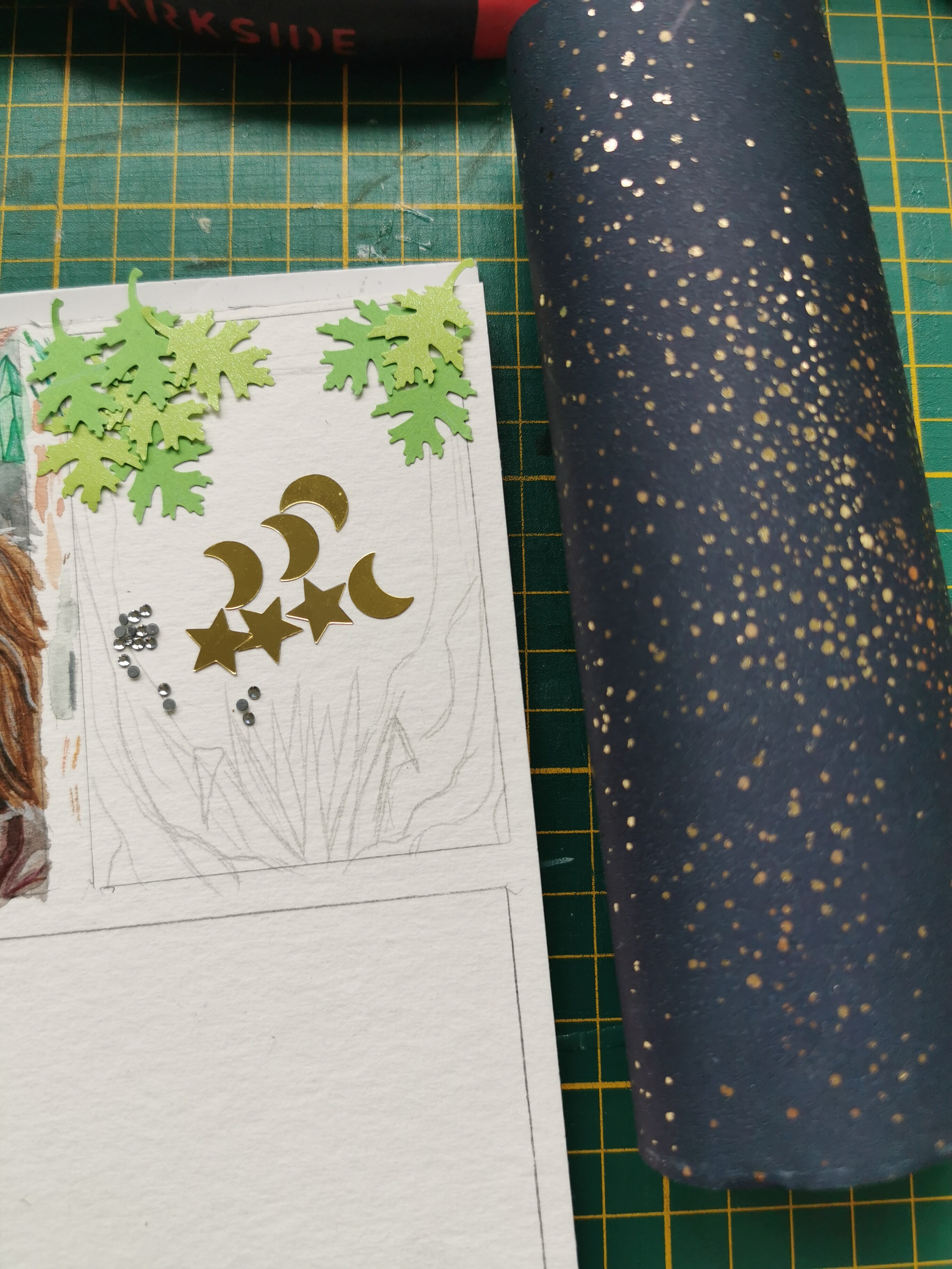 Ich habe die letzte Karte auch angefangen, sie währe aber wahrscheinlich so zu simpel? Das Papier rechts soll der Hintergrund werden und bekommt noch etwas weiß für Mondschein, die kleinen Sterne/Monde/Glitzersteine werden Schüttelmaterial und den Vordergrund erkennt man denke ich soweit (Bei den Blättern kommen noch gezeichnete Blätter dazu in den Hintergrund).