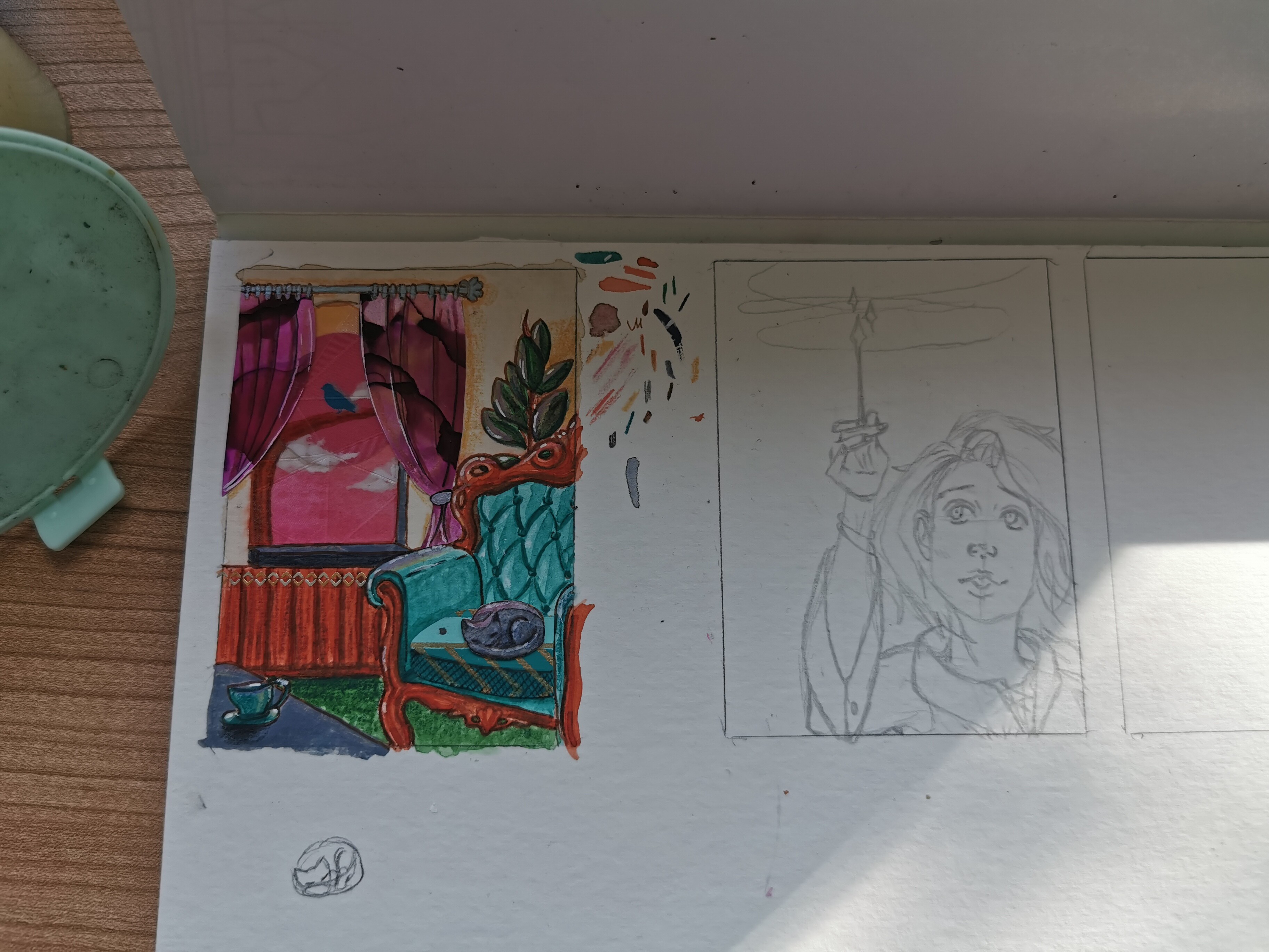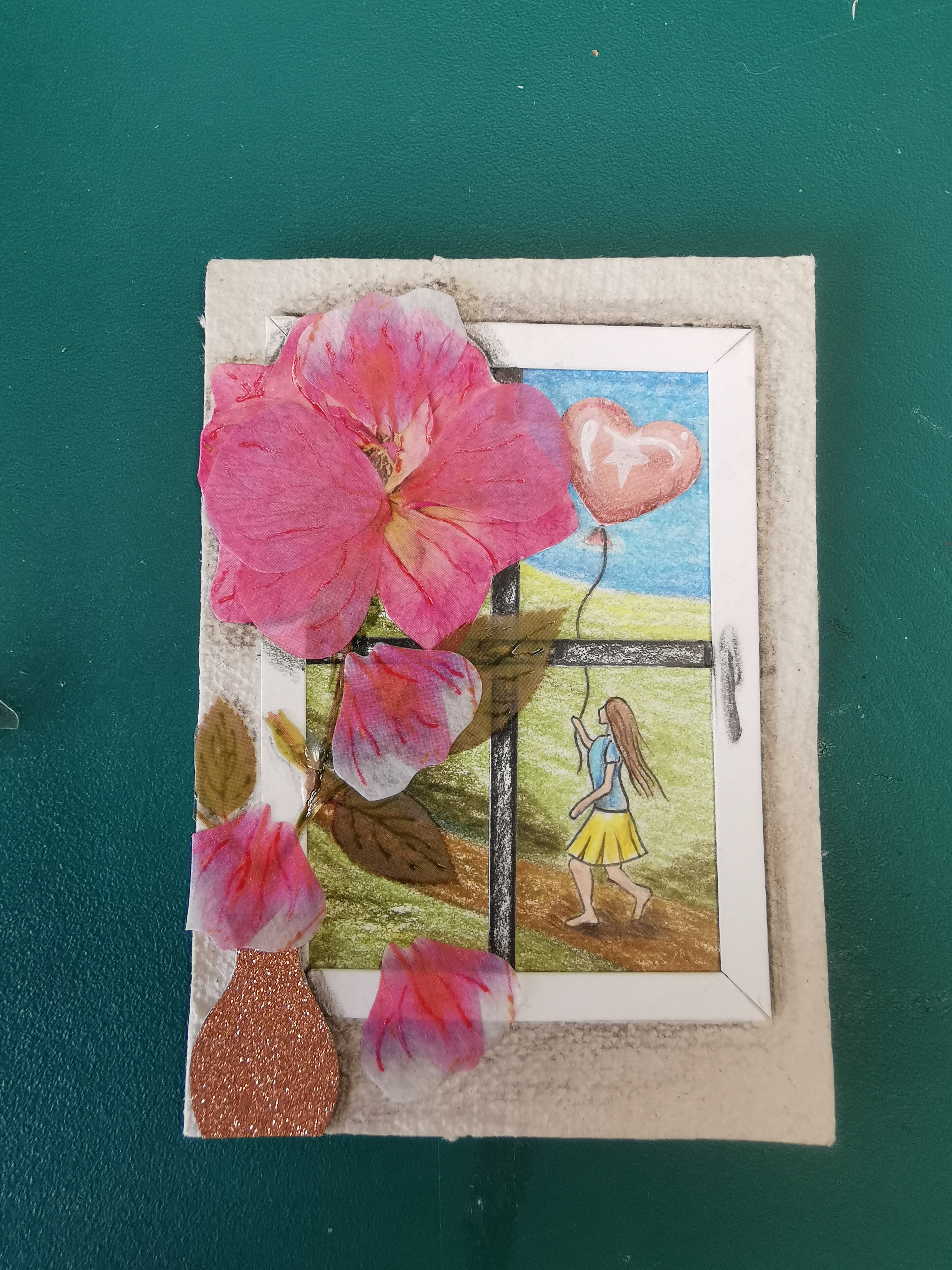 Bei der Fensterkarte würden denke ich ein paar mehr Schatten echt helfen, die Ebenen zu verbinden. Um den Fensterrahmen herum würde ich noch n feinen Schatten setzen, um die Dicke des Rahmens zu zeigen, und wenn die Blume und Vase einen Schatten auf Rahmen und Wand werfen, dann kommt noch klarer raus, dass das alles zusammen gehört. Oh, und unter dem Mädchen braucht’s noch n Schatten!