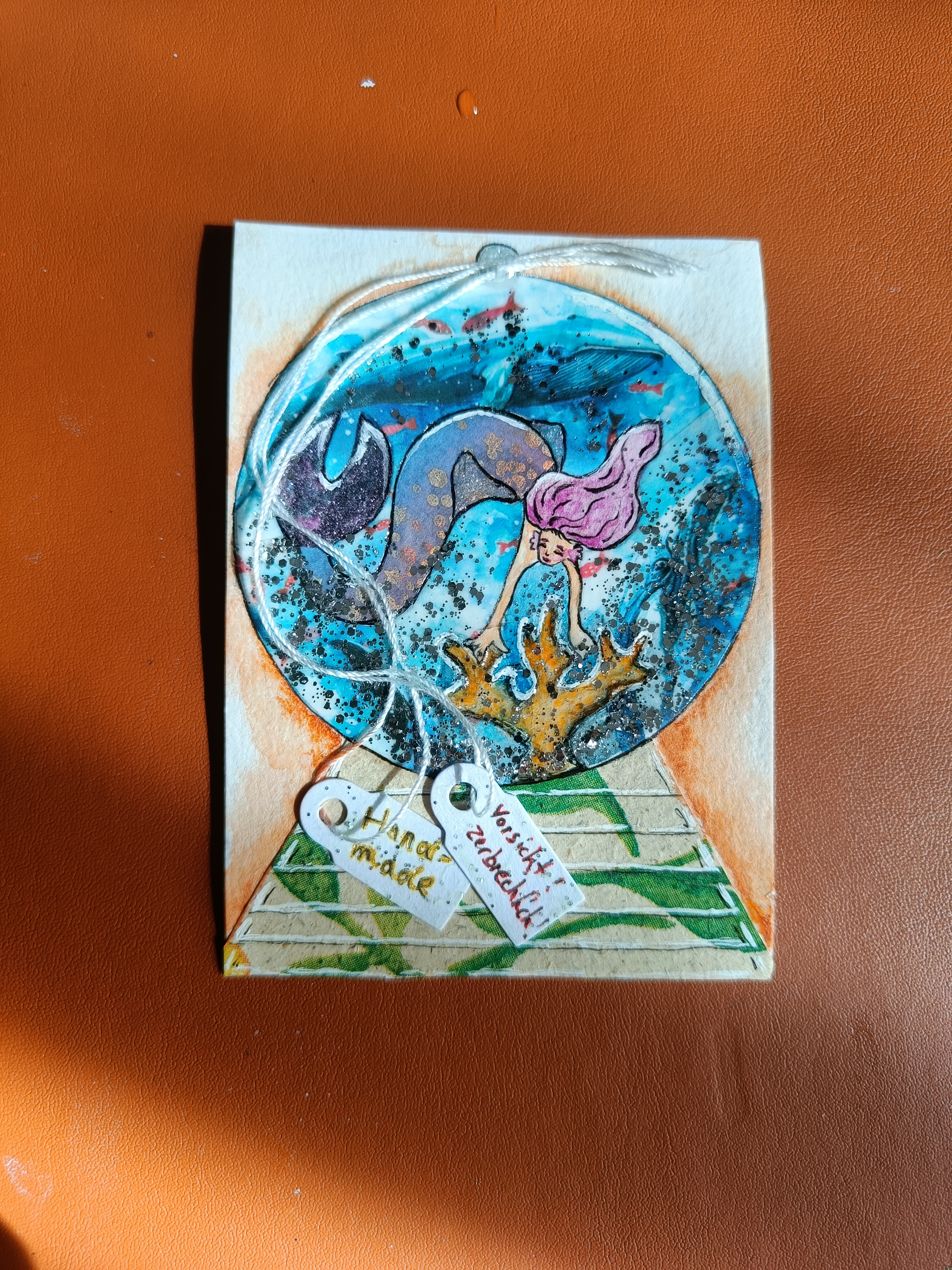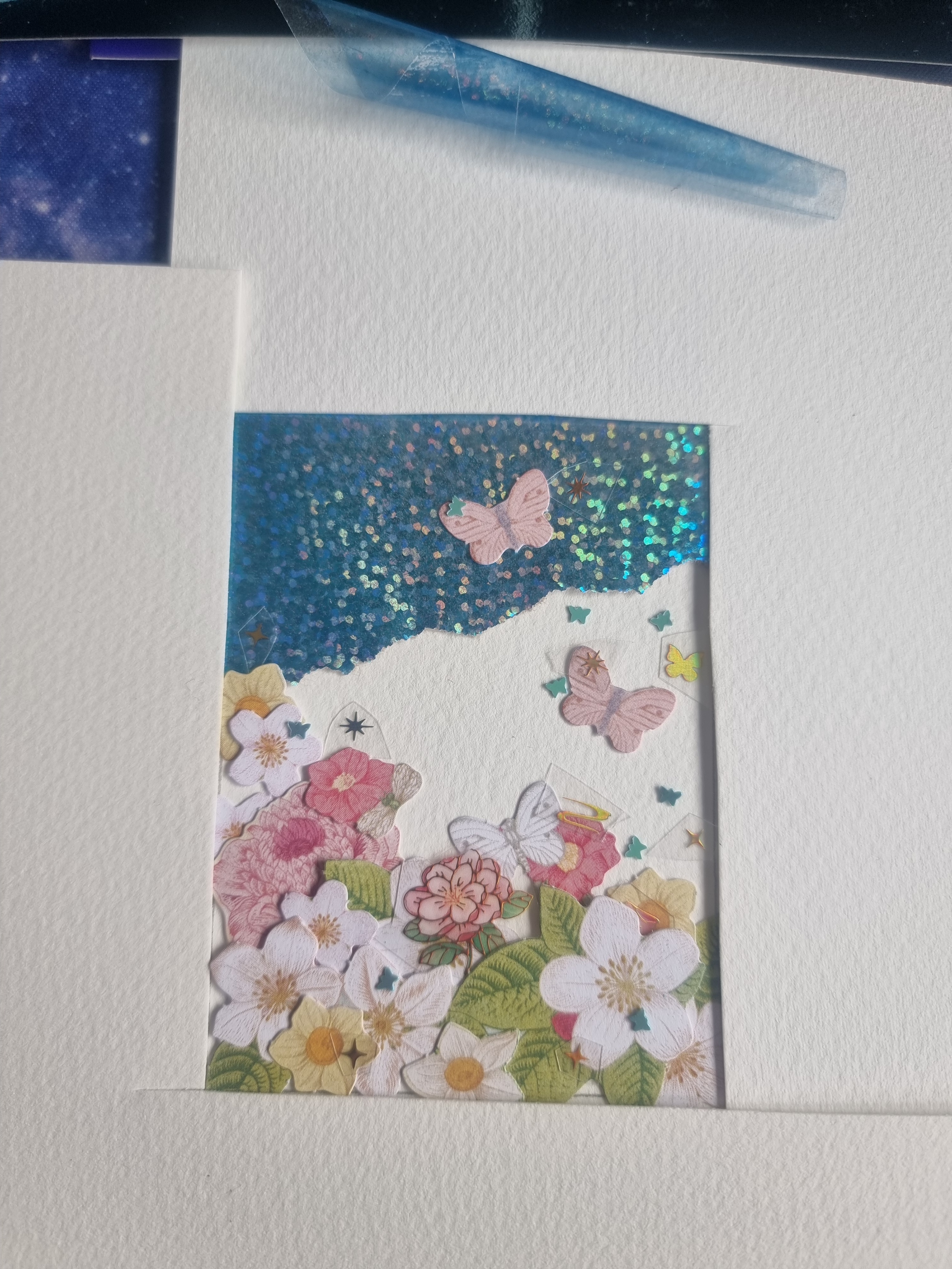Ich habe vom Glitzerpapier die Folie abgezogen und werde es noch bearbeiten, sodass mehr Verlauf entsteht. Eventuell wird daraus eine Schüttelkarte, mit den kleinen Schmetterlingen als Schüttelmaterial. Hab schon ewig keine mehr gemacht.