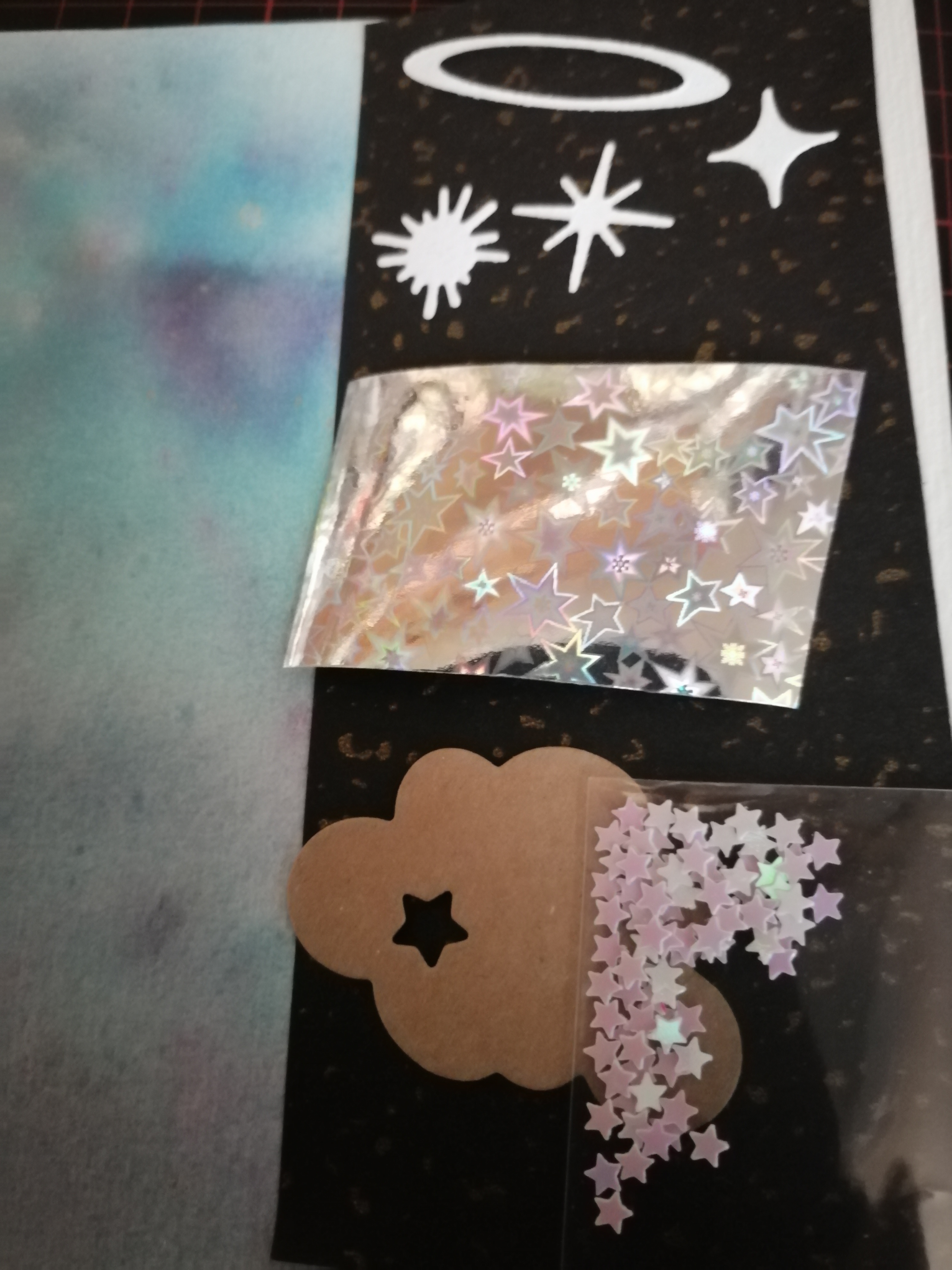 Die beiden kleineren Blasen haben keine Szene, sondern nur einzelne Objekte (Herz bzw. Blume) drin, weil für mehr auf den Miniblasen kein Platz war. Wenn ihr diese Blasen langweilig findet, gebt bitte kurz Bescheid. Es gäbe sowohl die Möglichkeit sie ganz wegzulassen als auch etwas nur gemaltes statt etwas gebastelten reinzulegen. Bei der Blume oben bin ich noch am Überlegen noch einen weißen inneren Kreis reinzumalen, wie es mit Blau bzw. Lila auch bei den beim Delfin und Diskokreis der Fall ist.