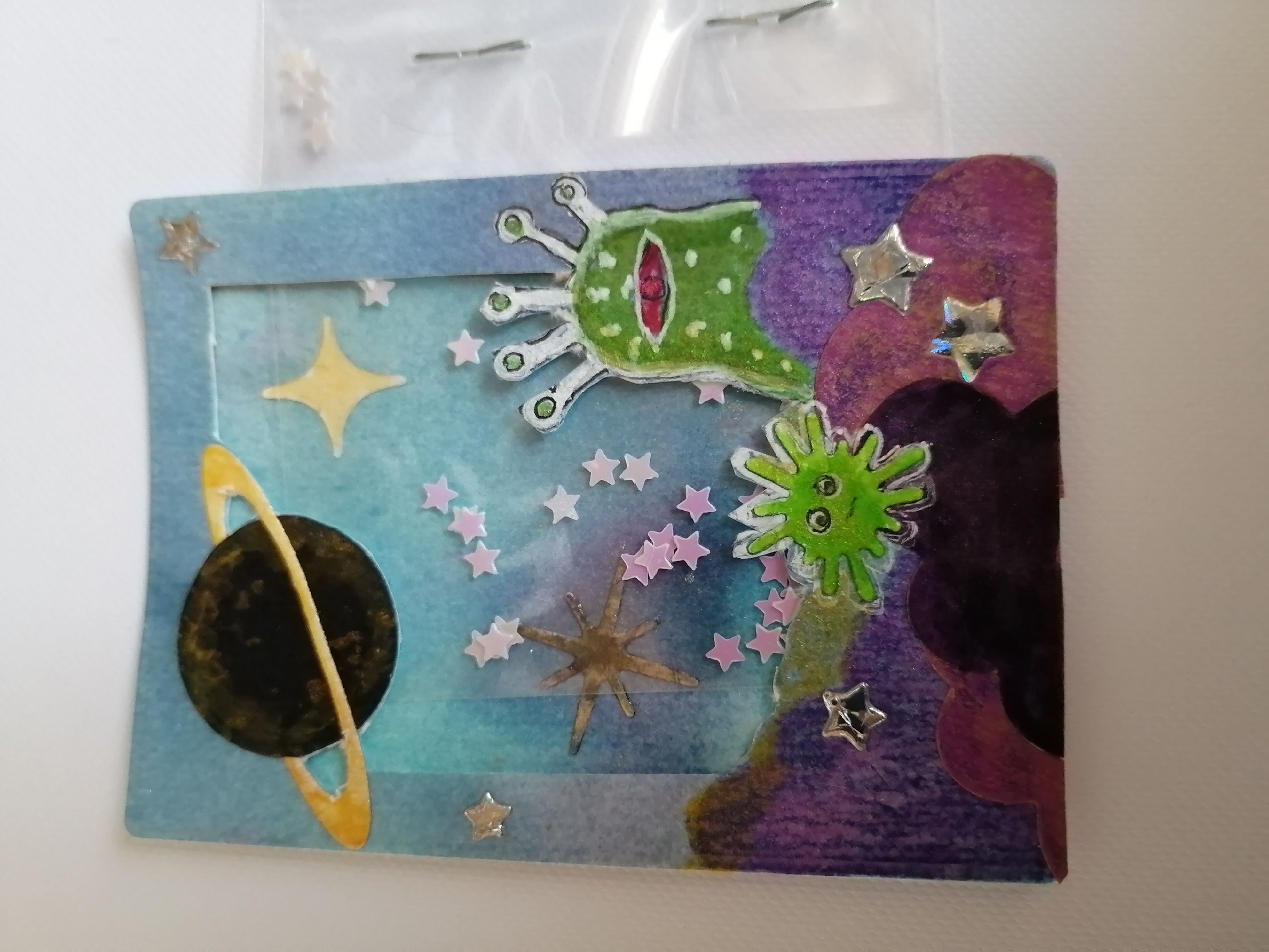 Ich bin heute mit dem Bastelanteil meiner ersten Karte durchgekommen. Bevor ich mich an die Kolorierung vom Mädchen mache, würde ich gerne kurz Feedback haben, ob die Blasen so passen (denn ich muss ja wissen wie viele Blasen welcher Größe es am Ende werden, bevor ich die Haare darum anordnen kann):
