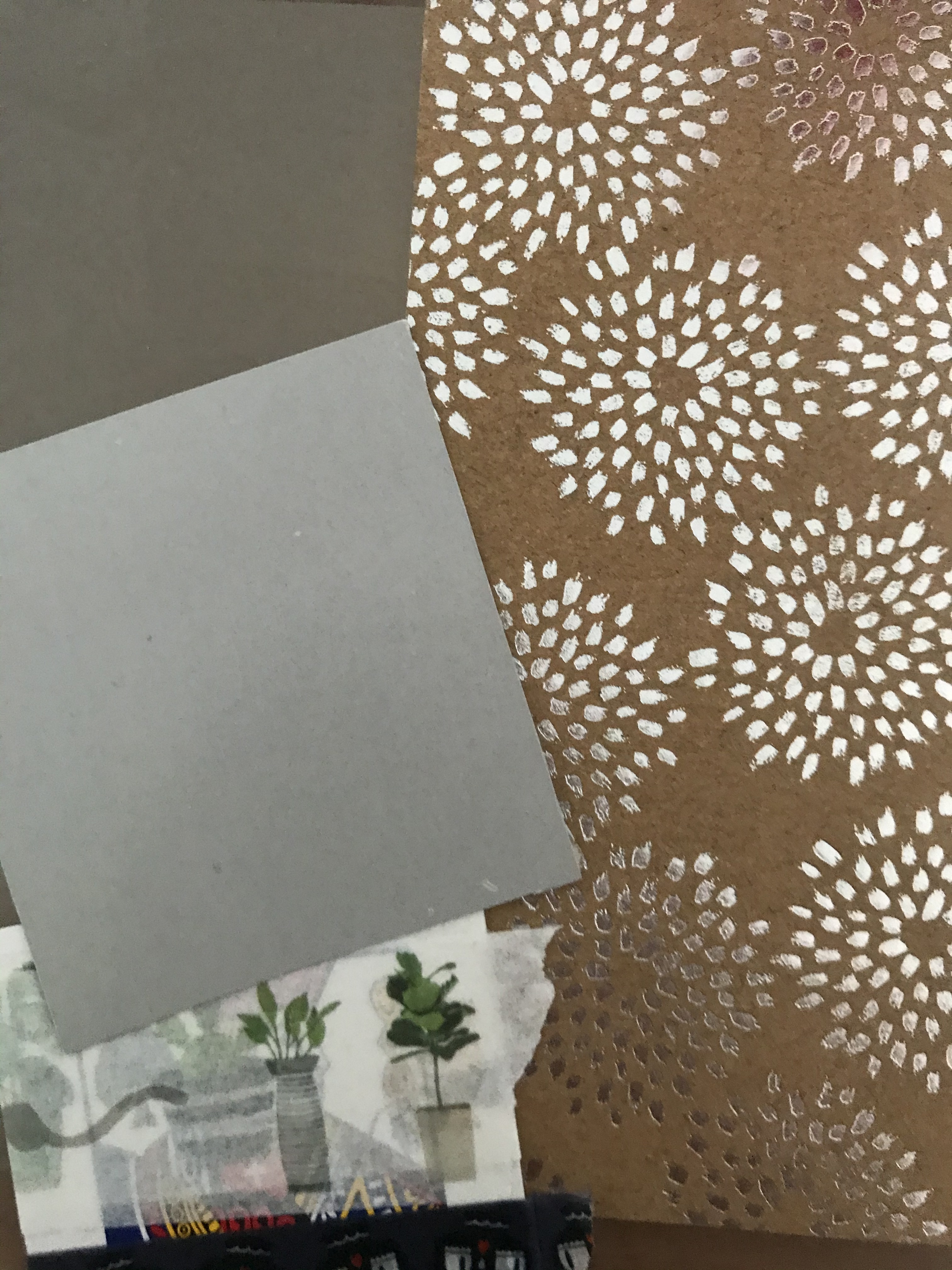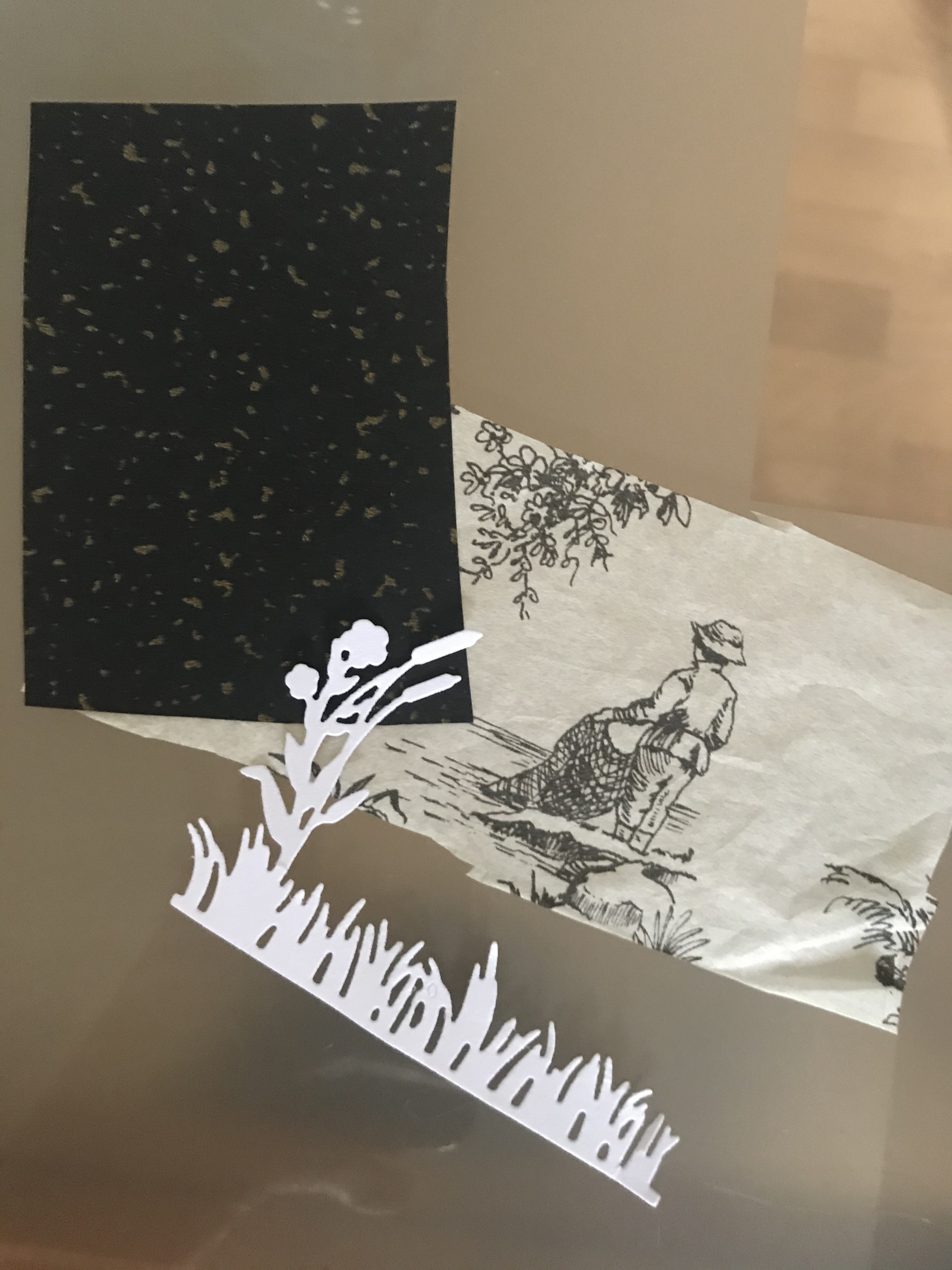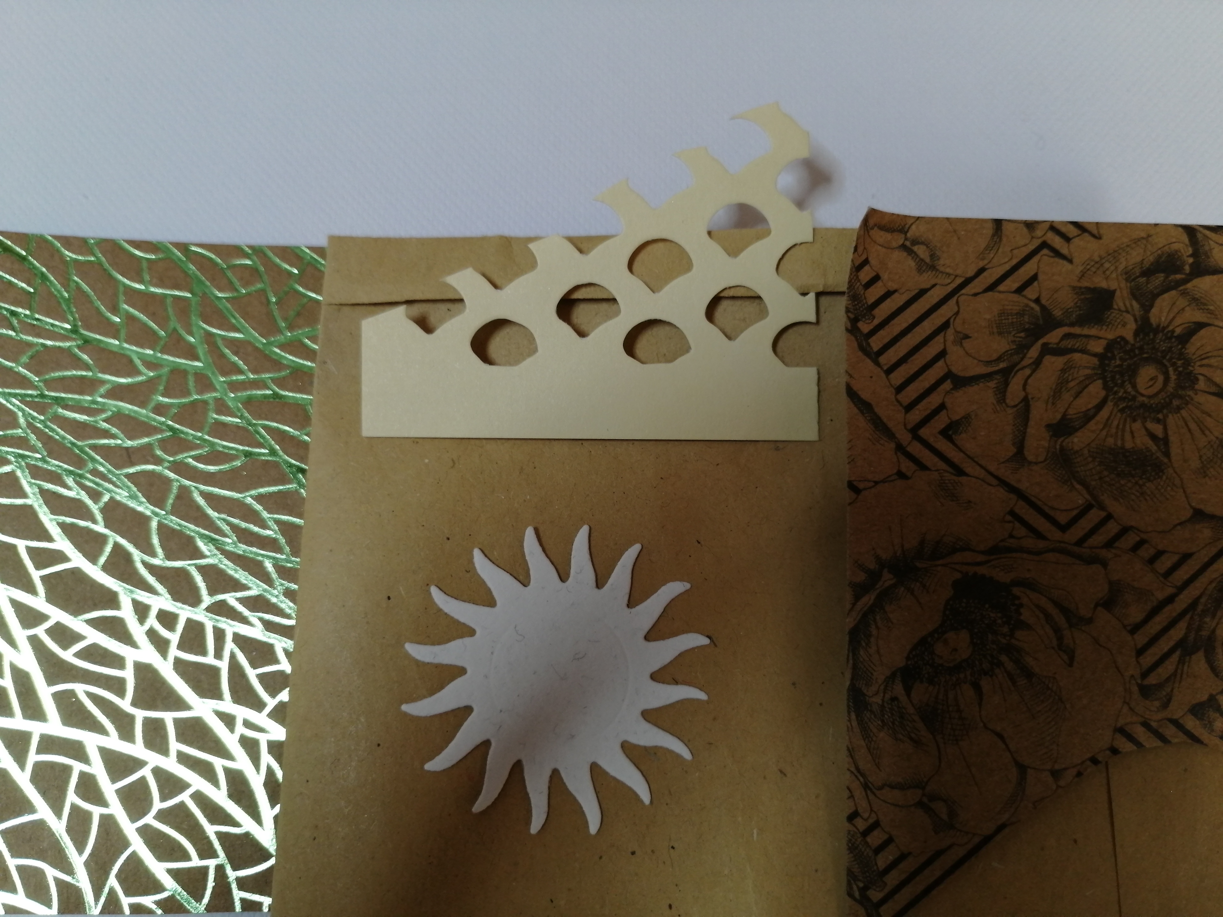 - Das türkise Motivpapier würde ich so versuchen einzufärben, dass es wie eine hügellandschaft wirkt.