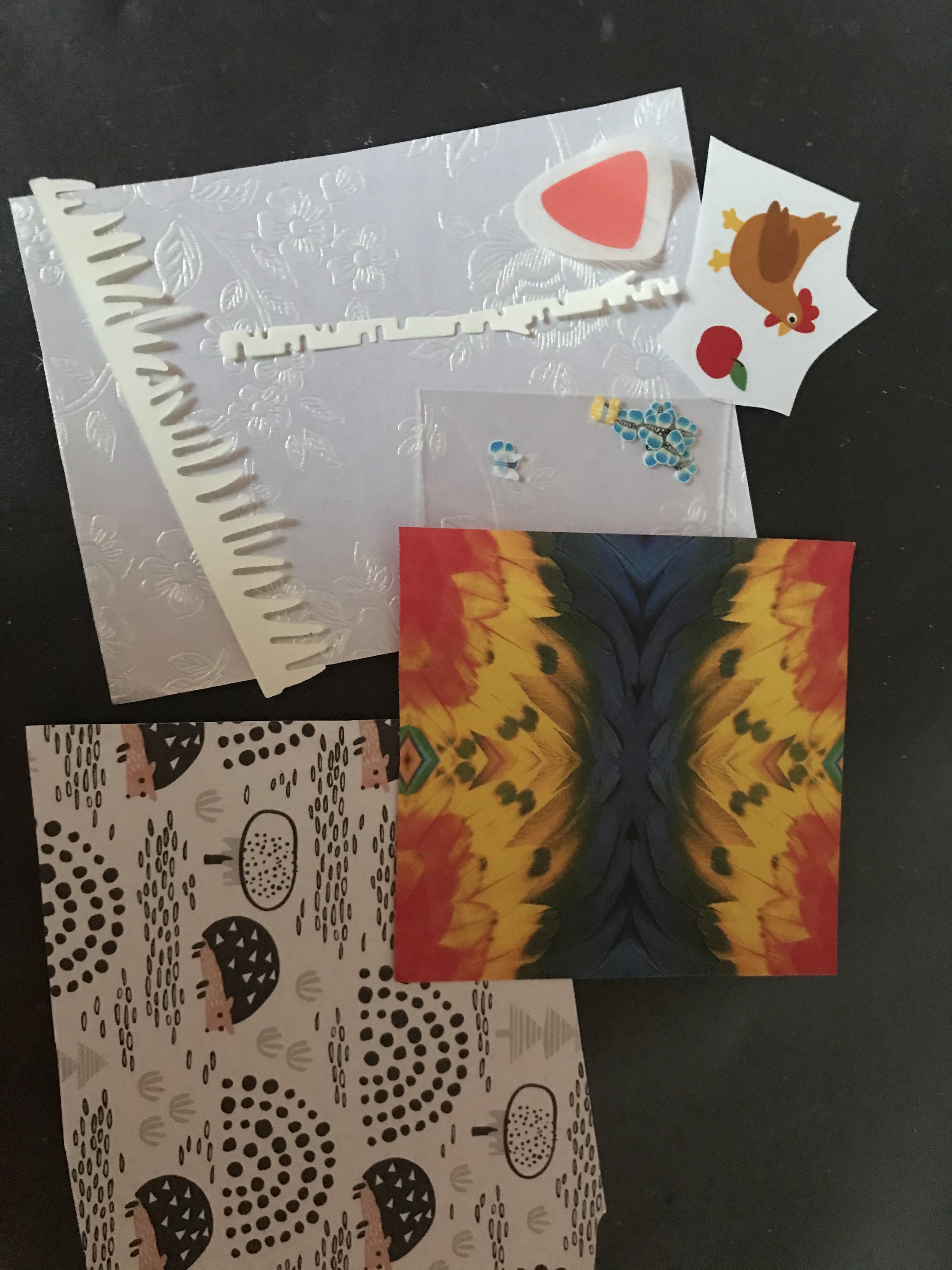 hier noch meine Material Auswahl für das Häschen ,in der Mitte ein Teil der Versandtasche .