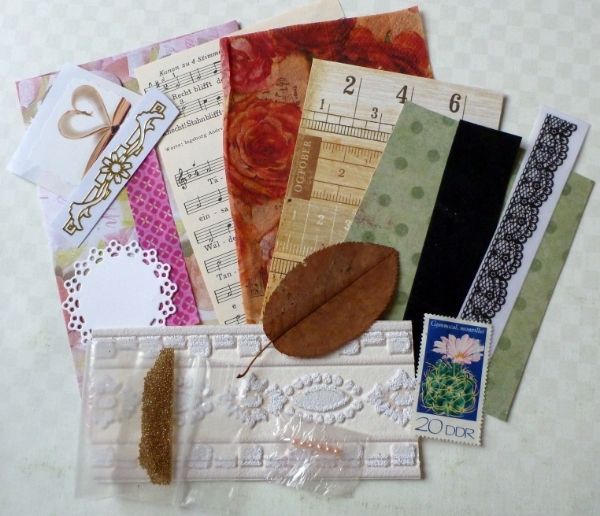 links: 2 Motivpapiere, 1 Zeitungsartikel, 1 Stöffchen, 1 Washitape