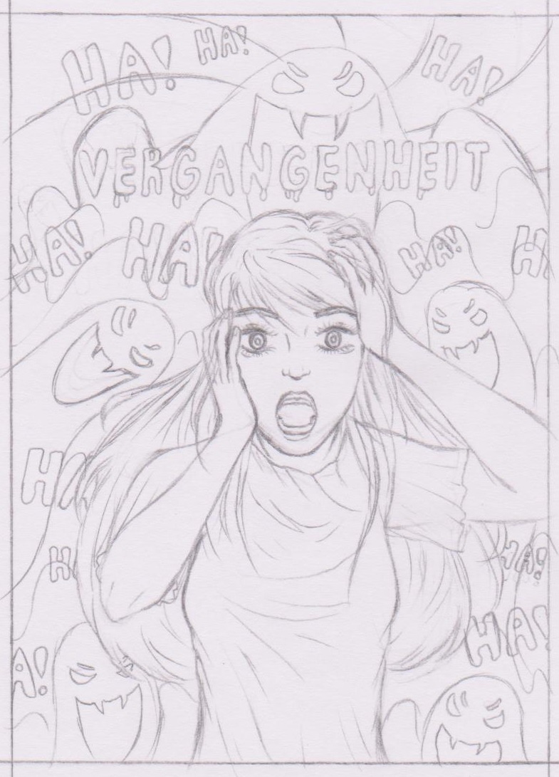 Mit dem Motiv wollte ich sinnbildlich darstellen, dass manche Menschen sich immer noch nicht von den schlechten Ereignissen aus ihrer Vergangenheit lösen können und davon geplagt werden bzw. immer wieder an die alten Zeiten zurückdenken müssen, die damals nicht gut waren, sodass sie nicht im Hier und Jetzt bzw. in der Zukunft leben können. Die Vergangenheit wird hier daher als dämonischer Schatten dargestellt, der das Mädchen auch ganz fies auslacht, um sie zu quälen. Bei manchen Menschen ist es ja wirklich so, dass sie sich bestimmte Dinge aus der Vergangenheit nicht verzeihen können oder etwas Schlimmes erlebt haben, was sie nicht verarbeiten können. Also diese Leute können sozusagen die vergangene Zeit nicht hinter sich lassen. Ich persönlich habe nicht solch ein Problem, aber ich kenne viele, denen es so geht und daher wollte ich mal ein Motiv zu solch einer Situation zeichnen.