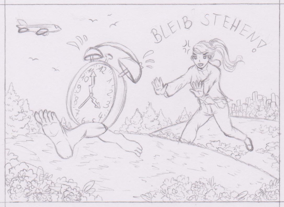 Bei dem Motiv möchte ich den Hintergrund nicht so viel lienen (daher ist die Skizze auch schlichter), weil ich sonst das Gefühl habe, dass das Mädchen und der Wecken sonst untergehen würden, da sie (das Mädchen und der Wecker) ja nunmal die Aussage des Motives verkörpern. Die meisten Details werde ich deswegen nachher erst bei der Coloration einfügen (also ich möchte im Prinzip, dass die Details im Hintergrund weicher aussehen, damit sie dem Mädchen und dem Wecker nicht die Show stehlen, daher werden sie nur mit Farbe gestaltet und nicht gelined).