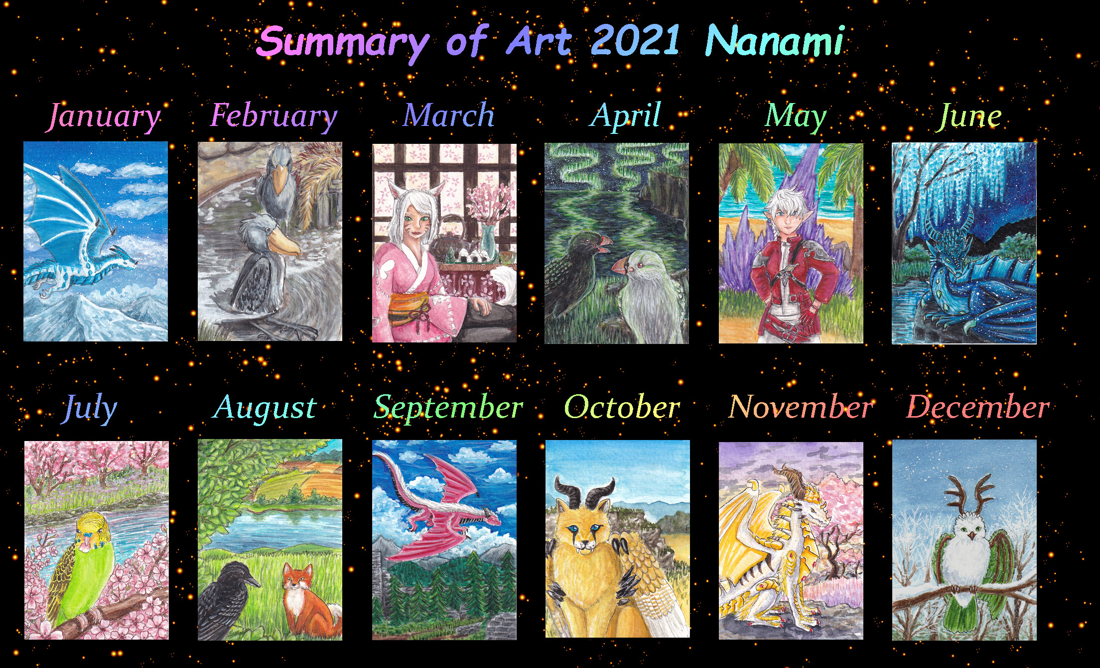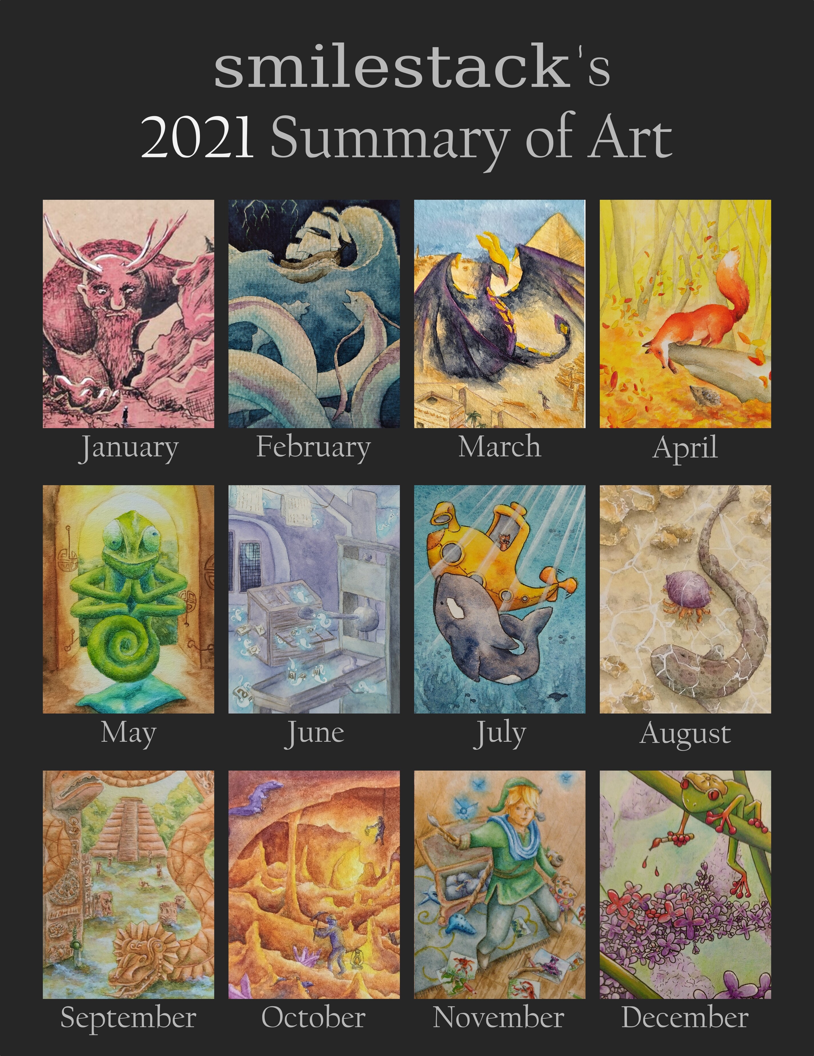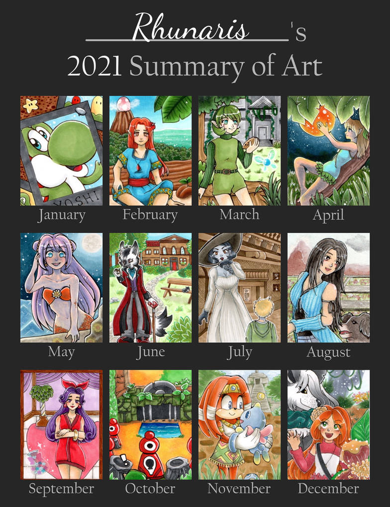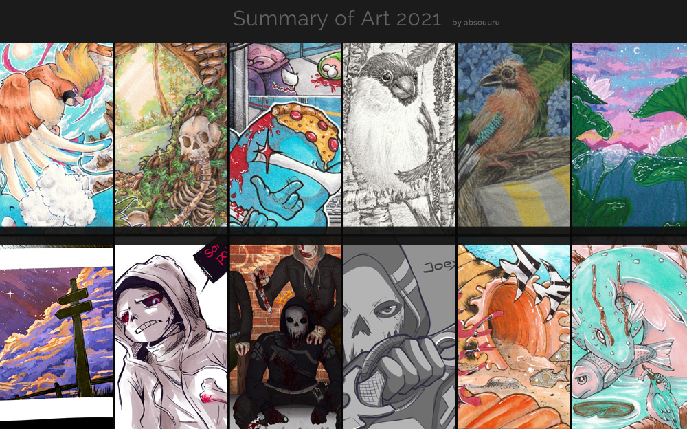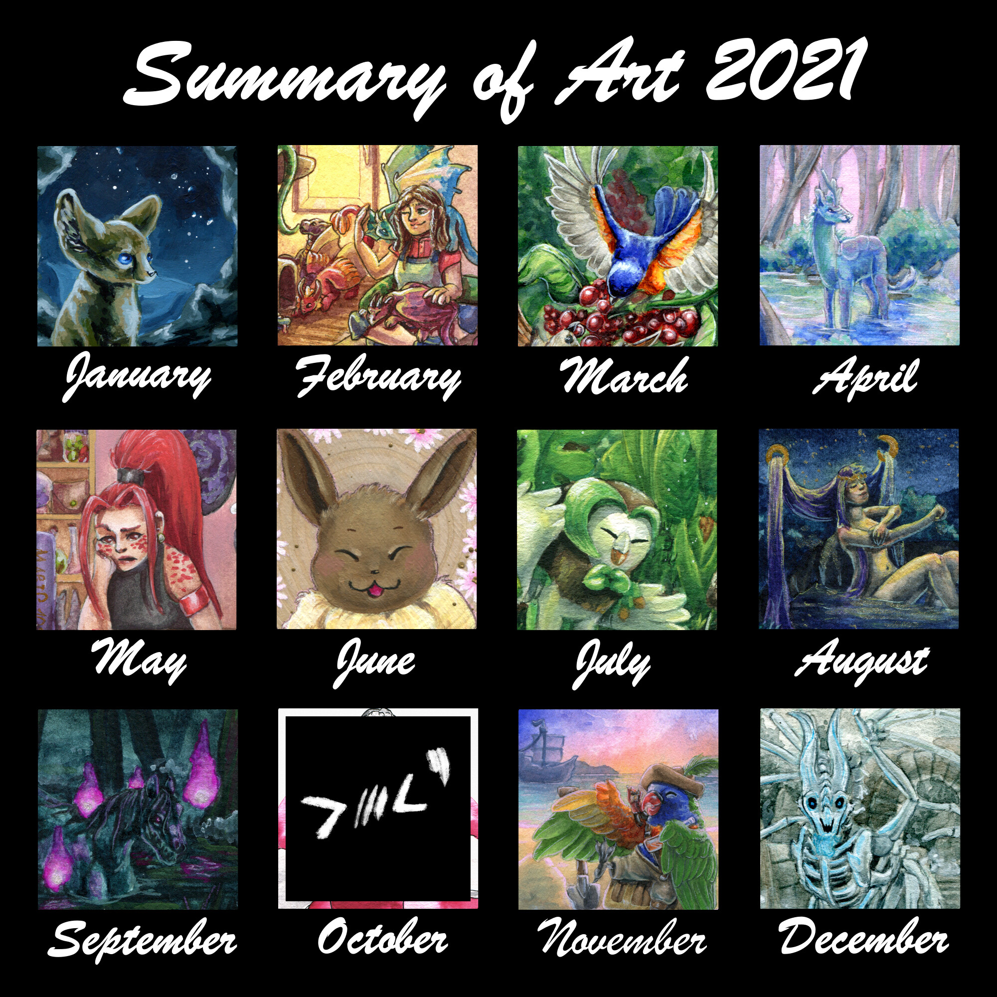 Mein Beitrag für den Luma Halloween-Wettbewerb mit dem ich den zweiten Platz belegt habe >//U//<) bedeuten mir sehr viel. Ansonsten freue ich mich, dass ich dieses Jahr auch viel digital gezeichnet habe, mich an Themen wagte die mir noch schwer fallen (wie tiefe Schatten in Aquarell, zu sehen im